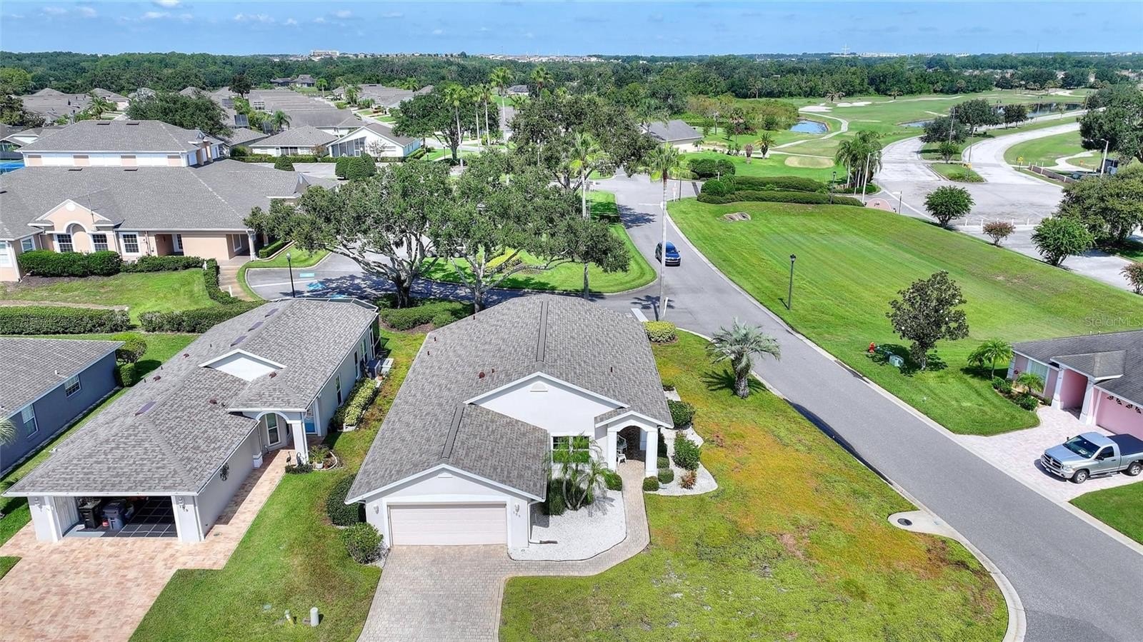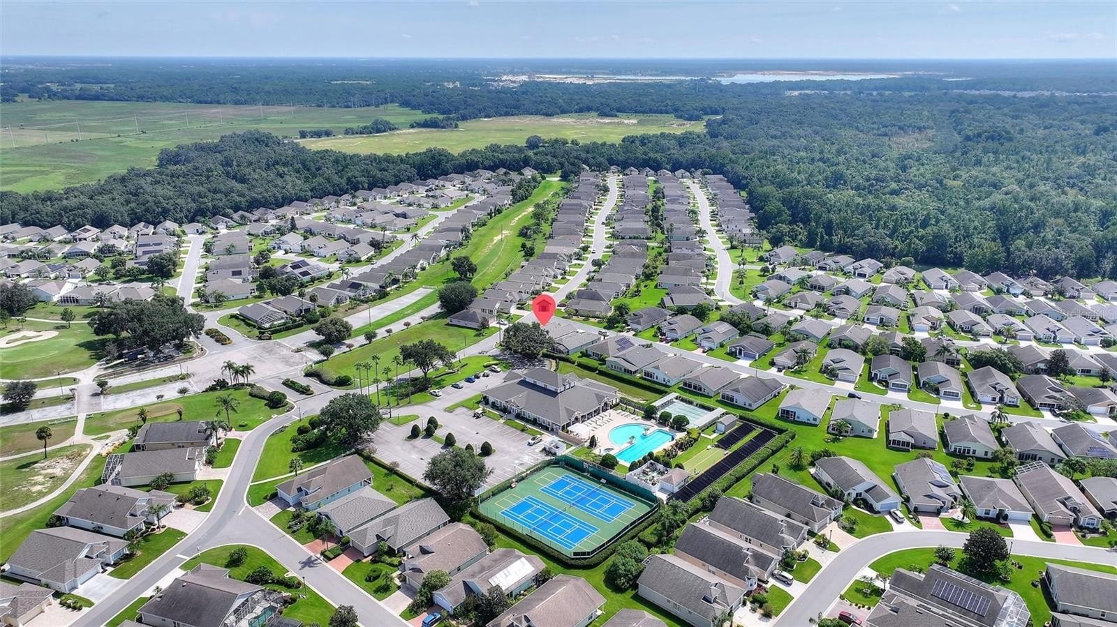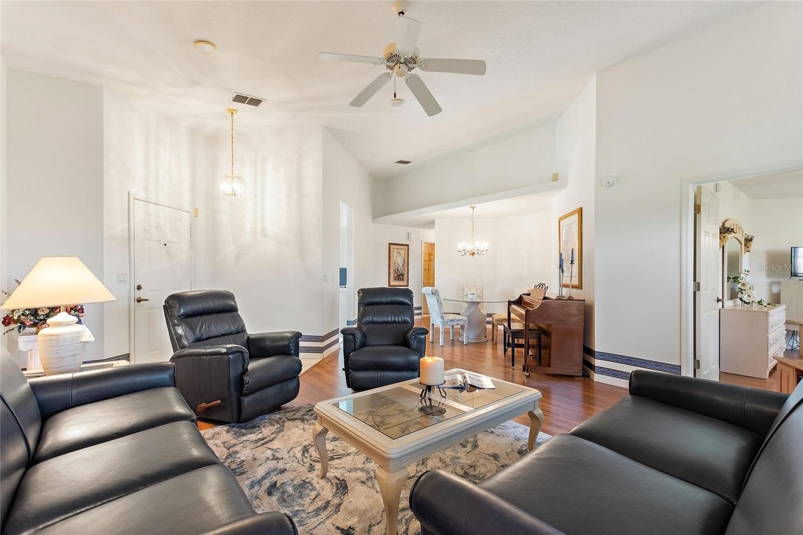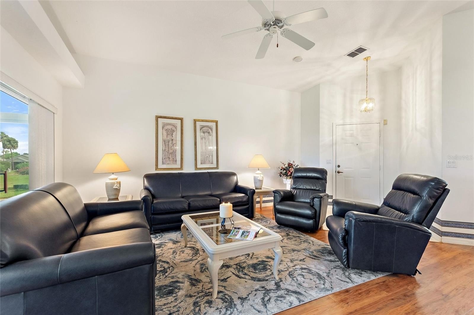 One or more photo(s) has been virtually staged. Partially-furnished RidgeMont 2 Bedroom / 2 Bath / Office model on 1-floor in Gated 55+ Community with 2025 Roof & Water Heater, Solid Surface Floors throughout, newer HVAC & Replacement Windows, located next-door to High Vista's private clubhouse and outdoor amenity center. Brick paver driveway and walkway to a charming portico entry with full-view storm door enters a vaulted-ceiling great room with a wall of patio windows to an enclosed west-facing lanai. Eat-in kitchen in front of house has white cabinets & countertops, large closet pantry and a newer stainless-steel refrigerator. Utility sink and stackable washer/dryer in corridor laundry area. Primary bedroom has private bath within 13x6 walk-in-closet, dual sink vanity, soaking tub, linen closet and shower. Guest bedroom and office share a full bath and large linen closet in this split bedroom floor plan. Quality top-down/bottom-up blinds throughout interior. 2-car garage has insulated garage door with opener & keypad entry and electric screen door. Well for Irrigation. Roof and Water Heater replaced 2025; HVAC replaced 2022; many windows replaced 2019. Newer smoke detectors. Sold As-Is. Ridgewood Lakes is a golf cart friendly community. $230 monthly High Vista HOA fee includes Spectrum internet and basic cable TV with 2 cable boxes, lawn mowing and exclusive access to resident-owned 12,000 SF private High Vista clubhouse and amenities. $425 semi-annual Ridgewood Lakes HOA fee provides 24x7 staffed security gate and master association-owned private road maintenance. Adjacent to 18-hole White Heron Golf Club with restaurant, privately owned and open to the public. High Vista is a 55+ community with outdoor heated pool and spa, fitness center, library, pub & many organized activities. Pickle ball, tennis, bocce and shuffleboard courts. Miles of biking and walking trails within Ridgewood Lakes gated community. Shopping, Disney, Universal, Orlando & Central FL entertainment nearby, easy access to I-4, medical facilities, airports & Sunrail Station. Advent Health hospital is 3 miles away.