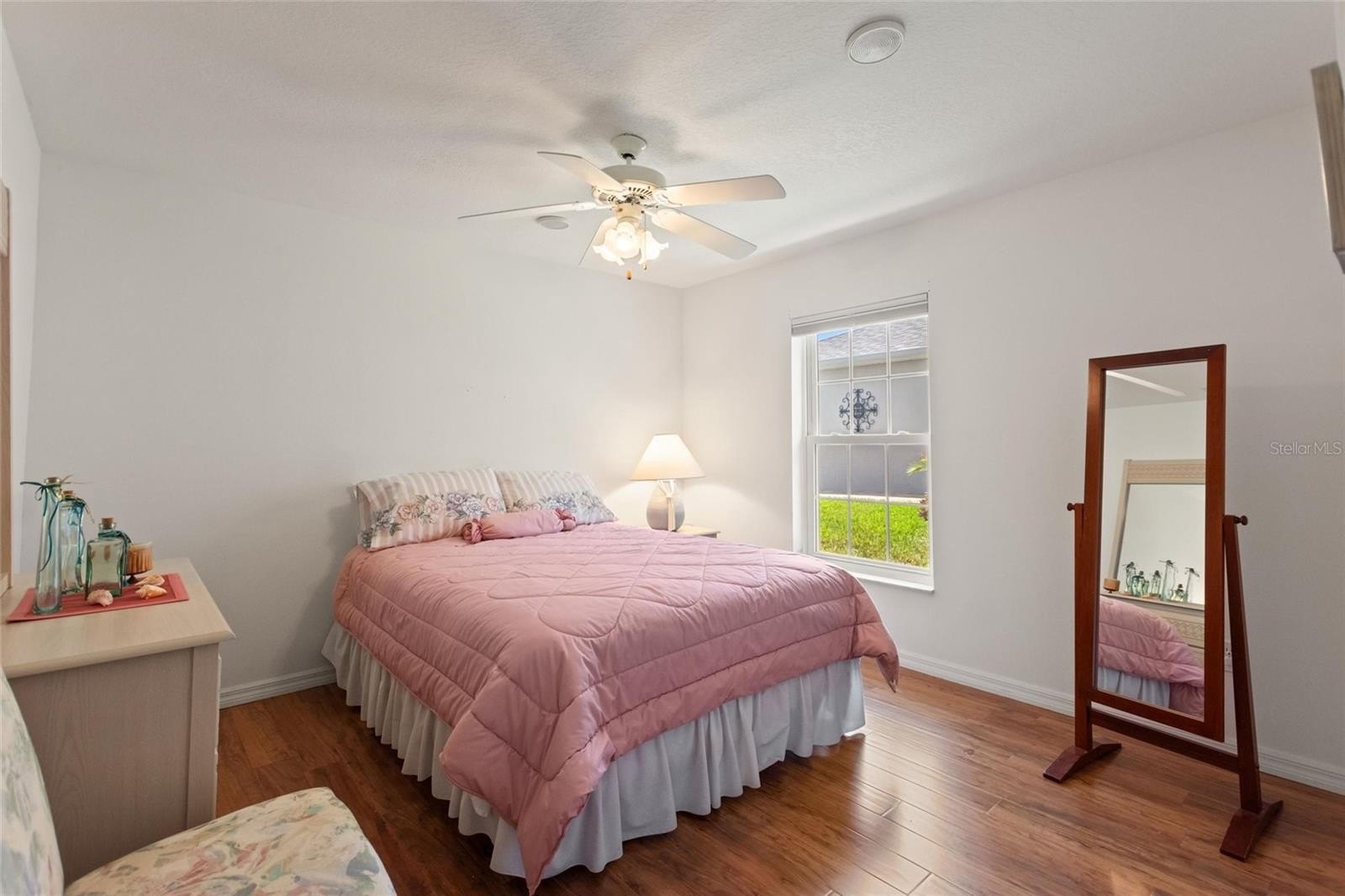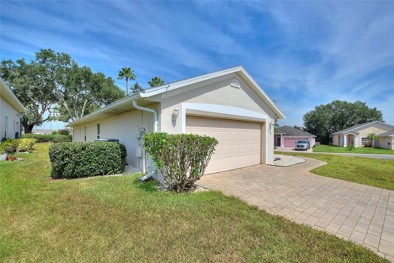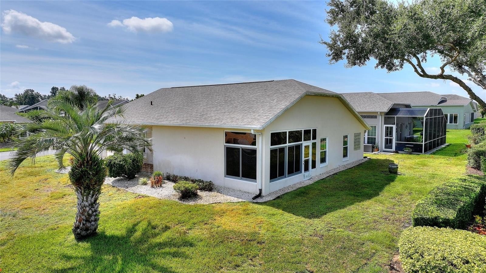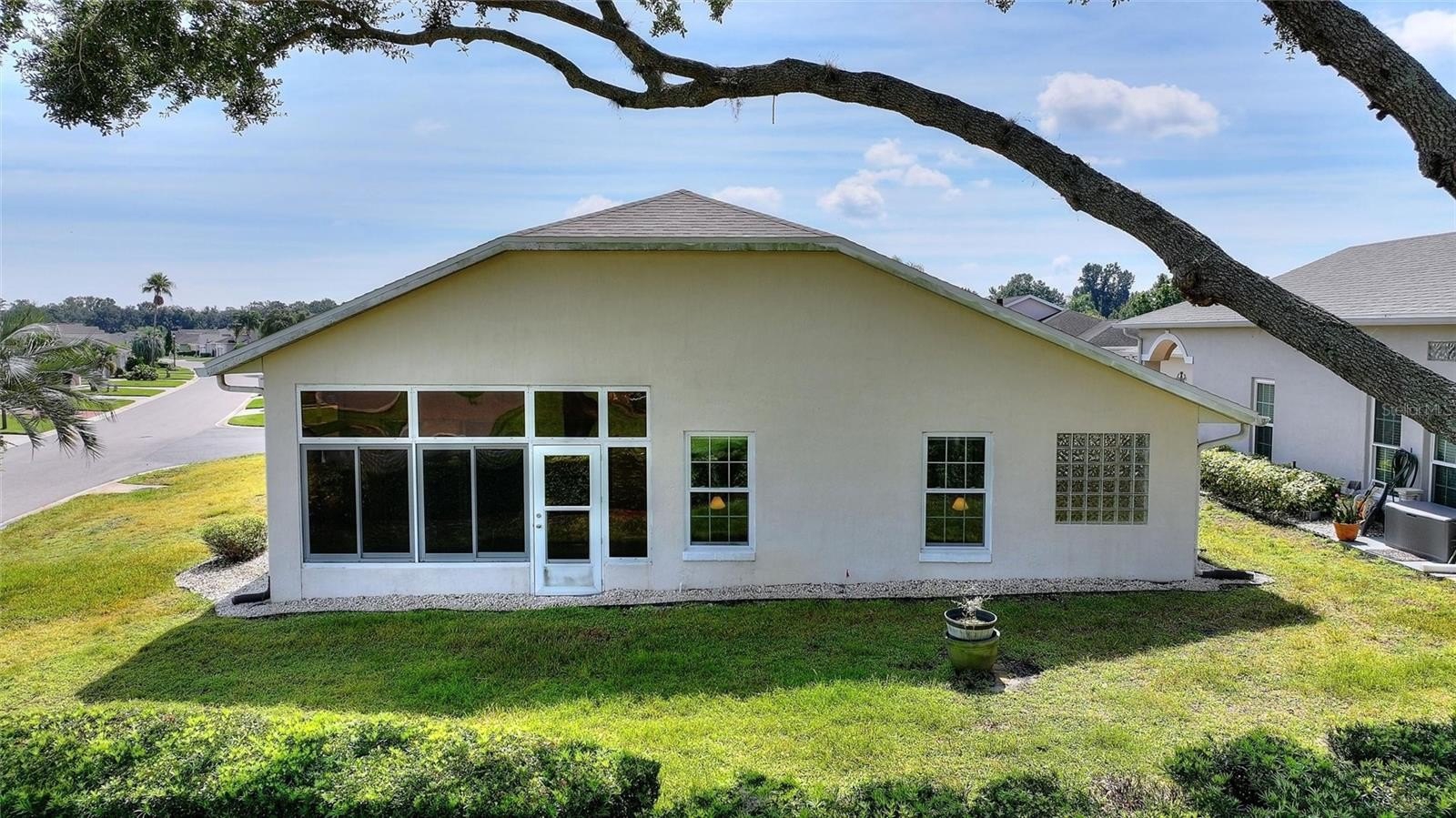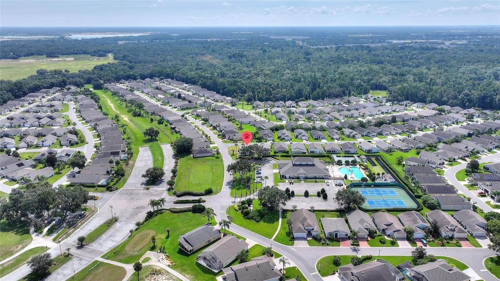 One or more photo(s) has been virtually staged. Partially-furnished RidgeMont 2 Bedroom / 2 Bath / Office model on 1-floor in Gated 55+ Community with 2025 Roof & Water Heater, Solid Surface Floors throughout, newer HVAC & Replacement Windows, located next-door to High Vista's private clubhouse and outdoor amenity center. Brick paver driveway and walkway to a charming portico entry with full-view storm door enters a vaulted-ceiling great room with a wall of patio windows to an enclosed west-facing lanai. Eat-in kitchen in front of house has white cabinets & countertops, large closet pantry and a newer stainless-steel refrigerator. Utility sink and stackable washer/dryer in corridor laundry area. Primary bedroom has private bath within 13x6 walk-in-closet, dual sink vanity, soaking tub, linen closet and shower. Guest bedroom and office share a full bath and large linen closet in this split bedroom floor plan. Quality top-down/bottom-up blinds throughout interior. 2-car garage has insulated garage door with opener & keypad entry and electric screen door. Well for Irrigation. Roof and Water Heater replaced 2025; HVAC replaced 2022; many windows replaced 2019. Newer smoke detectors. Sold As-Is. Ridgewood Lakes is a golf cart friendly community. $230 monthly High Vista HOA fee includes Spectrum internet and basic cable TV with 2 cable boxes, lawn mowing and exclusive access to resident-owned 12,000 SF private High Vista clubhouse and amenities. $425 semi-annual Ridgewood Lakes HOA fee provides 24x7 staffed security gate and master association-owned private road maintenance. Adjacent to 18-hole White Heron Golf Club with restaurant, privately owned and open to the public. High Vista is a 55+ community with outdoor heated pool and spa, fitness center, library, pub & many organized activities. Pickle ball, tennis, bocce and shuffleboard courts. Miles of biking and walking trails within Ridgewood Lakes gated community. Shopping, Disney, Universal, Orlando & Central FL entertainment nearby, easy access to I-4, medical facilities, airports & Sunrail Station. Advent Health hospital is 3 miles away.