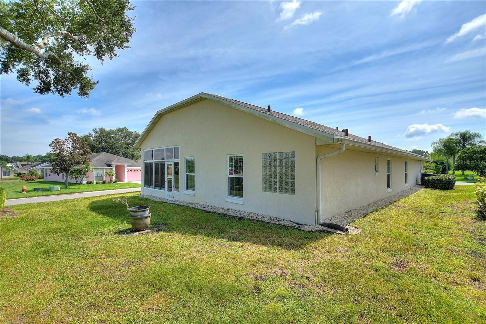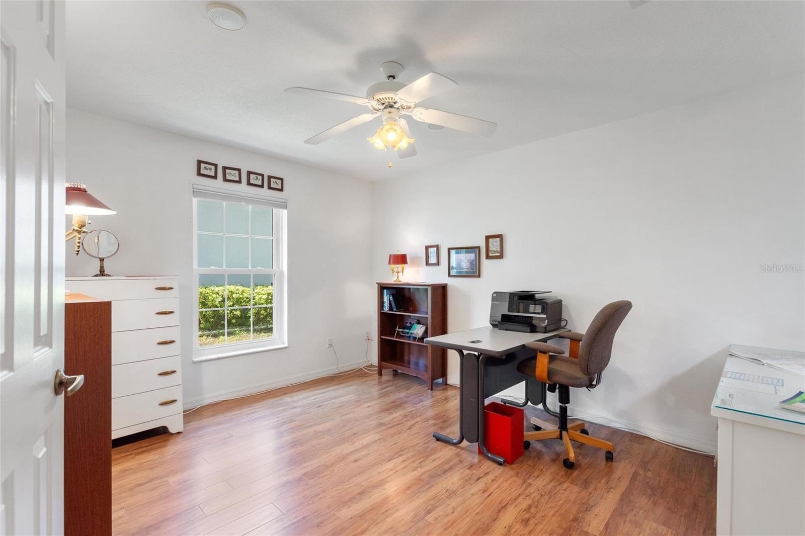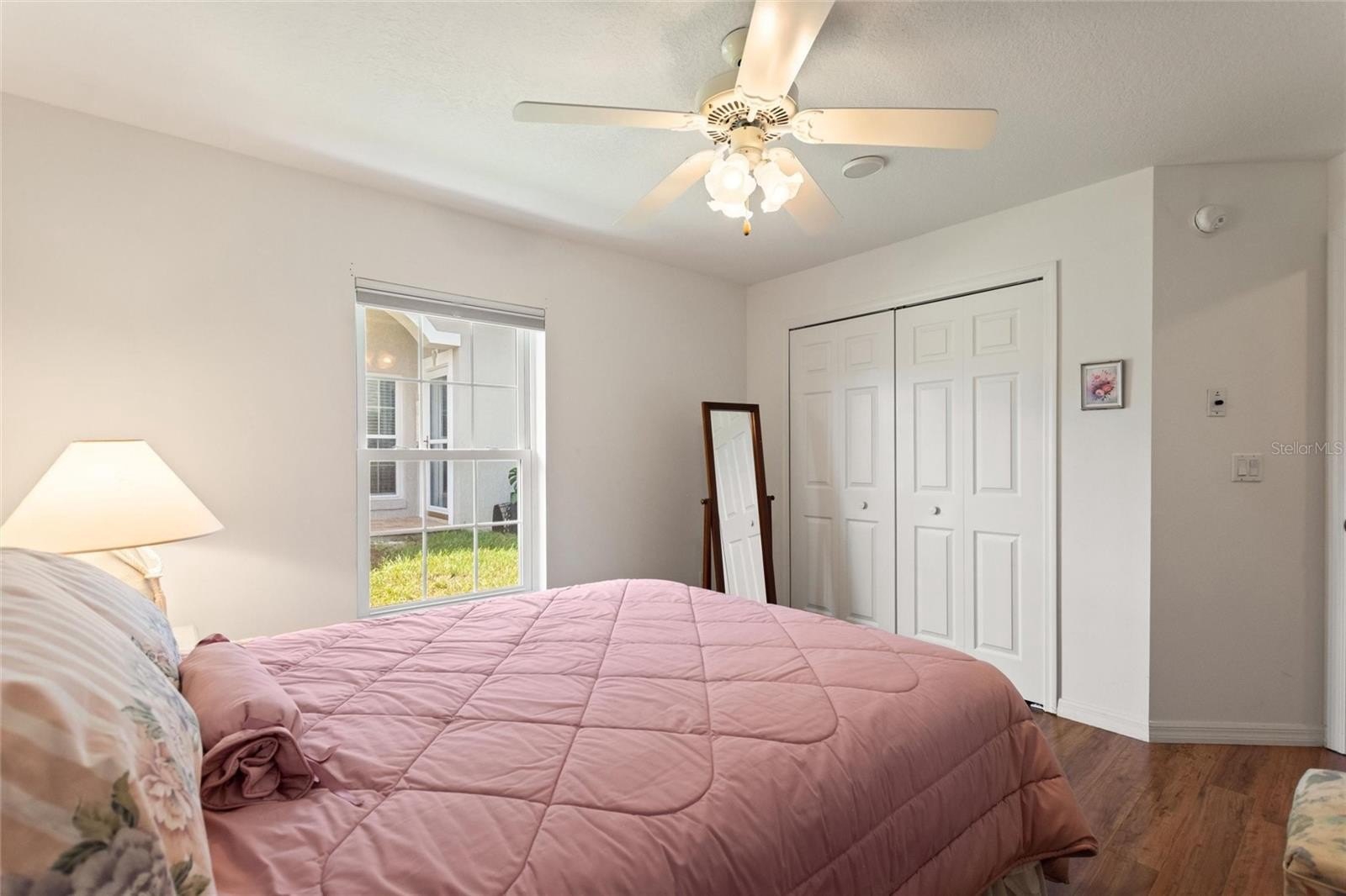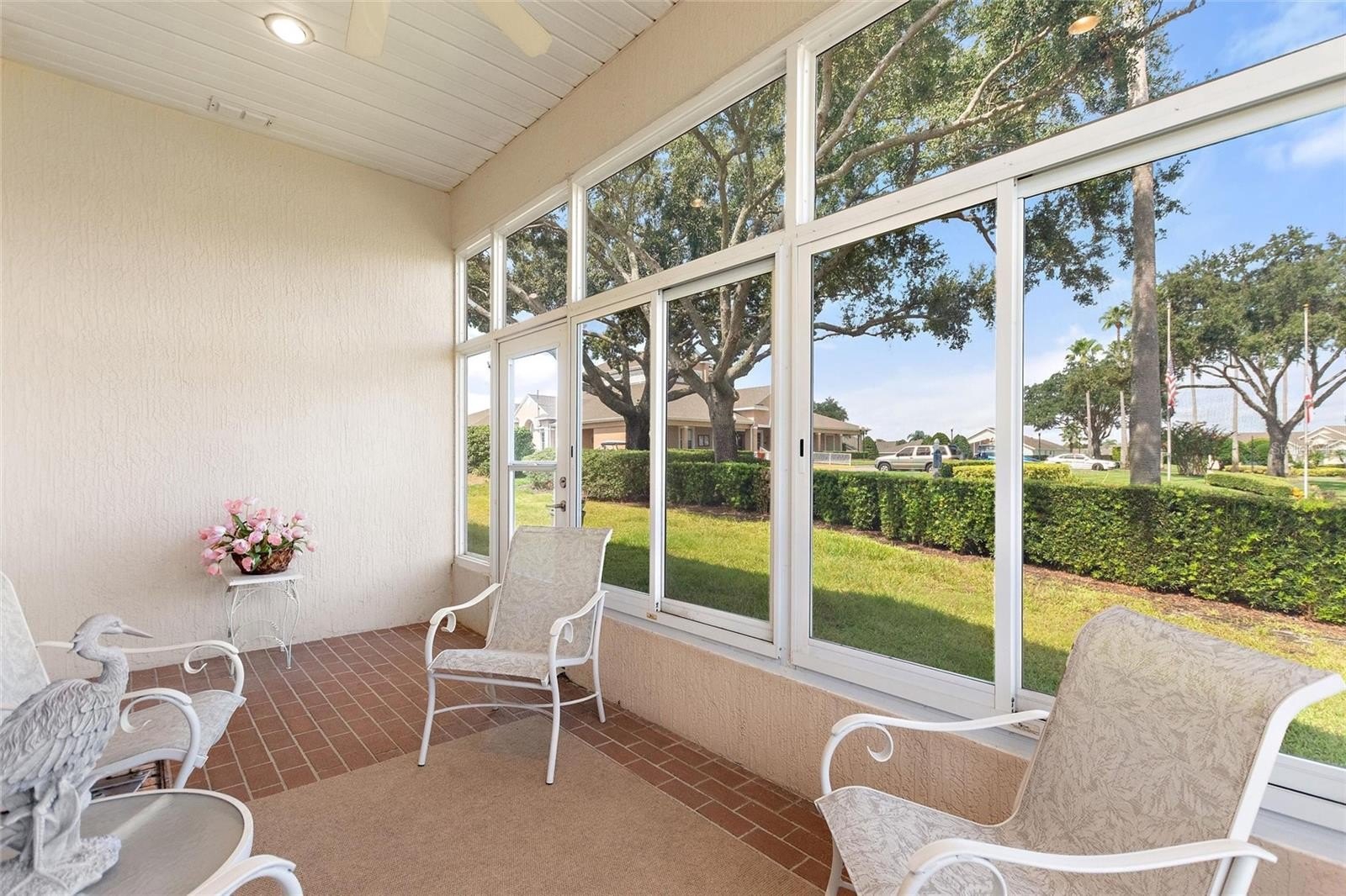 One or more photo(s) has been virtually staged. Partially-furnished RidgeMont 2 Bedroom / 2 Bath / Office model on 1-floor in Gated 55+ Community with 2025 Roof & Water Heater, Solid Surface Floors throughout, newer HVAC & Replacement Windows, located next-door to High Vista's private clubhouse and outdoor amenity center. Brick paver driveway and walkway to a charming portico entry with full-view storm door enters a vaulted-ceiling great room with a wall of patio windows to an enclosed west-facing lanai. Eat-in kitchen in front of house has white cabinets & countertops, large closet pantry and a newer stainless-steel refrigerator. Utility sink and stackable washer/dryer in corridor laundry area. Primary bedroom has private bath within 13x6 walk-in-closet, dual sink vanity, soaking tub, linen closet and shower. Guest bedroom and office share a full bath and large linen closet in this split bedroom floor plan. Quality top-down/bottom-up blinds throughout interior. 2-car garage has insulated garage door with opener & keypad entry and electric screen door. Well for Irrigation. Roof and Water Heater replaced 2025; HVAC replaced 2022; many windows replaced 2019. Newer smoke detectors. Sold As-Is. Ridgewood Lakes is a golf cart friendly community. $230 monthly High Vista HOA fee includes Spectrum internet and basic cable TV with 2 cable boxes, lawn mowing and exclusive access to resident-owned 12,000 SF private High Vista clubhouse and amenities. $425 semi-annual Ridgewood Lakes HOA fee provides 24x7 staffed security gate and master association-owned private road maintenance. Adjacent to 18-hole White Heron Golf Club with restaurant, privately owned and open to the public. High Vista is a 55+ community with outdoor heated pool and spa, fitness center, library, pub & many organized activities. Pickle ball, tennis, bocce and shuffleboard courts. Miles of biking and walking trails within Ridgewood Lakes gated community. Shopping, Disney, Universal, Orlando & Central FL entertainment nearby, easy access to I-4, medical facilities, airports & Sunrail Station. Advent Health hospital is 3 miles away.