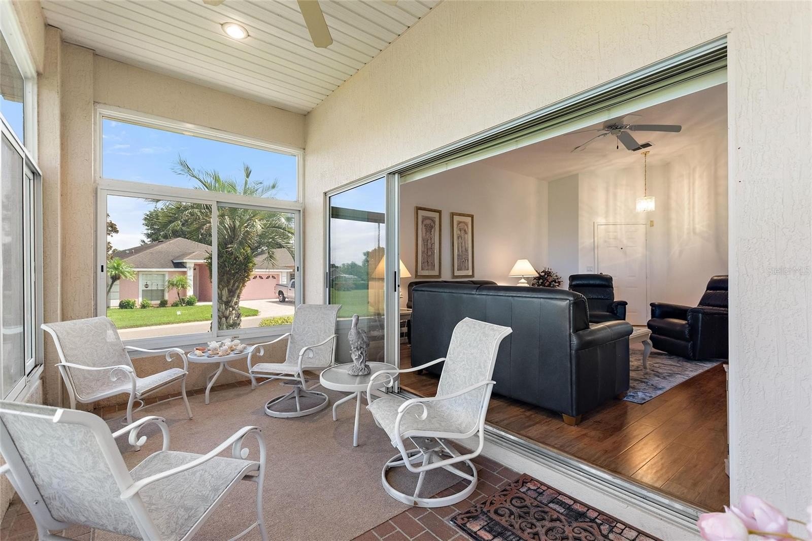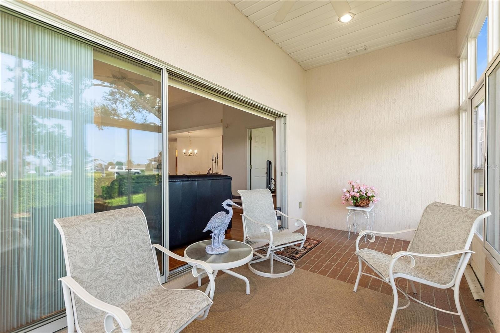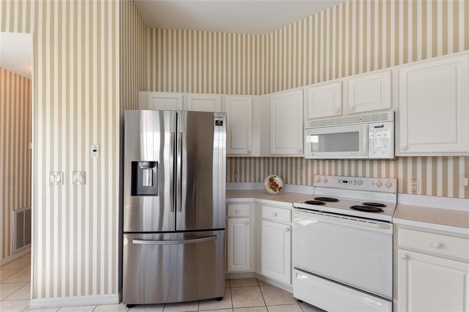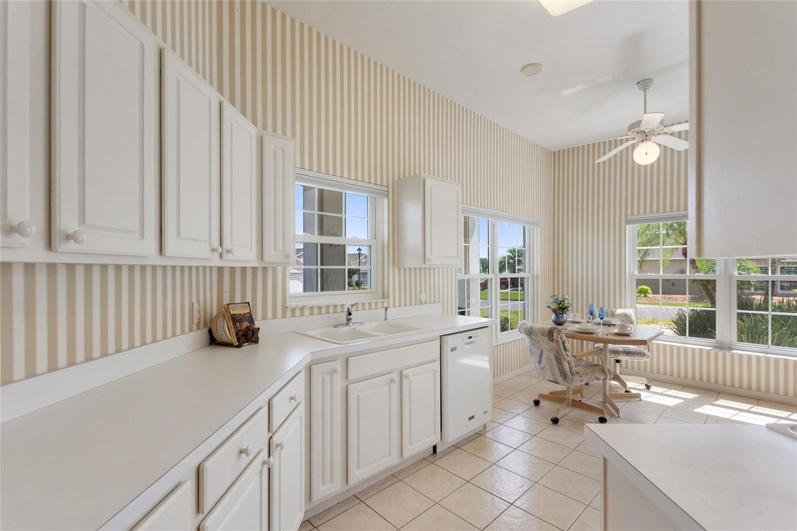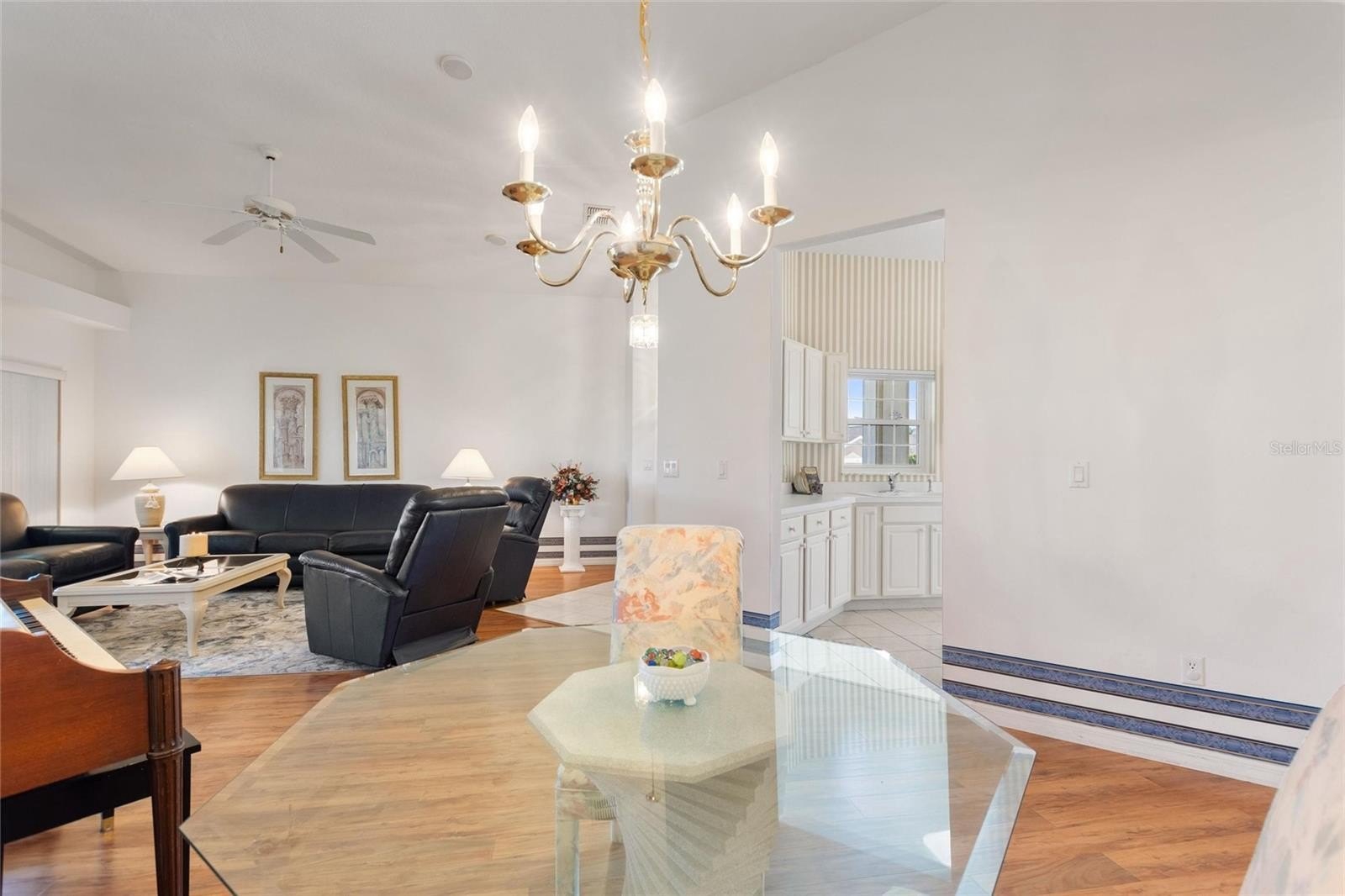 One or more photo(s) has been virtually staged. Partially-furnished RidgeMont 2 Bedroom / 2 Bath / Office model on 1-floor in Gated 55+ Community with 2025 Roof & Water Heater, Solid Surface Floors throughout, newer HVAC & Replacement Windows, located next-door to High Vista's private clubhouse and outdoor amenity center. Brick paver driveway and walkway to a charming portico entry with full-view storm door enters a vaulted-ceiling great room with a wall of patio windows to an enclosed west-facing lanai. Eat-in kitchen in front of house has white cabinets & countertops, large closet pantry and a newer stainless-steel refrigerator. Utility sink and stackable washer/dryer in corridor laundry area. Primary bedroom has private bath within 13x6 walk-in-closet, dual sink vanity, soaking tub, linen closet and shower. Guest bedroom and office share a full bath and large linen closet in this split bedroom floor plan. Quality top-down/bottom-up blinds throughout interior. 2-car garage has insulated garage door with opener & keypad entry and electric screen door. Well for Irrigation. Roof and Water Heater replaced 2025; HVAC replaced 2022; many windows replaced 2019. Newer smoke detectors. Sold As-Is. Ridgewood Lakes is a golf cart friendly community. $230 monthly High Vista HOA fee includes Spectrum internet and basic cable TV with 2 cable boxes, lawn mowing and exclusive access to resident-owned 12,000 SF private High Vista clubhouse and amenities. $425 semi-annual Ridgewood Lakes HOA fee provides 24x7 staffed security gate and master association-owned private road maintenance. Adjacent to 18-hole White Heron Golf Club with restaurant, privately owned and open to the public. High Vista is a 55+ community with outdoor heated pool and spa, fitness center, library, pub & many organized activities. Pickle ball, tennis, bocce and shuffleboard courts. Miles of biking and walking trails within Ridgewood Lakes gated community. Shopping, Disney, Universal, Orlando & Central FL entertainment nearby, easy access to I-4, medical facilities, airports & Sunrail Station. Advent Health hospital is 3 miles away.