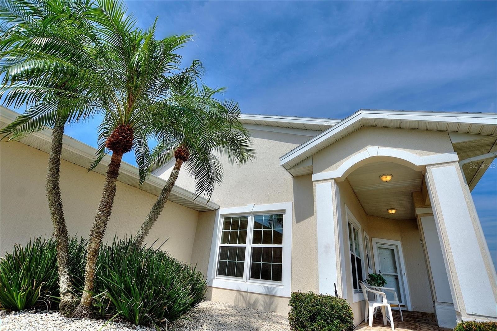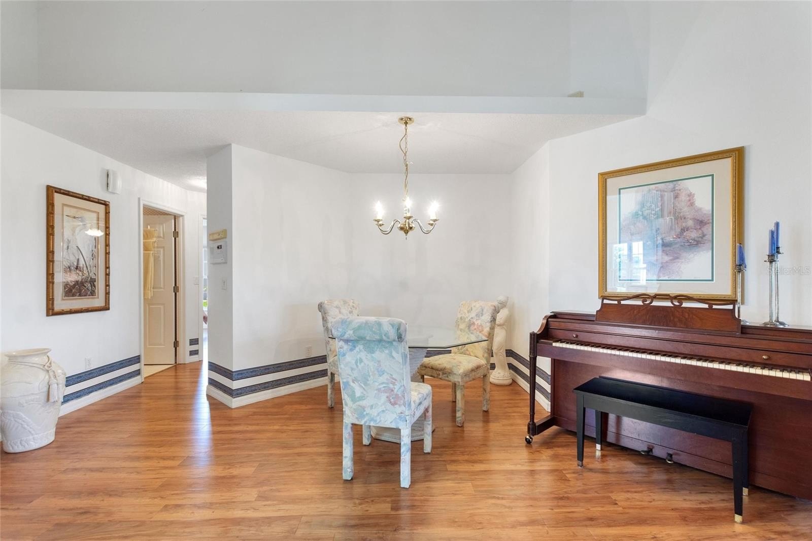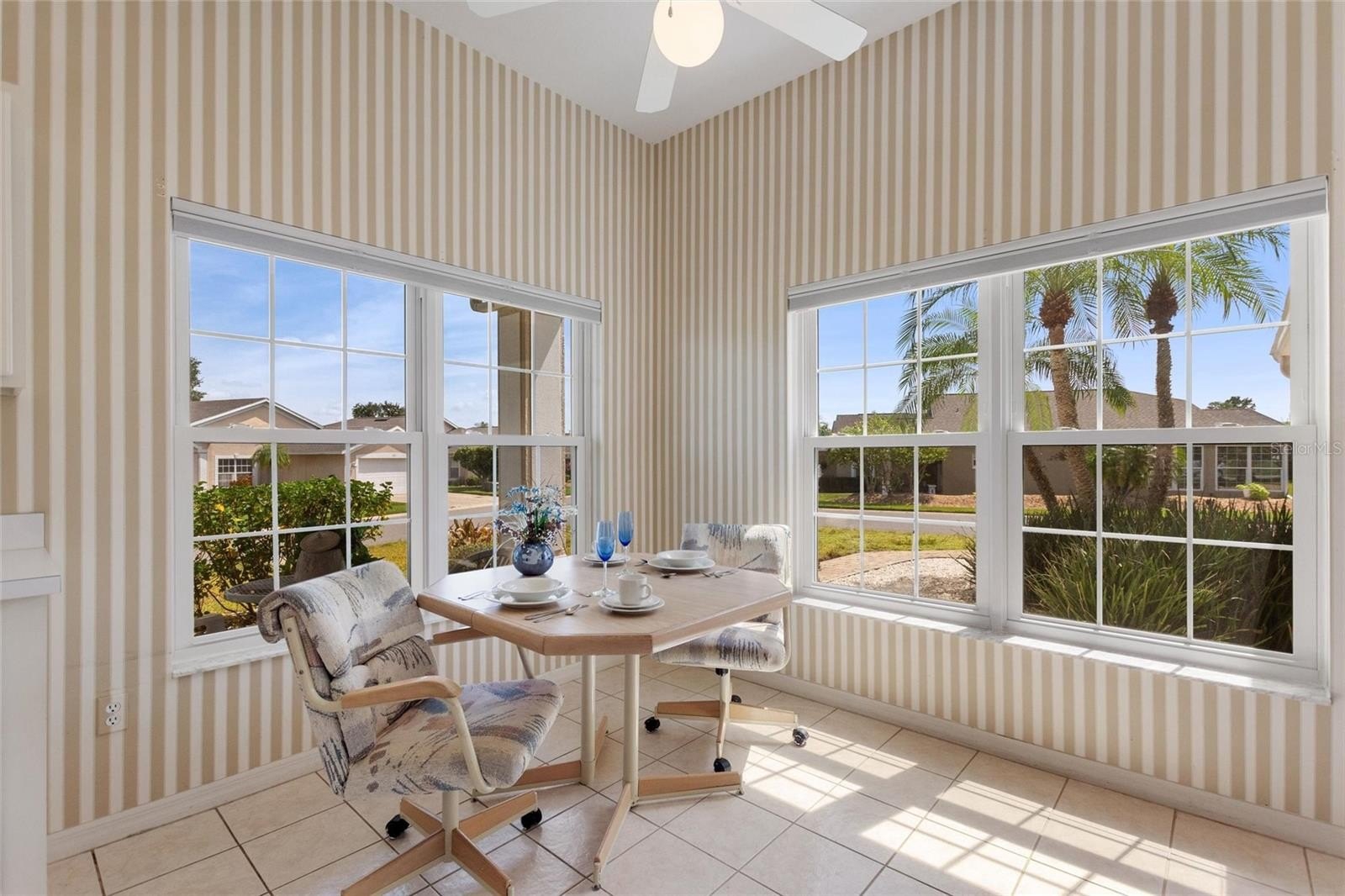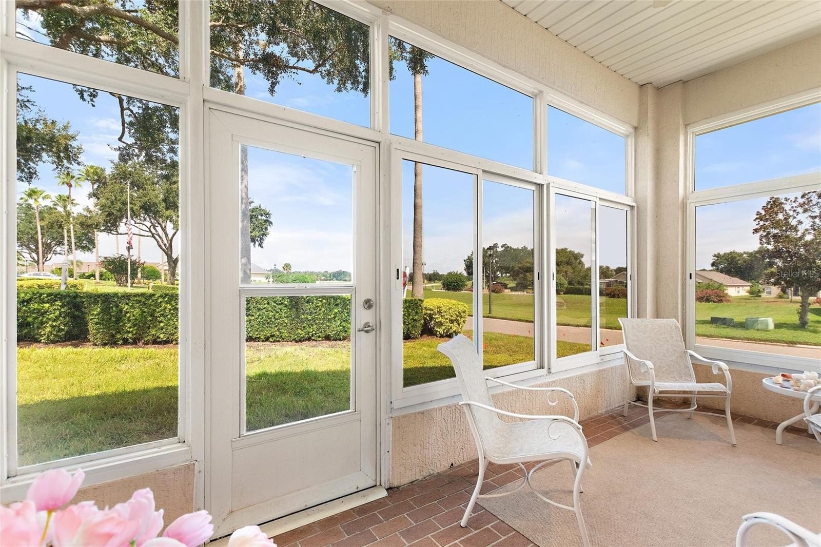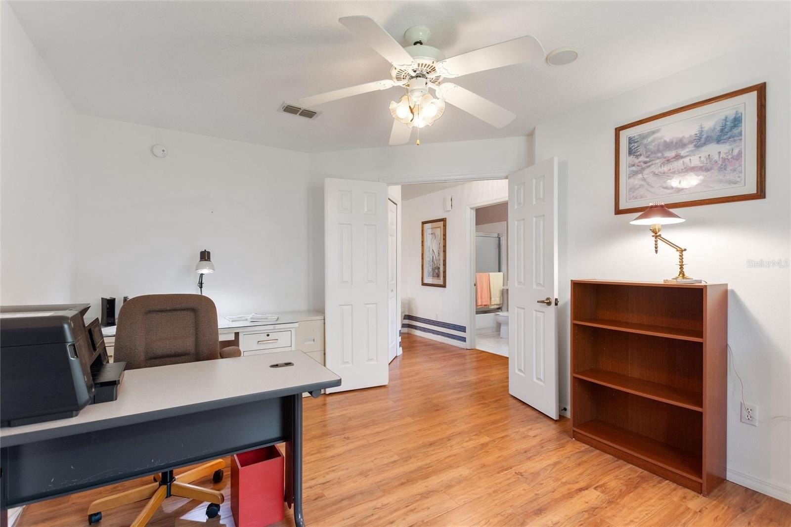 One or more photo(s) has been virtually staged. Partially-furnished RidgeMont 2 Bedroom / 2 Bath / Office model on 1-floor in Gated 55+ Community with 2025 Roof & Water Heater, Solid Surface Floors throughout, newer HVAC & Replacement Windows, located next-door to High Vista's private clubhouse and outdoor amenity center. Brick paver driveway and walkway to a charming portico entry with full-view storm door enters a vaulted-ceiling great room with a wall of patio windows to an enclosed west-facing lanai. Eat-in kitchen in front of house has white cabinets & countertops, large closet pantry and a newer stainless-steel refrigerator. Utility sink and stackable washer/dryer in corridor laundry area. Primary bedroom has private bath within 13x6 walk-in-closet, dual sink vanity, soaking tub, linen closet and shower. Guest bedroom and office share a full bath and large linen closet in this split bedroom floor plan. Quality top-down/bottom-up blinds throughout interior. 2-car garage has insulated garage door with opener & keypad entry and electric screen door. Well for Irrigation. Roof and Water Heater replaced 2025; HVAC replaced 2022; many windows replaced 2019. Newer smoke detectors. Sold As-Is. Ridgewood Lakes is a golf cart friendly community. $230 monthly High Vista HOA fee includes Spectrum internet and basic cable TV with 2 cable boxes, lawn mowing and exclusive access to resident-owned 12,000 SF private High Vista clubhouse and amenities. $425 semi-annual Ridgewood Lakes HOA fee provides 24x7 staffed security gate and master association-owned private road maintenance. Adjacent to 18-hole White Heron Golf Club with restaurant, privately owned and open to the public. High Vista is a 55+ community with outdoor heated pool and spa, fitness center, library, pub & many organized activities. Pickle ball, tennis, bocce and shuffleboard courts. Miles of biking and walking trails within Ridgewood Lakes gated community. Shopping, Disney, Universal, Orlando & Central FL entertainment nearby, easy access to I-4, medical facilities, airports & Sunrail Station. Advent Health hospital is 3 miles away.