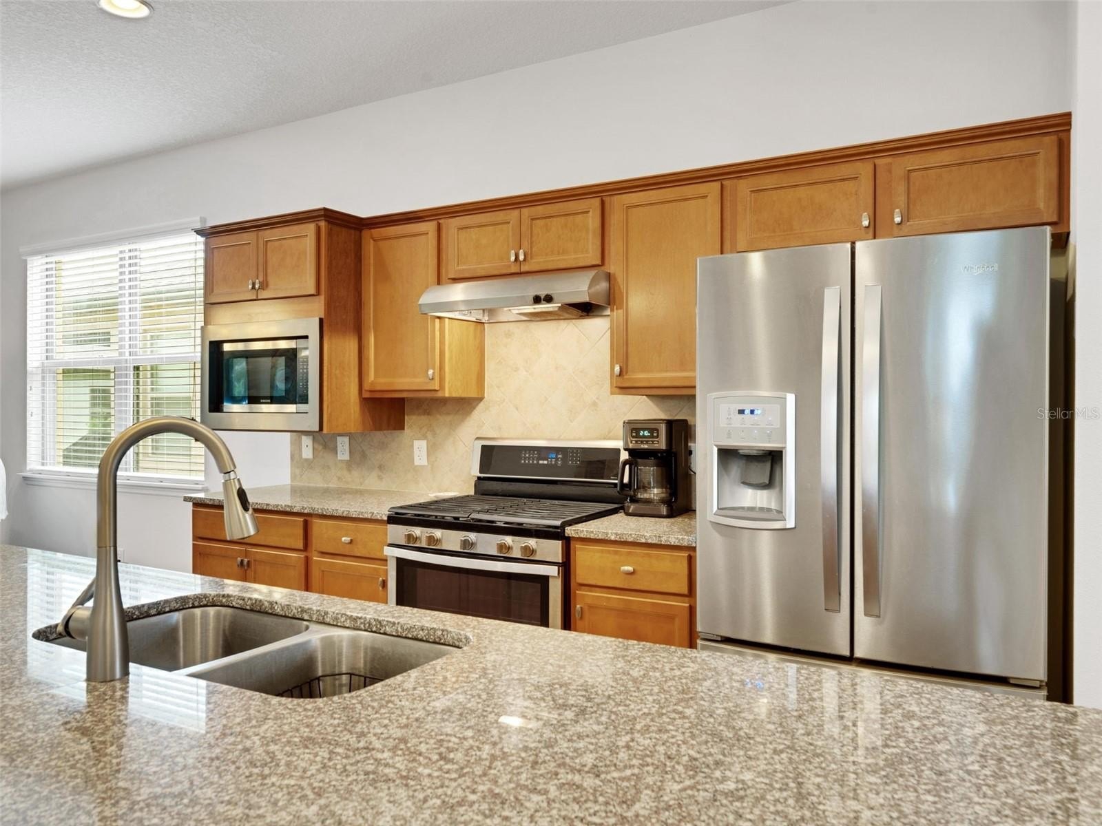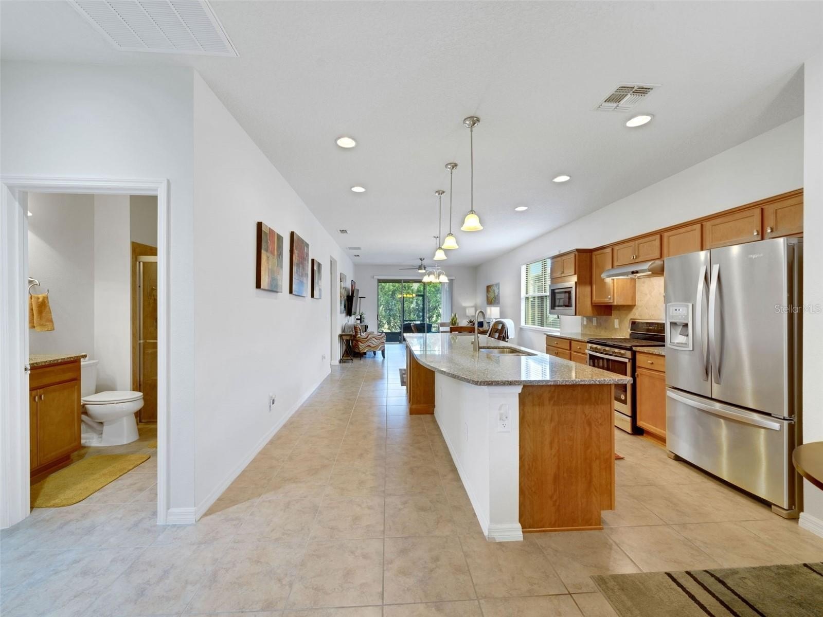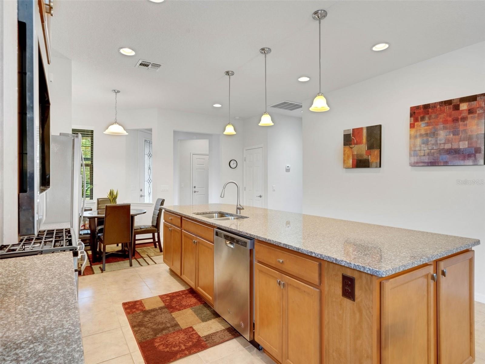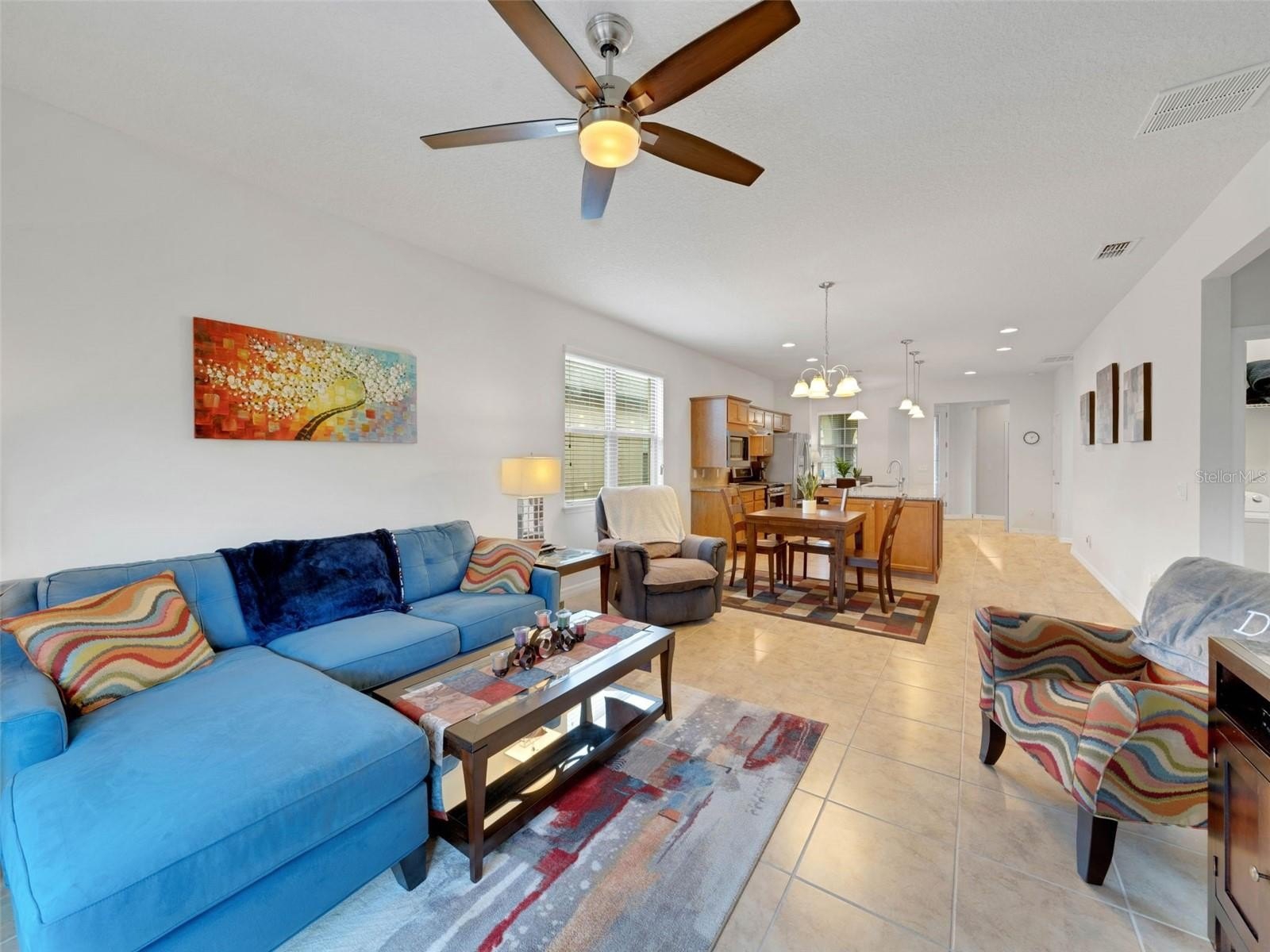 This cozy Steel Creek model located in the beautiful and desirable Del Webb Orlando 55+ community has 2 BR and 2 baths. Before entering the home notice the concrete curbing around the entire house that has been installed for ease of landscape maintenance. Stone facade, garage door keypad, the beautiful 8' leaded glass front door and rear security lights are upgrades that were installed when the home was built. The front entryway has been screened and provides a restful area to enjoy passing the time. Once inside the foyer, you can appreciate the open floorplan. Nestled in the front section of the room is a kitchen nook, which could also be used as a small office or sitting area. The solid wood cabinets are complete with granite countertops and are complimented by the stainless steel appliances, including a NATURAL GAS range. A large island provides space for that quick breakfast or for serving space for a larger meal. The great room and dining area are located off the kitchen near the back. Outside, through the triple sliding glass door is a peaceful screened lanai, complimented with a paver patio, that offers a place for morning coffee or simply relaxing. The owner’s suite is located in the rear of the home and features an on-suite with large walk-in closet, granite countertops, a linen closet and a large shower. The second bedroom and bath are located near the front of the home boasting privacy for guests. The second bathroom has been upgraded to a walk-in shower. When the power goes out, the 22K GENERAC GENERATOR kicks on and keeps the household running! The $277 monthly Del Webb HOA fee includes yard maintenance and exclusive access to resident-owned 30,000+ SF Montecito clubhouse and amenities. $425 semi-annual HOA fee provides 24x7 staffed security gate and master association-owned private road maintenance. Adjacent to recently renovated 18-hole White Heron Golf Club. DEL WEBB ORLANDO is a 55+ community with a tavern, indoor walking track, indoor and outdoor pools and spas and fitness center. Outdoor activities include tennis, bocce, basketball and pickleball. Miles of biking and walking trails within Ridgewood Lakes gated community. Located conveniently to shopping at Posner Park (4 miles), Disney World, Universal Studios, Orlando & Central FL entertainment nearby. Easy access to I-4, medical facilities, airports & Sunrail Station. Advent Health hospital is 3 miles away.
