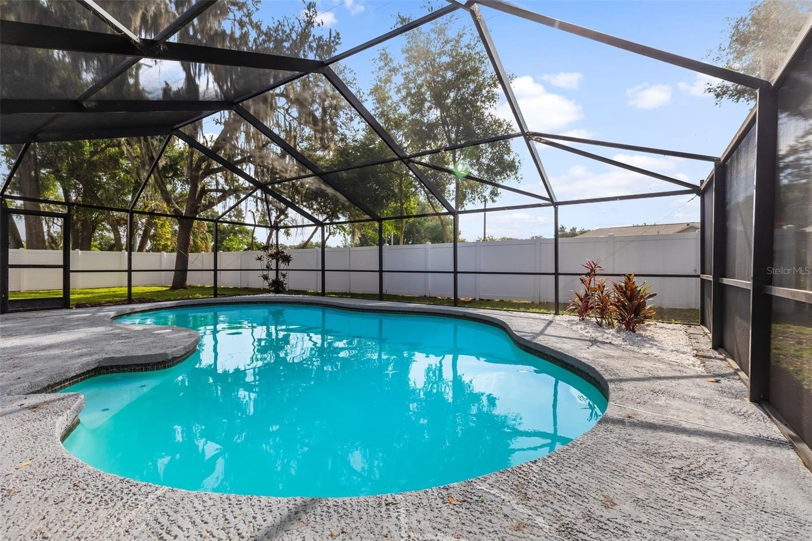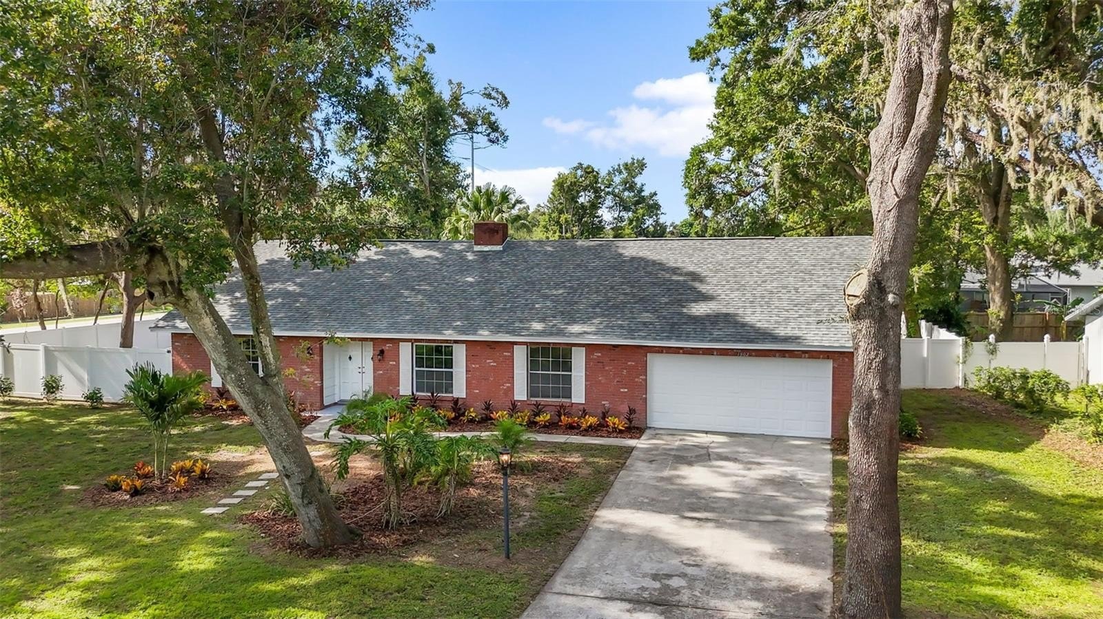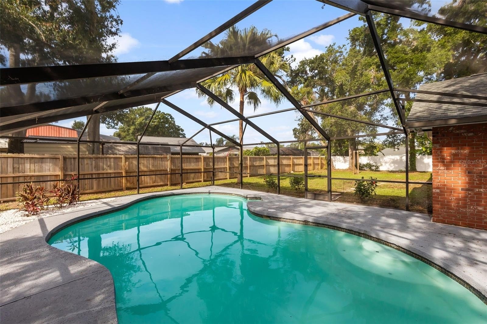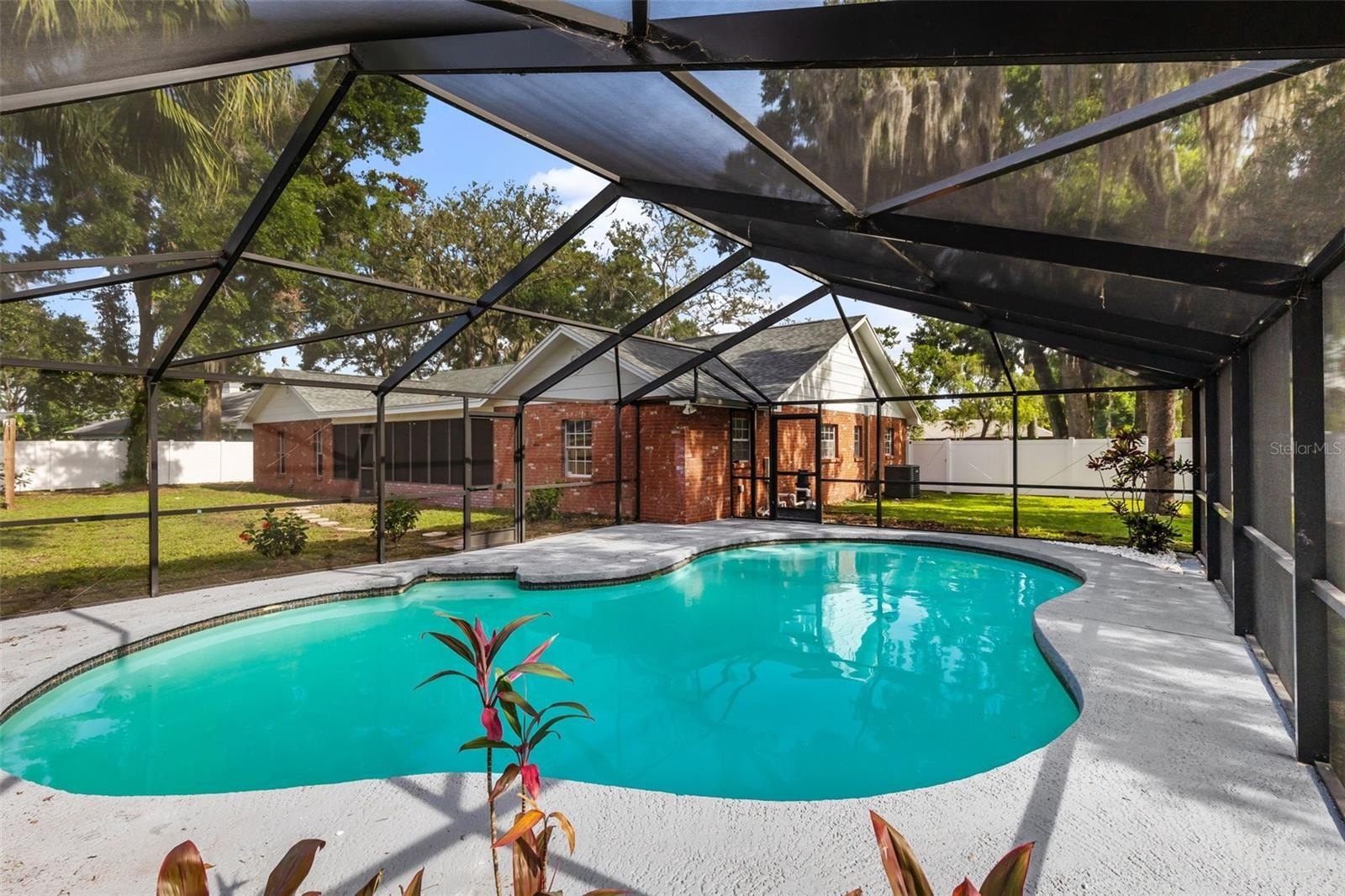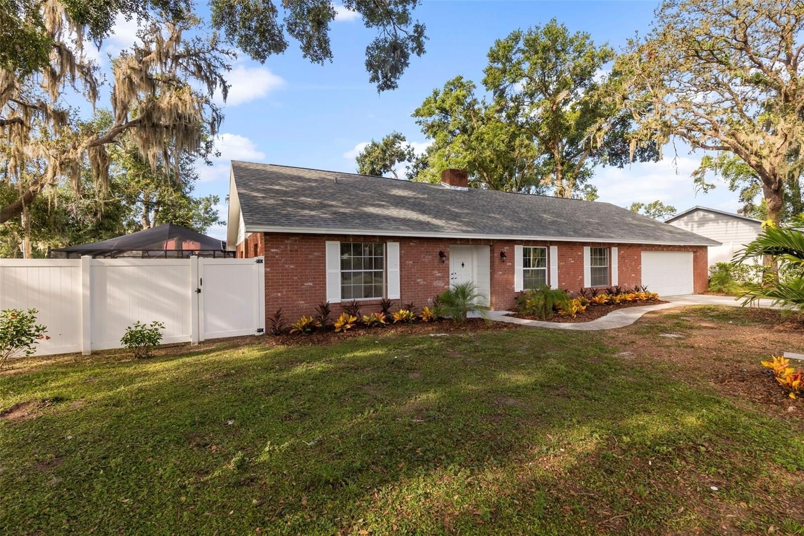 One or more photo(s) has been virtually staged. SELLER WILL PAY $6,000 TOWARDS BUYER'S CLOSING COSTS. Shaded by majestic oak trees and framed by a charming red brick exterior, this beautifully updated 4-bedroom, 2-bathroom, 2-car garage pool home in Parkwood Manor is the perfect blend of comfort, functionality, and modern style. A new roof, fresh landscaping, elegant vinyl fencing, and outdoor lighting enhance the curb appeal, setting the stage for what lies inside. As you approach the covered entryway, double front doors welcome you into a bright and inviting interior. Step into the formal dining room and first living area, where luxury vinyl flooring spans the main living spaces, complemented by fresh interior paint and upgraded 2-inch baseboards that add a refined touch throughout. Adjacent to the dining room, the renovated kitchen impresses with crisp white shaker soft-close cabinetry, quartz countertops, new stainless steel appliances, recessed lighting, and a charming eat-in breakfast space. A pantry closet offers ample storage, while a nearby laundry room provides convenient garage access. Privately positioned on one side of the home, the primary suite offers a peaceful retreat. Enjoy dual walk-in closets, modern lighting, and glass sliding doors that open directly to the screened-in outdoor living area. The ensuite bathroom has been thoughtfully upgraded with a dual sink vanity topped with quartz, a stylish new mirror, recessed lighting, and an expansive walk-in tile shower complete with dual shampoo niches and a built-in bench—combining spaciousness with spa-like comfort and sophistication. At the heart of the home, the family room boasts soaring cathedral ceilings with rustic wood beams, skylights, a cozy brick wood-burning fireplace, custom built-in shelving with quartz countertops, and French doors that lead to the showstopping outdoor space. On the opposite side of the home, a split-bedroom layout offers three generously sized guest bedrooms. The third bedroom features private outdoor access, ideal for guests or multigenerational living. This side of the home also features abundant storage closet space, providing convenience and organization. The second full bathroom has been tastefully renovated with a dual sink vanity, quartz countertops, updated tilework, and recessed lighting, serving the secondary bedrooms with both style and practicality. Step outside through the French doors and into your expansive screened-in patio—a versatile space perfect for entertaining or relaxing in the shade. Beyond, a paved walkway leads to your oversized backyard oasis, complete with lush mature trees and a screen-enclosed pool featuring newly installed screens and room to personalize your dream outdoor lifestyle. No HOA/CDD. Notable upgrades include: new HVAC (2025), new roof, vinyl fencing, fresh interior/exterior paint, new appliances, new lighting fixtures, updated bathrooms, and energy-efficient features throughout. Located just minutes from I-75, this home offers easy access to local nature escapes including Lithia Springs Park (13 minutes) and Alafia River State Park (22 minutes), along with an abundance of nearby shopping, dining, and recreation options. This Parkwood Manor gem offers modern updates, thoughtful design, and the perfect layout for comfortable Florida living—inside and out. For a virtual tour, click the provided link and experience the beauty of this remarkable property.