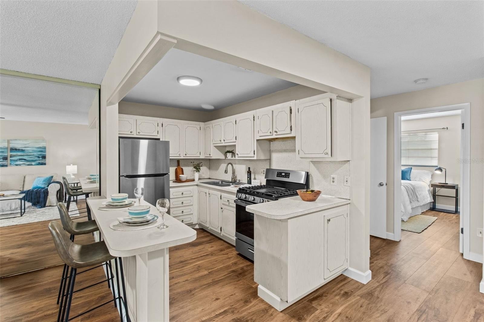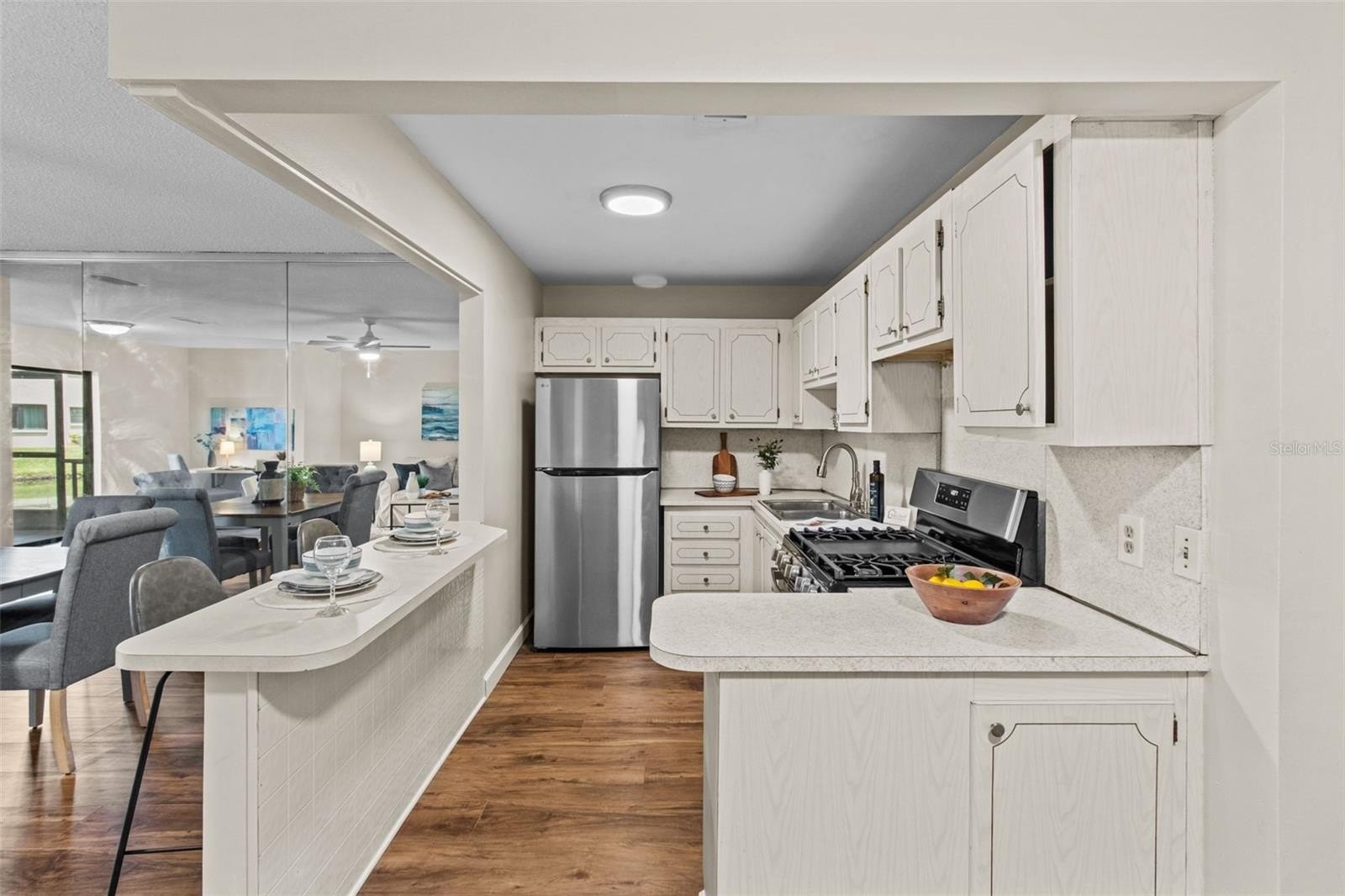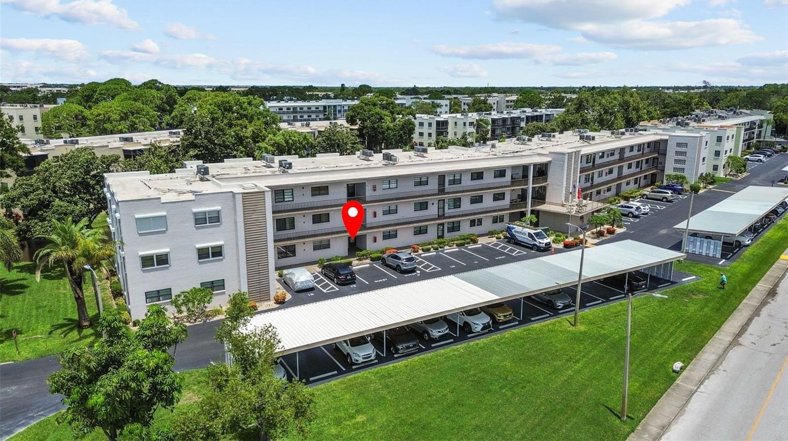 Welcome to your forever home! Retire in style in this adorable 1-bedroom, 1-bath condo in the sought-after 55+ community of Five Towns. Enjoy the ease of first-floor living with a *perfect* pond view right from your screened patio. NEW flooring is premier laminate. NEWER electrical panel and AC is less than a year old! Newly renovated bathroom! Kitchen cabinets and counter need TLC, but the oven and refrigerator are brand new! Freshly painted throughout, including ceilings! Forget clutter with the surprisingly spacious storage behind the living room mirror - (Or, easily remove to expand your living space). Plus, take advantage of the convenient community laundry. (This unit does not have in-unit laundry, however buyer is allowed to hire licensed plumber to install hookups with board approval and proper permits, dryer would need to be ventless). Comes with covered carport #23 which is a huge bonus in beating the Florida heat. Located centrally in the community, you're steps away from all that Five Towns has to offer, including the Magnolia clubhouse where most events take place. You can see just how close this building is to two of the six total community pools - so you can take your pick! Your worry-free lifestyle starts here! **All listing information is considered highly reliable according to seller, buyer/buyer's agent to verify** Gas hot water is maintained by the building. Five Towns is renovating its amenities over the next few years, which will only add value to these properties. Location is just a short drive to Publix, banking, restaurants, and shopping and only a 10-minute drive to the beach or a 20-minute drive to downtown St Pete! Five Towns is on 111 acres and has 9 ponds, 6 pools and a hot tub, 3 outdoor kitchen style gazebos with grills and refrigerators, tons of walking area, tennis courts, shuffleboard courts, horseshoe, bocce ball, and 2 clubhouses which house a billiards room, a library, 2 fitness centers, 2 auditoriums, and 2 card rooms. There are events happening almost every day of the week, including Card Games, Yoga, Mahjongg Classes, Exercise Classes, Theater Club and Events, Painting, Card Making, Quilting, Swimming, Dances, Pancake Breakfasts, Band Concerts, and more!! You will not find a more immaculately cared for 55+ community in St Pete! Come see what your new life could look like today! Buyer to verify all listing information.