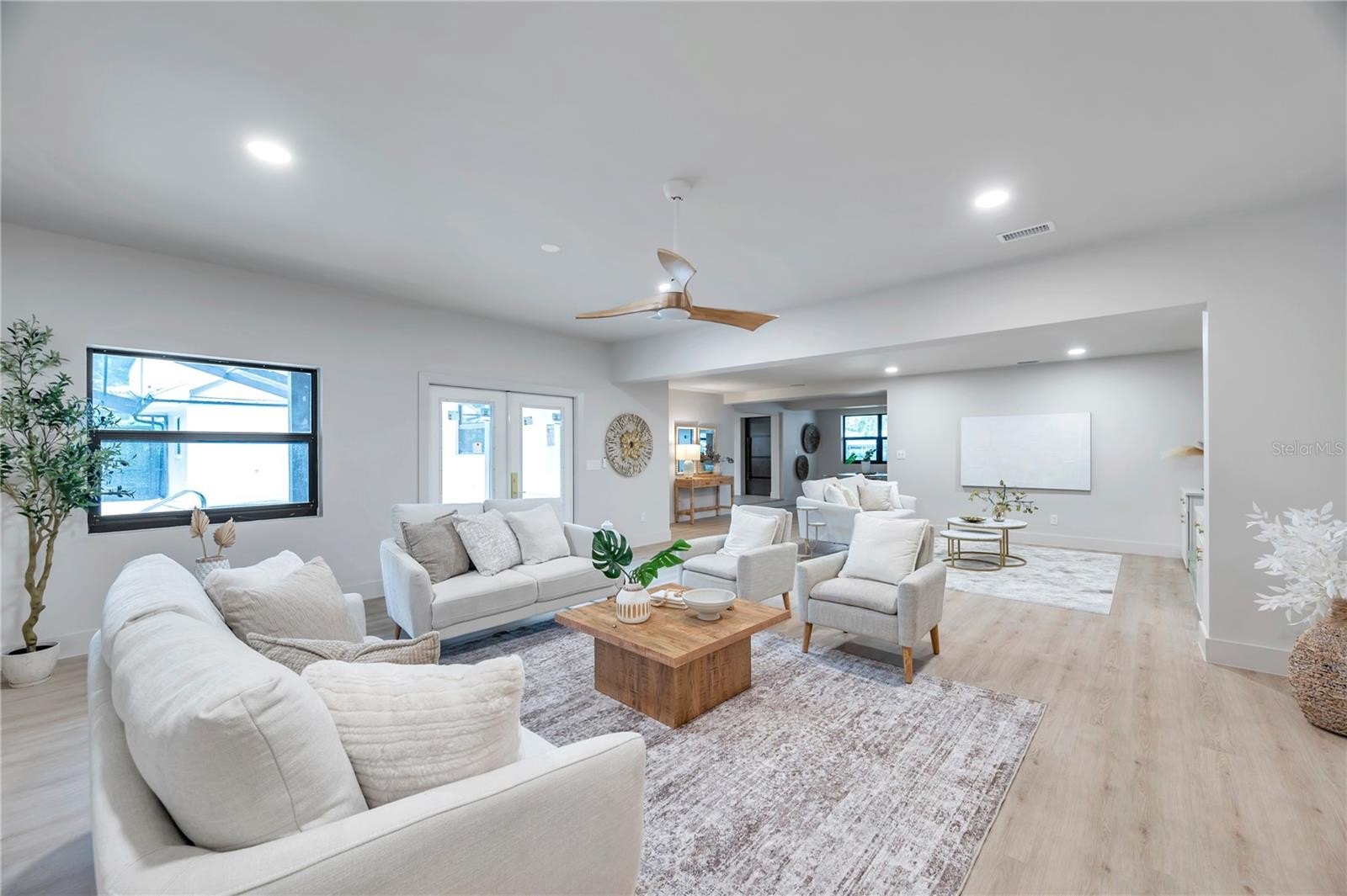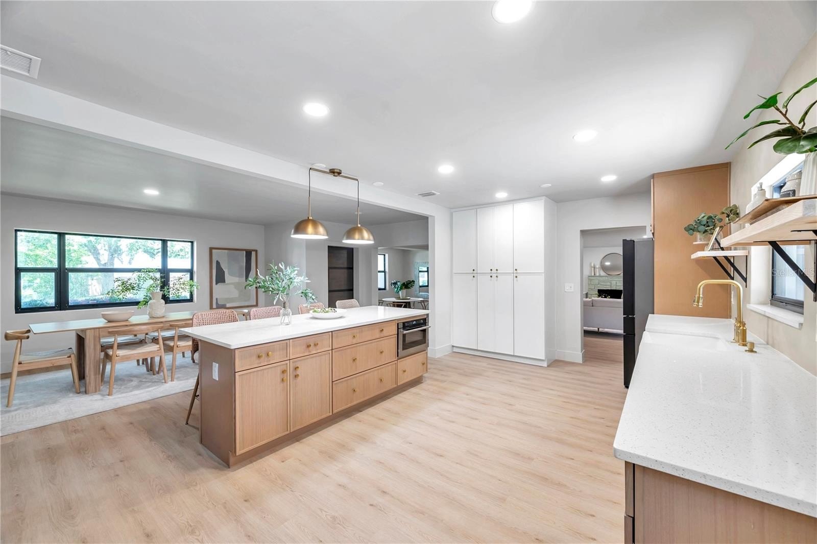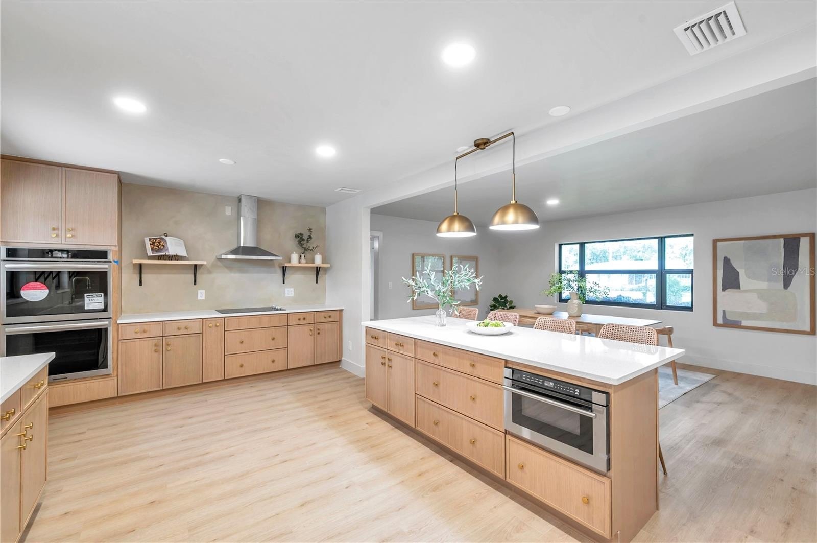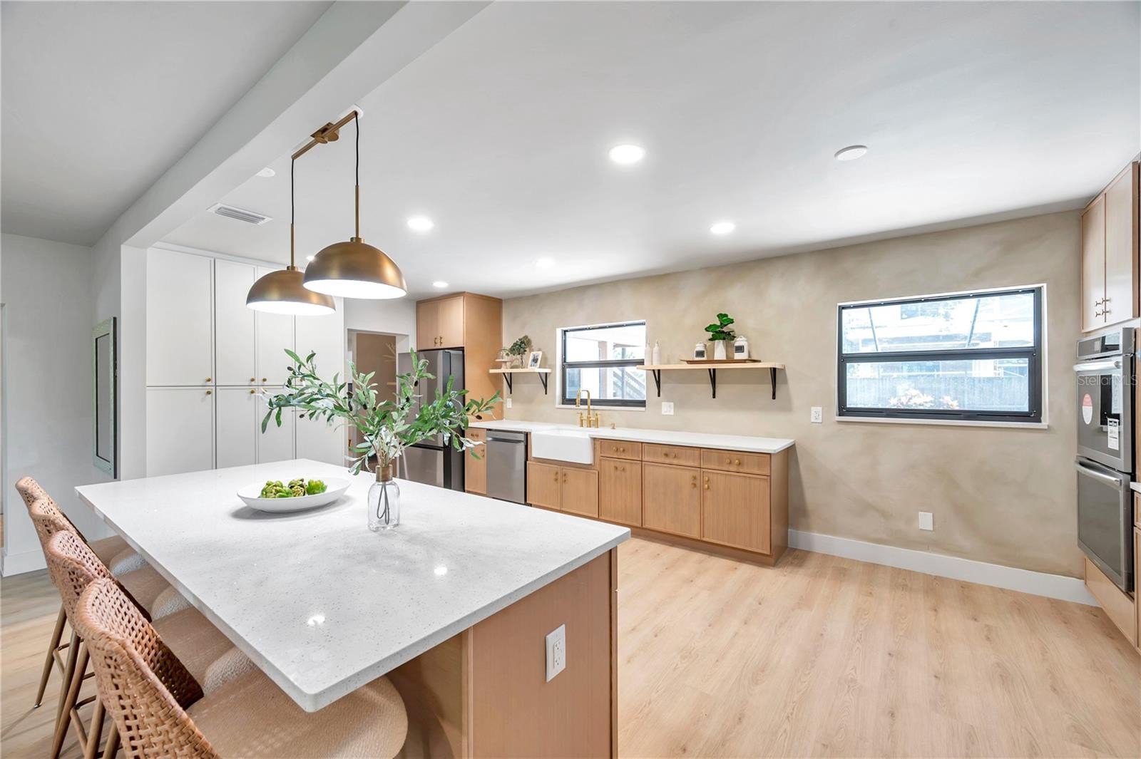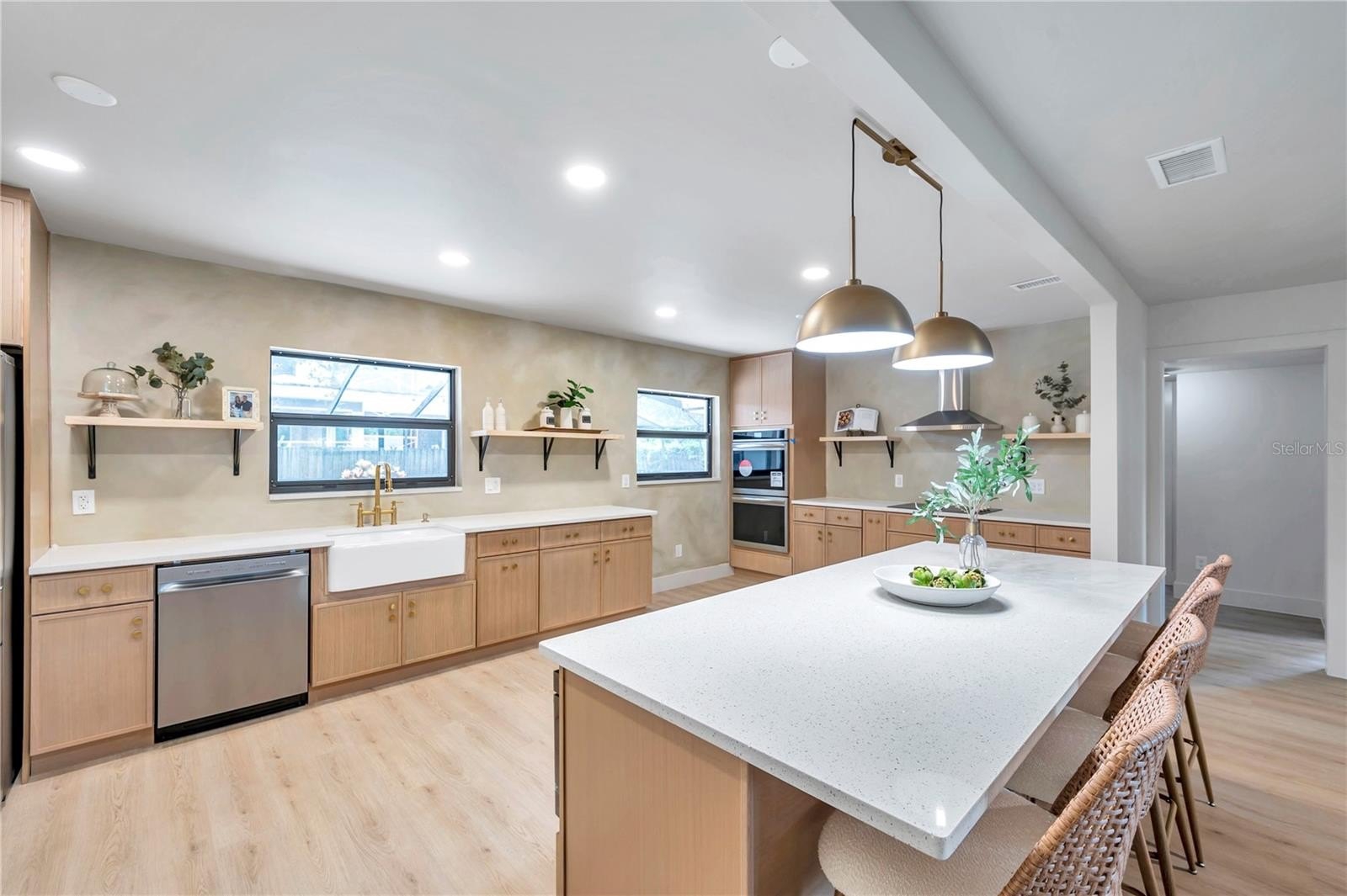 Step inside to an open-concept floor plan with expansive living and dining areas, wide-plank flooring, and abundant natural light through newer impact-rated Low-E windows. The designer kitchen features custom wood cabinetry, quartz countertops, stainless steel appliances, and a large island—perfect for entertaining.