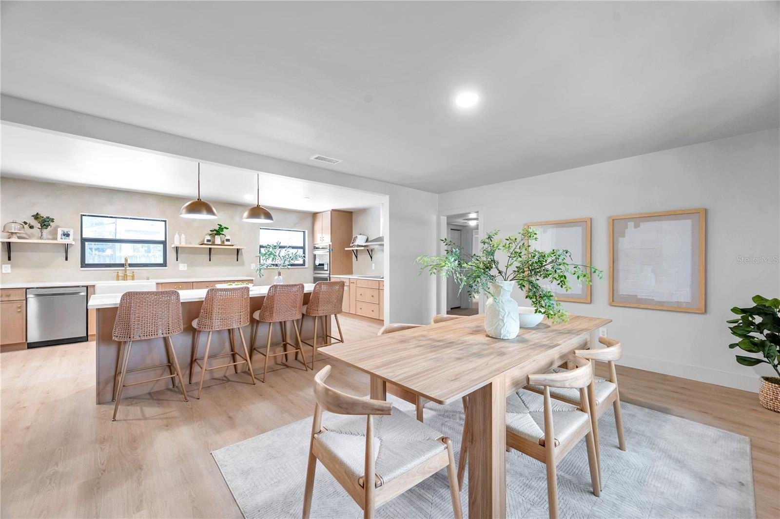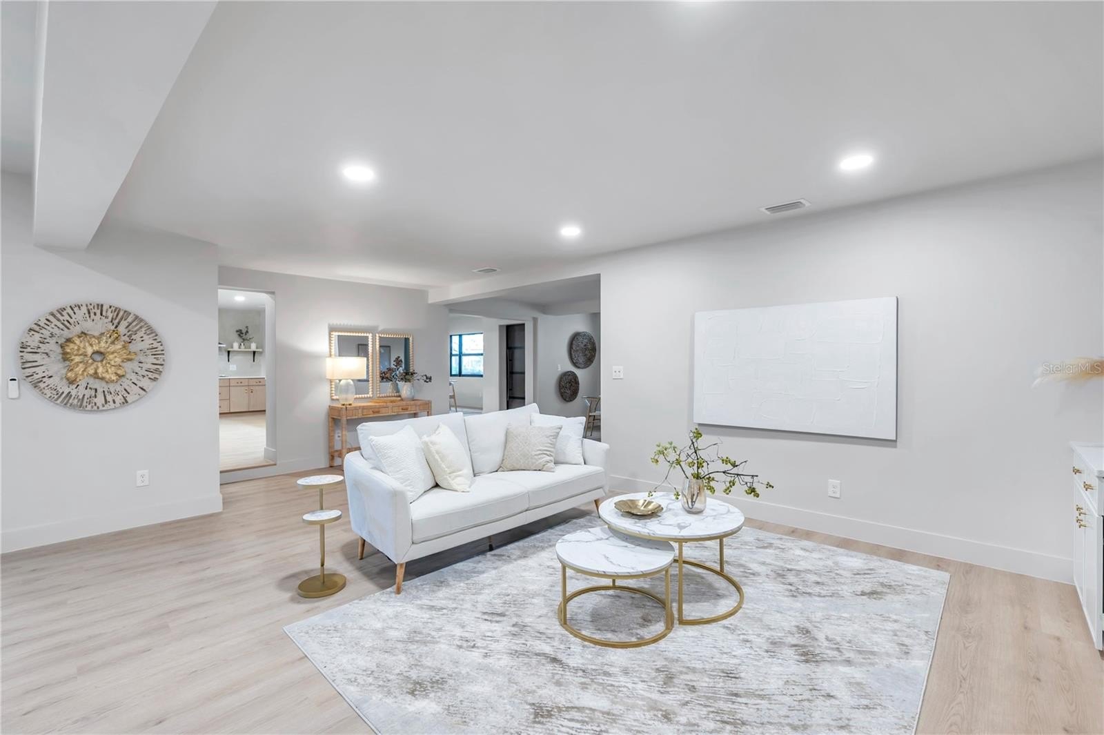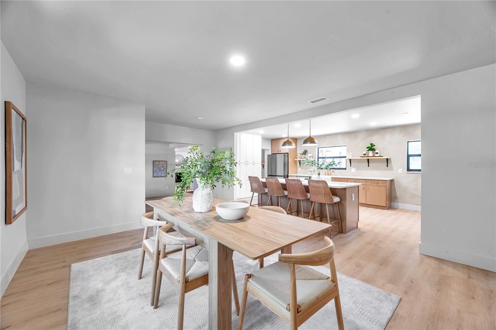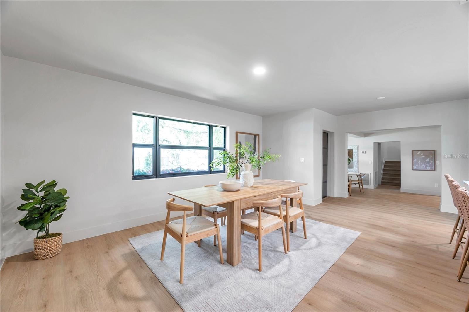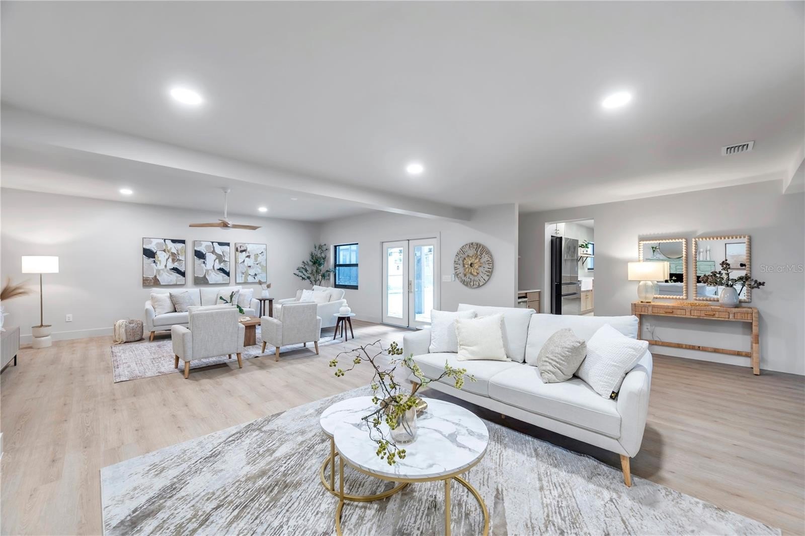 Step inside to an open-concept floor plan with expansive living and dining areas, wide-plank flooring, and abundant natural light through newer impact-rated Low-E windows. The designer kitchen features custom wood cabinetry, quartz countertops, stainless steel appliances, and a large island—perfect for entertaining.