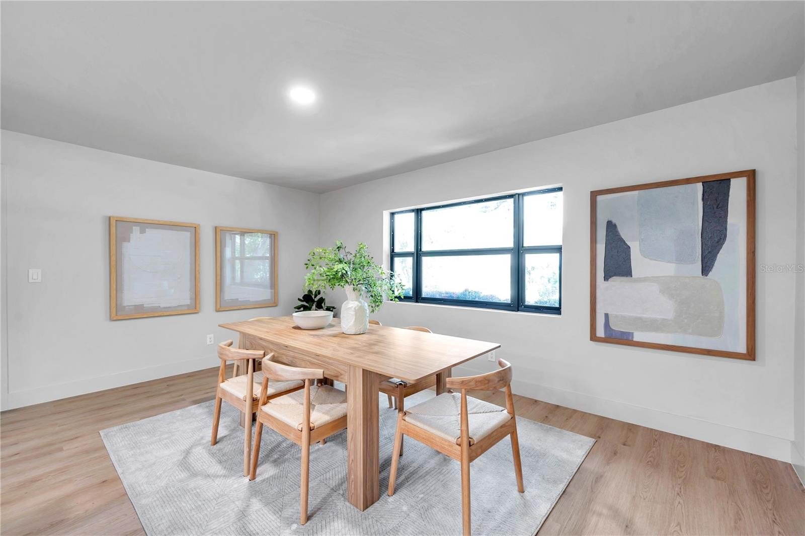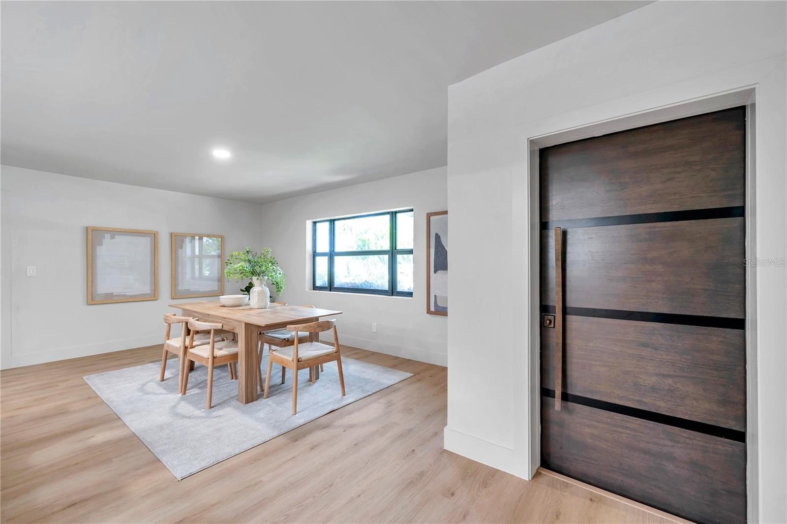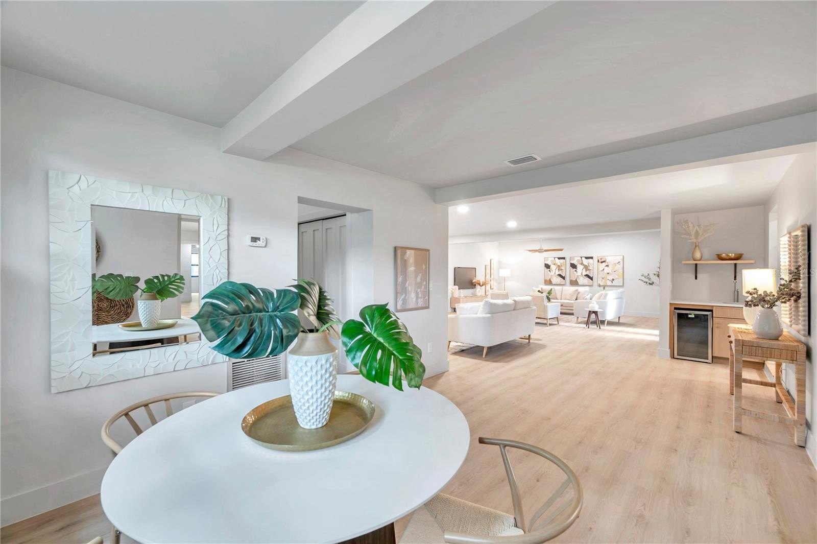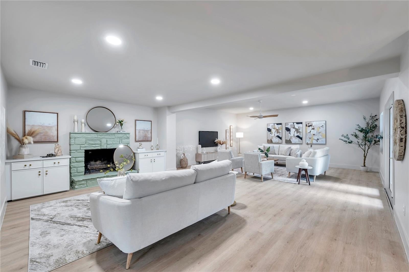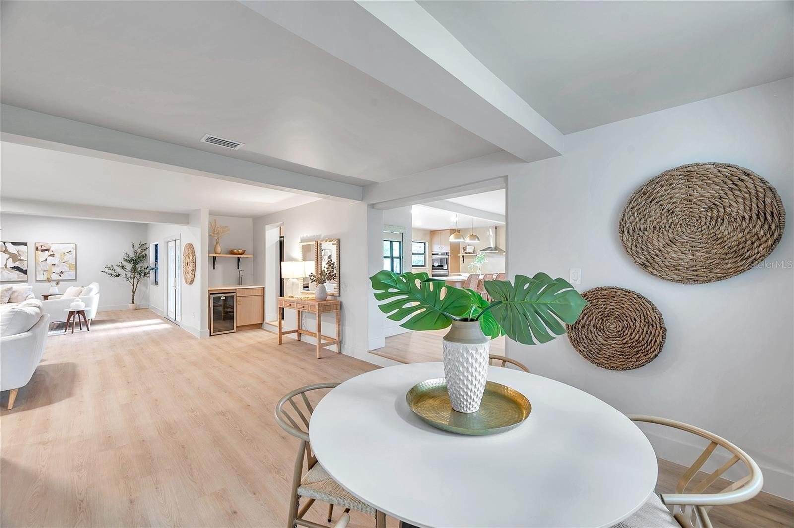 Step inside to an open-concept floor plan with expansive living and dining areas, wide-plank flooring, and abundant natural light through newer impact-rated Low-E windows. The designer kitchen features custom wood cabinetry, quartz countertops, stainless steel appliances, and a large island—perfect for entertaining.