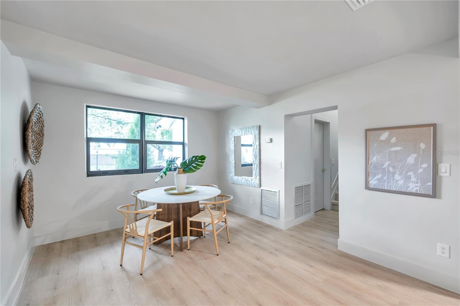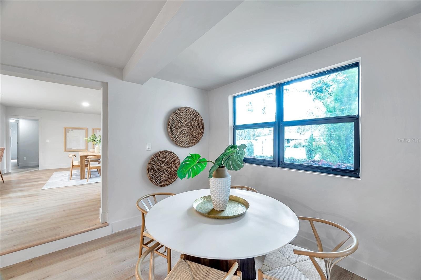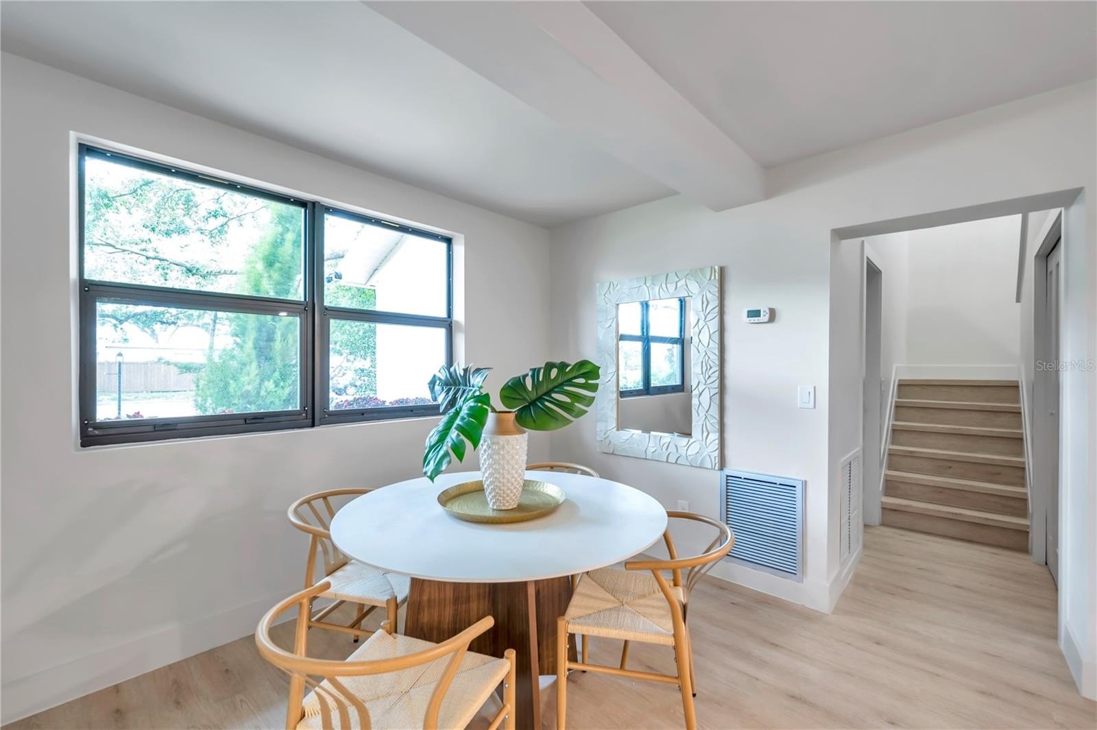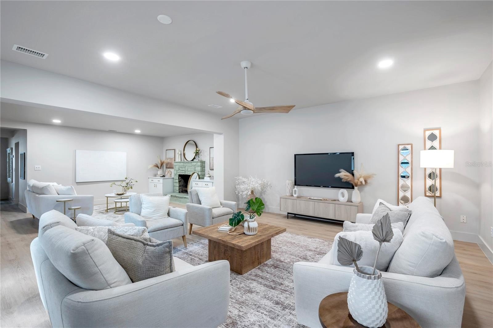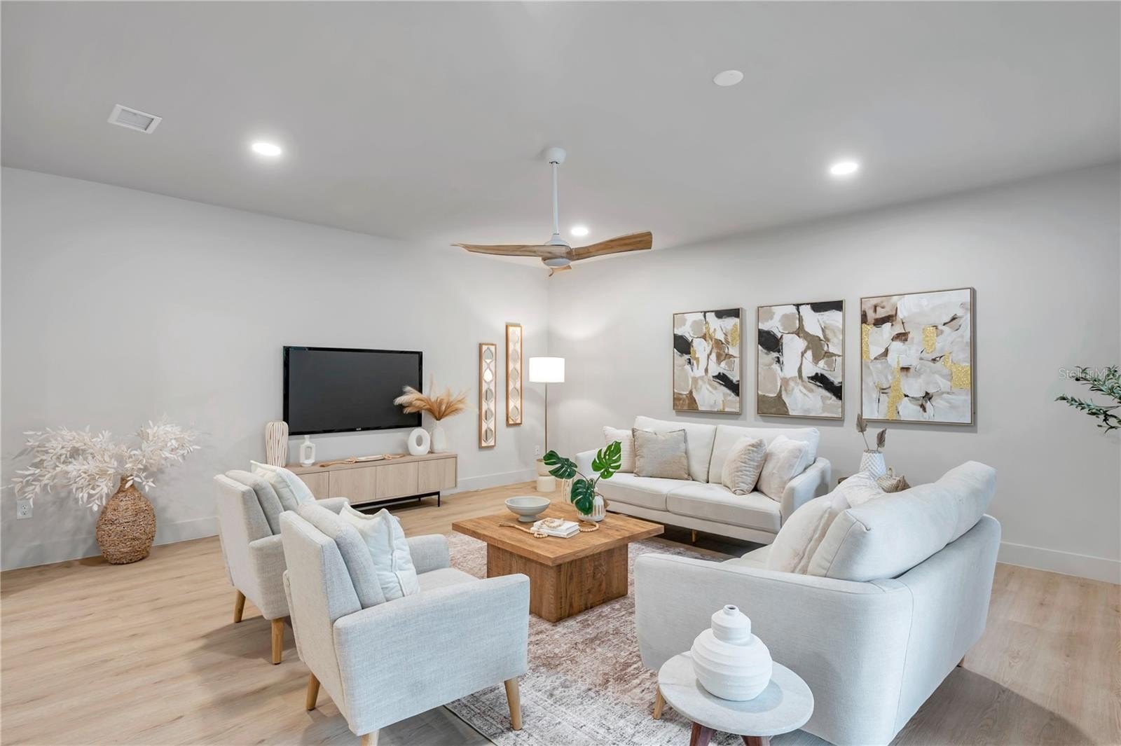 Step inside to an open-concept floor plan with expansive living and dining areas, wide-plank flooring, and abundant natural light through newer impact-rated Low-E windows. The designer kitchen features custom wood cabinetry, quartz countertops, stainless steel appliances, and a large island—perfect for entertaining.