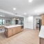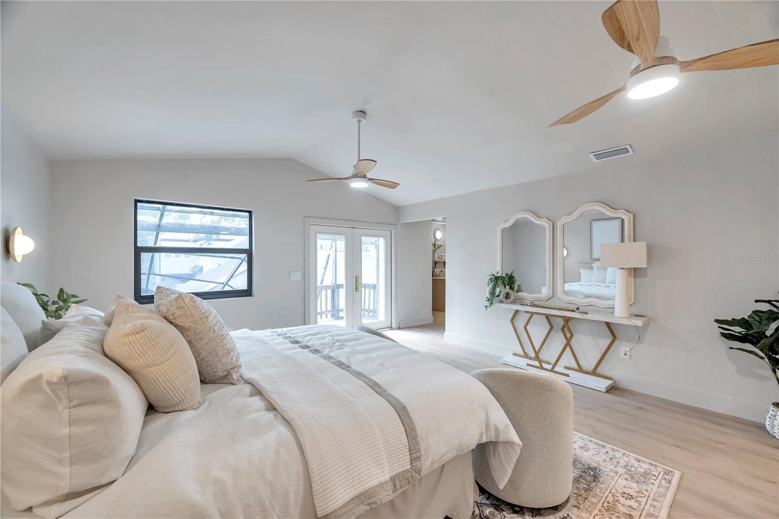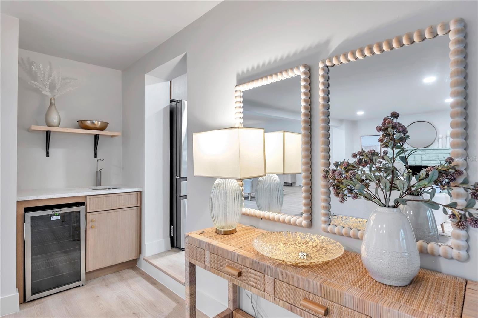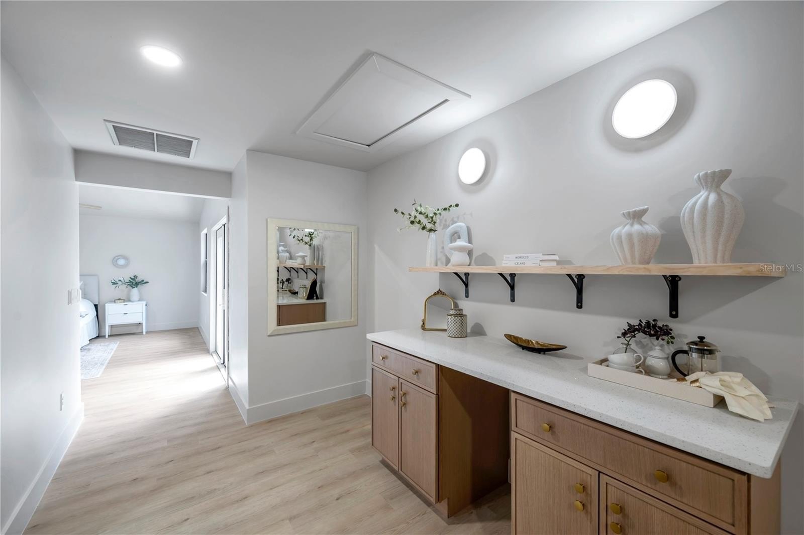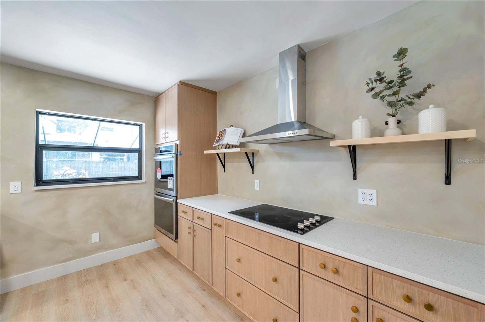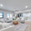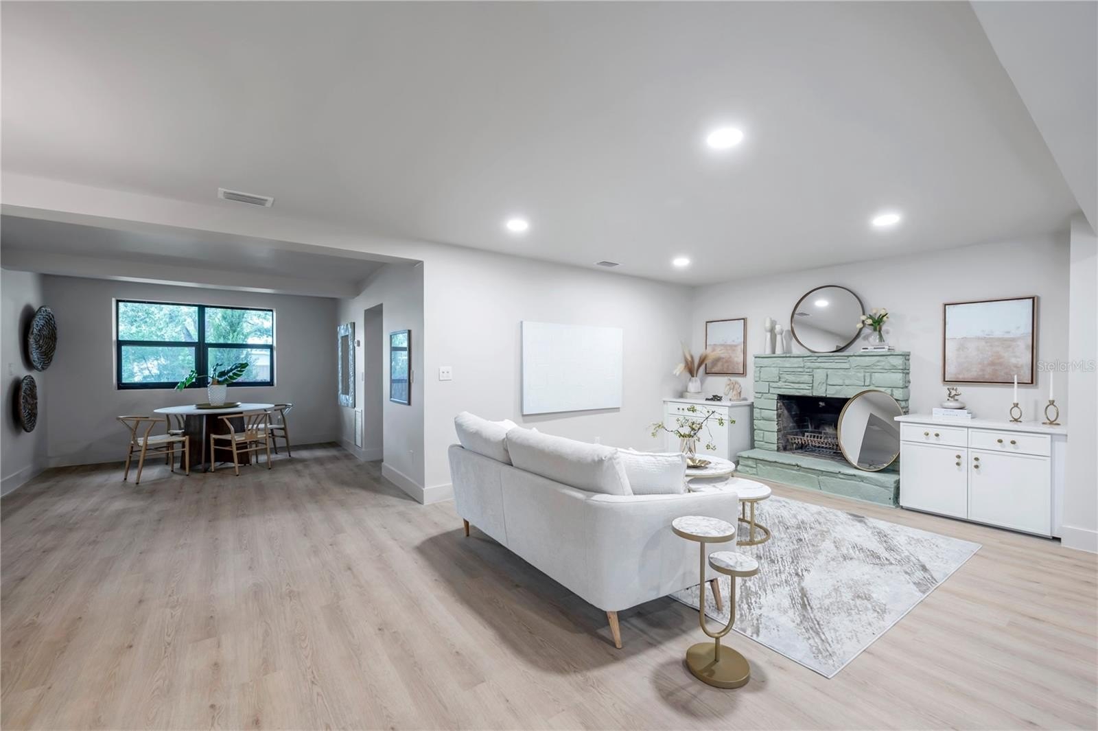 Step inside to an open-concept floor plan with expansive living and dining areas, wide-plank flooring, and abundant natural light through newer impact-rated Low-E windows. The designer kitchen features custom wood cabinetry, quartz countertops, stainless steel appliances, and a large island—perfect for entertaining.
