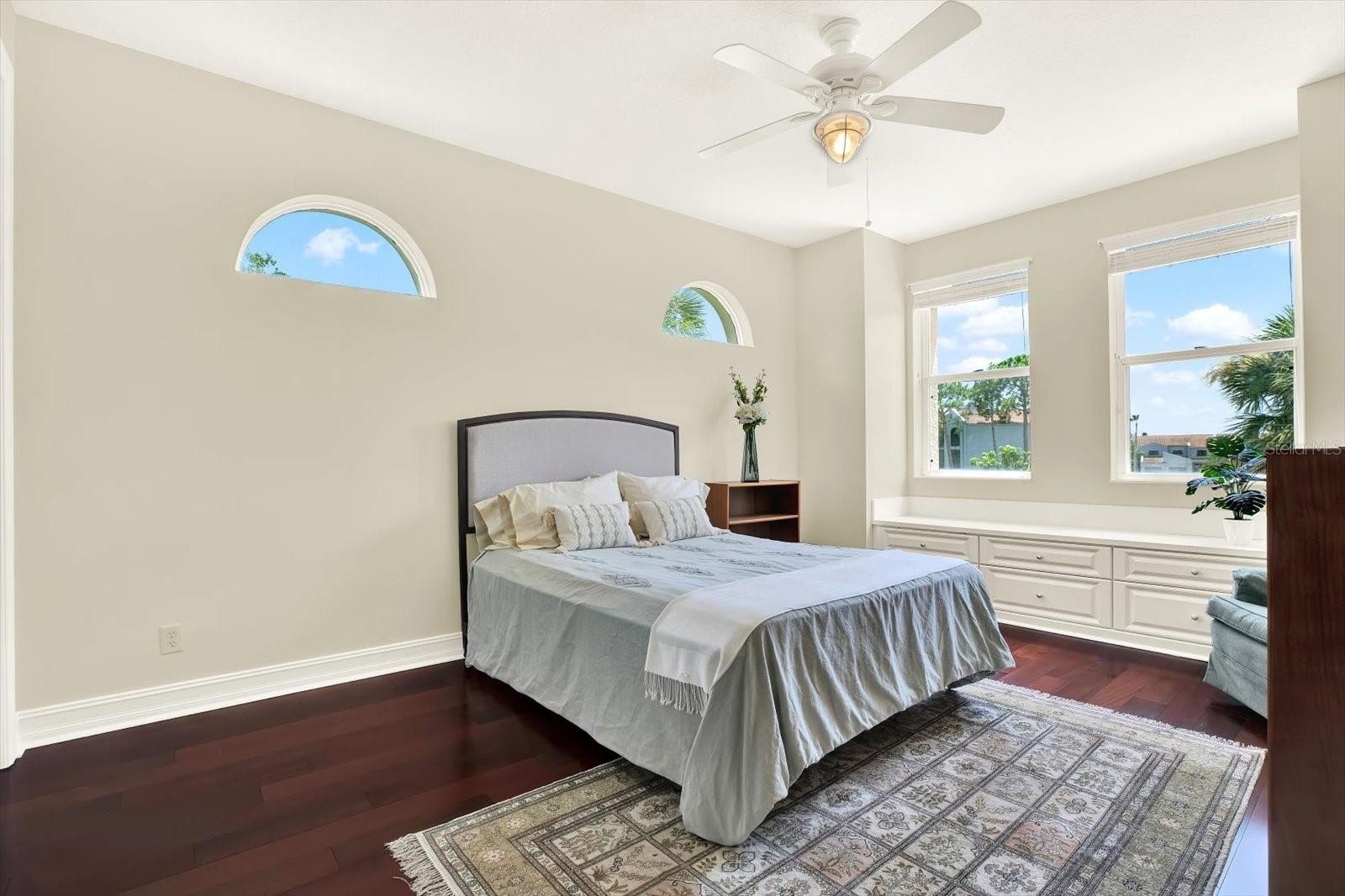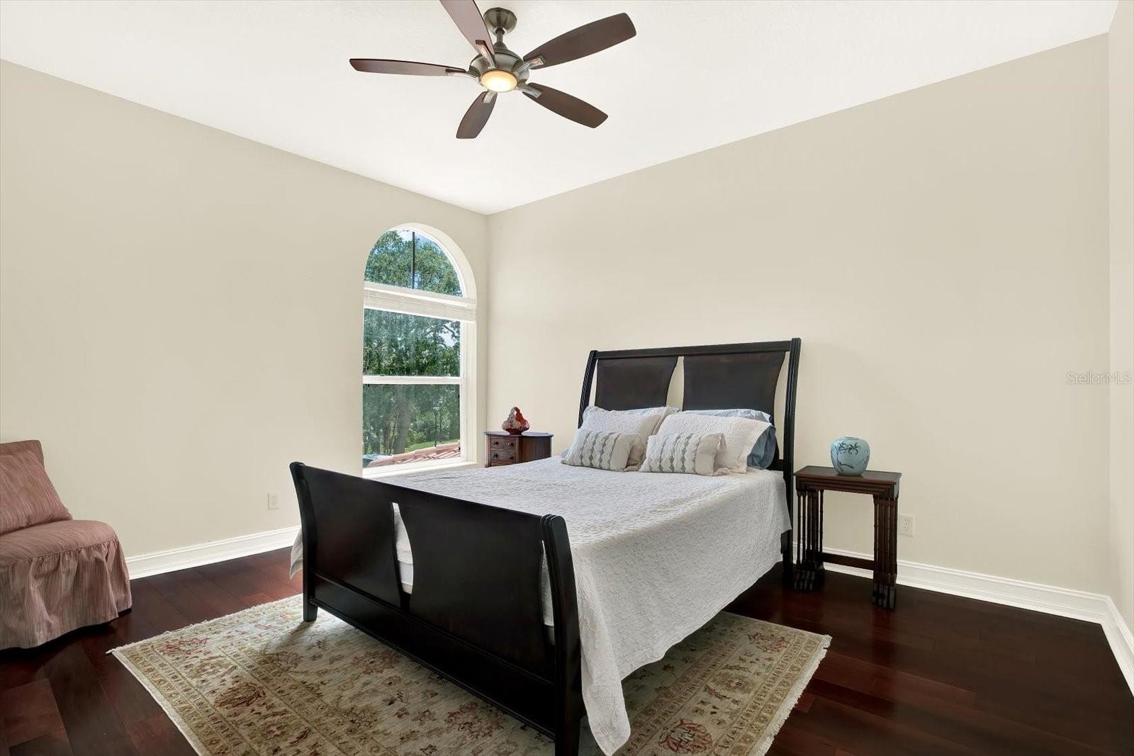 The second level split floor plan begins with an EXPANSIVE PRIMARY SUITE which features a double door entrance, high ceilings and a PRIVATE BALCONY offering TRANQUIL WATER VIEWS of the pond. The entrance to the EN SUITE BATHROOM includes a LARGE WALK-IN CLOSET and an additional closet for plenty of storage use. The large primary en suite features dual sinks, a soaking tub, a separate shower and water closet, all adorned with granite countertops. Past the landing/desk area you will find two additional bedrooms with closets containing built in shelving and a second full bathroom with dual sinks.