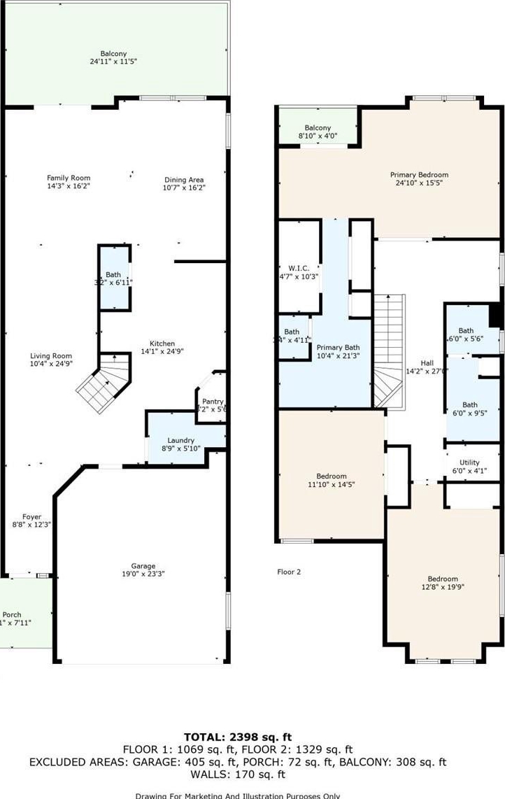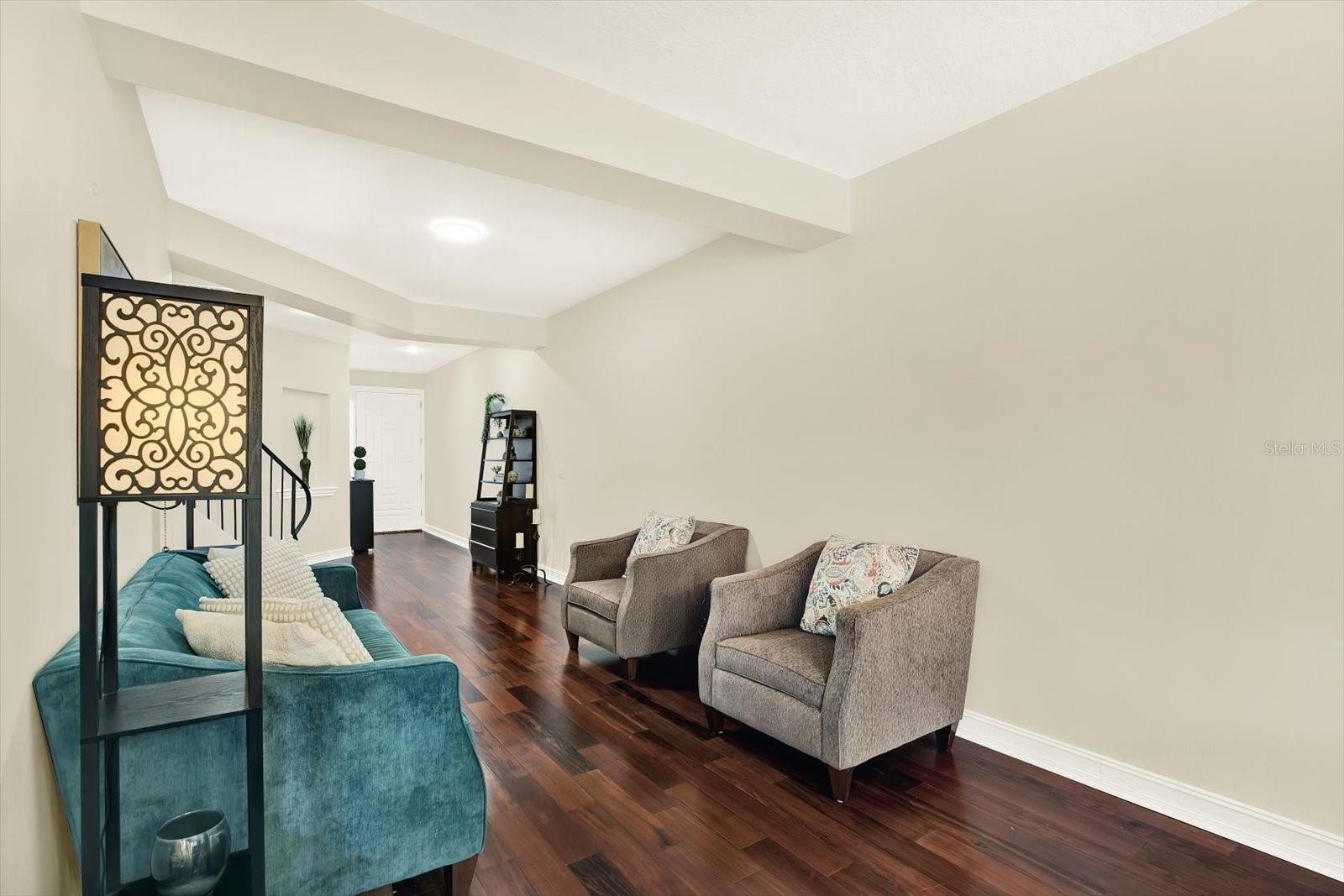 Convenience is key with a two-piece bathroom located downstairs, alongside an additional bonus sitting area open to the dining room. Ascend the beautiful wrought iron staircase to find a loft landing featuring built-in shelving and a functional desk area, perfect for work or study.