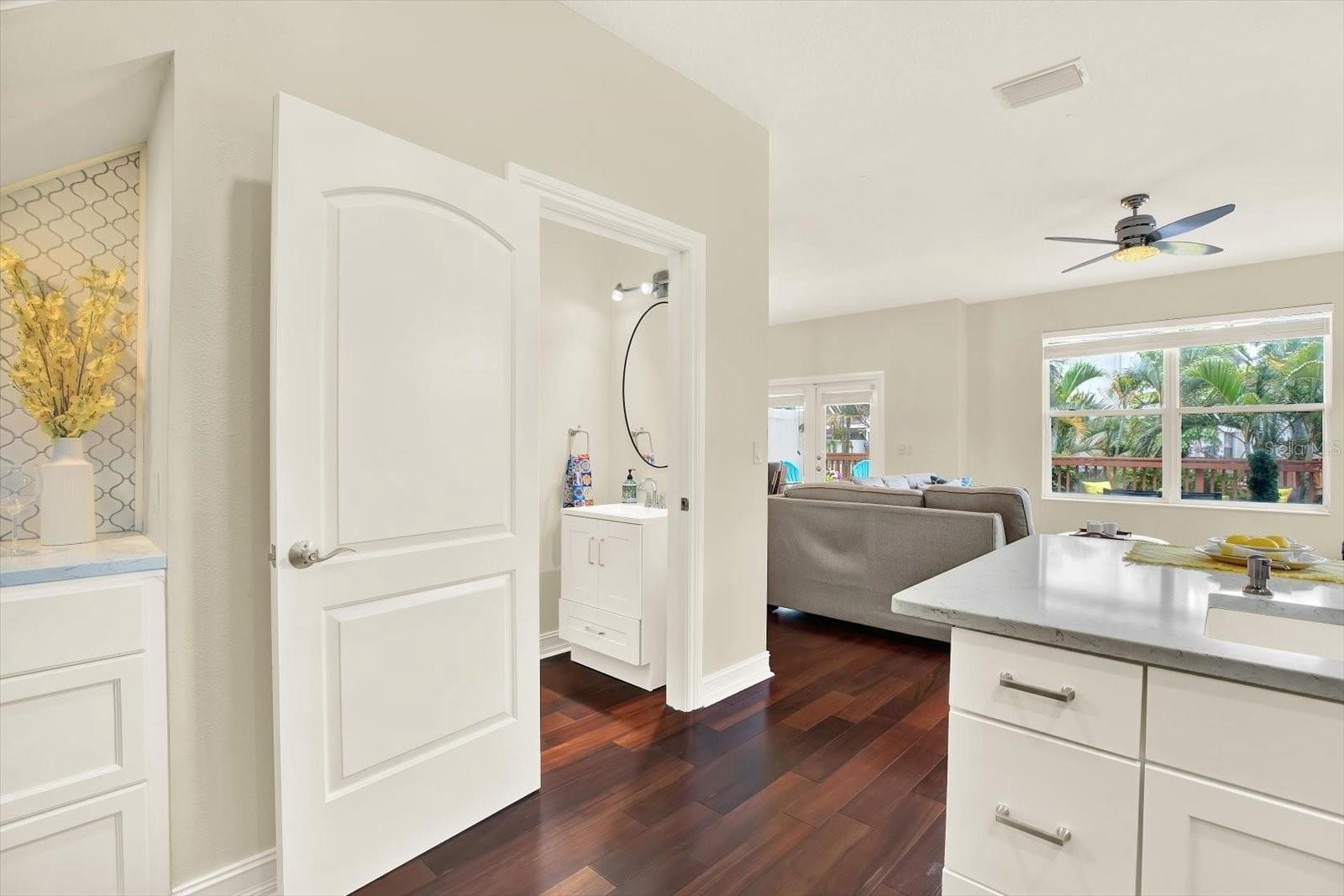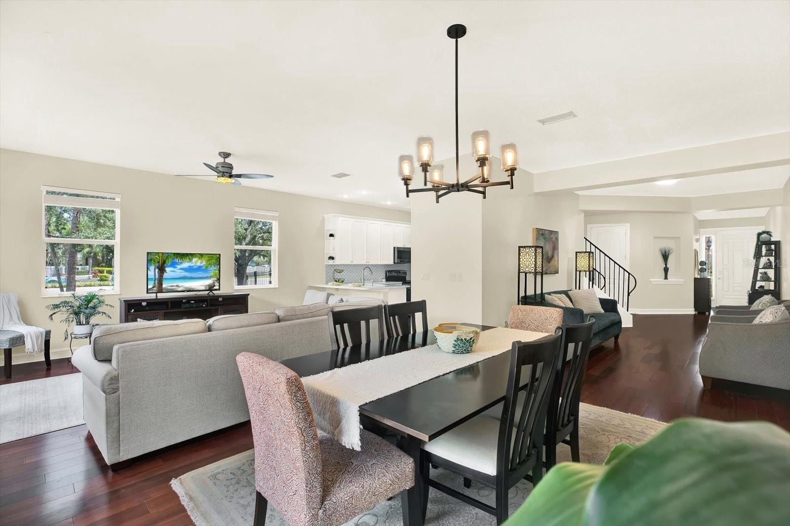 The water view of the pond from the large patio deck is ideal for entertaining or relaxing. The OPEN CONCEPT design seamlessly connects the living room, dining room, and UPDATED KITCHEN, which boasts stainless steel appliances, a wine fridge with built in bar area, luxurious QUARTZ COUNTERTOPS, shaker cabinets, and a convenient WALK-IN PANTRY for ample storage. This home has a WATER SOFTENER and a large LAUNDRY ROOM off the kitchen with washer & dryer a wash sink and cabinetry.