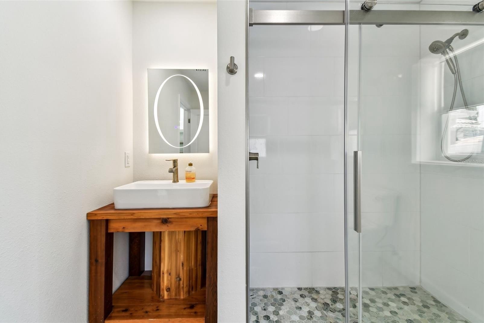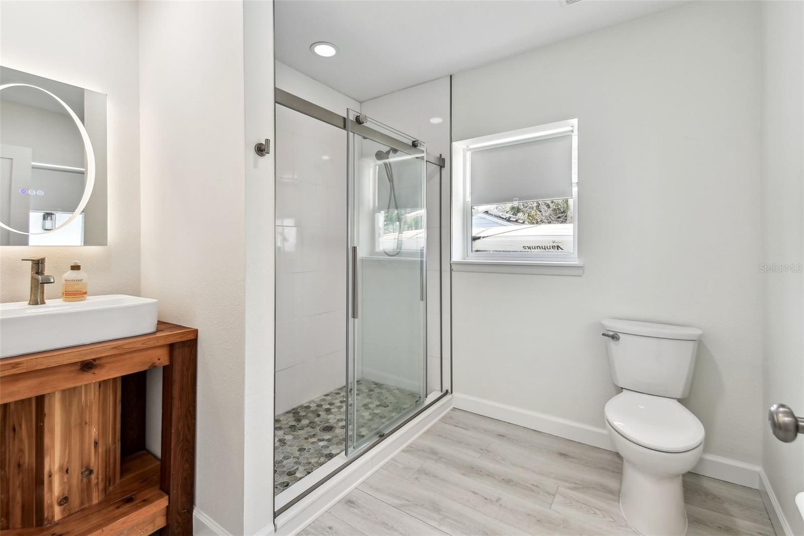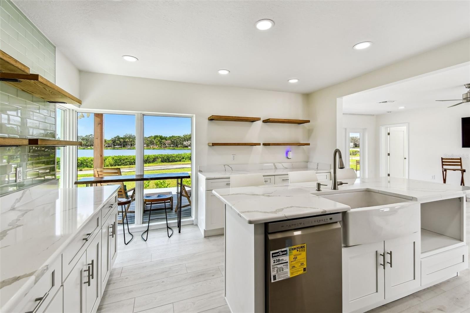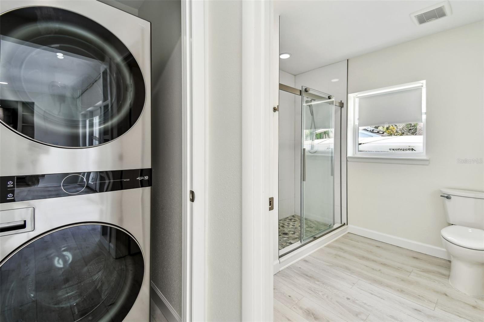 Inside, you’ll find an oversized living room that flows into a spacious open-concept kitchen, ideal for entertaining. The kitchen features quartz countertops, LG stainless steel appliances—including a gas range with built-in air fryer—pristine cabinetry, exposed wood shelving, and a stylish backsplash. The primary suite includes a luxurious en suite bath with a double-headed shower for a spa-like experience.