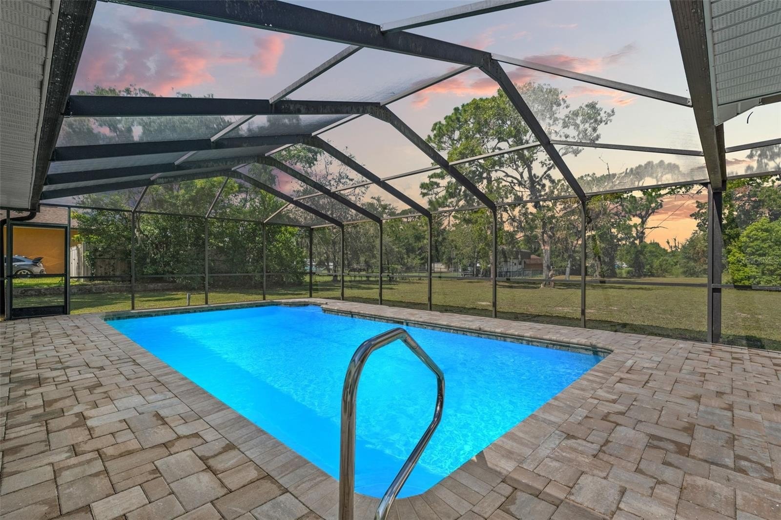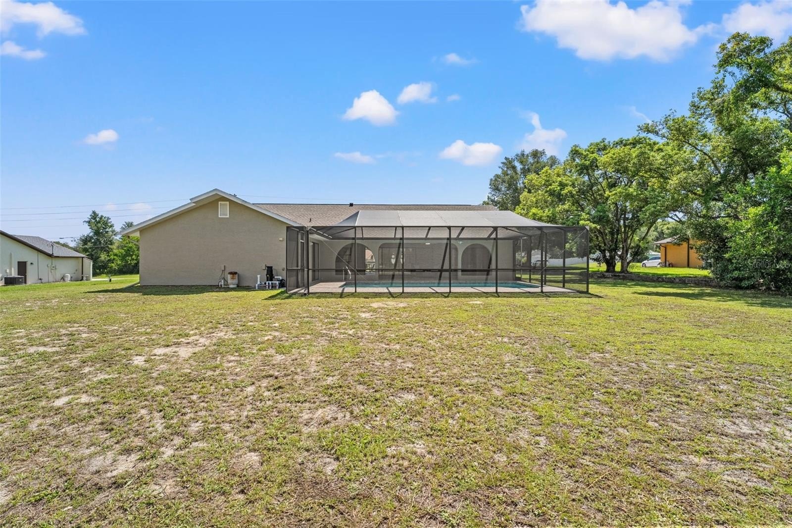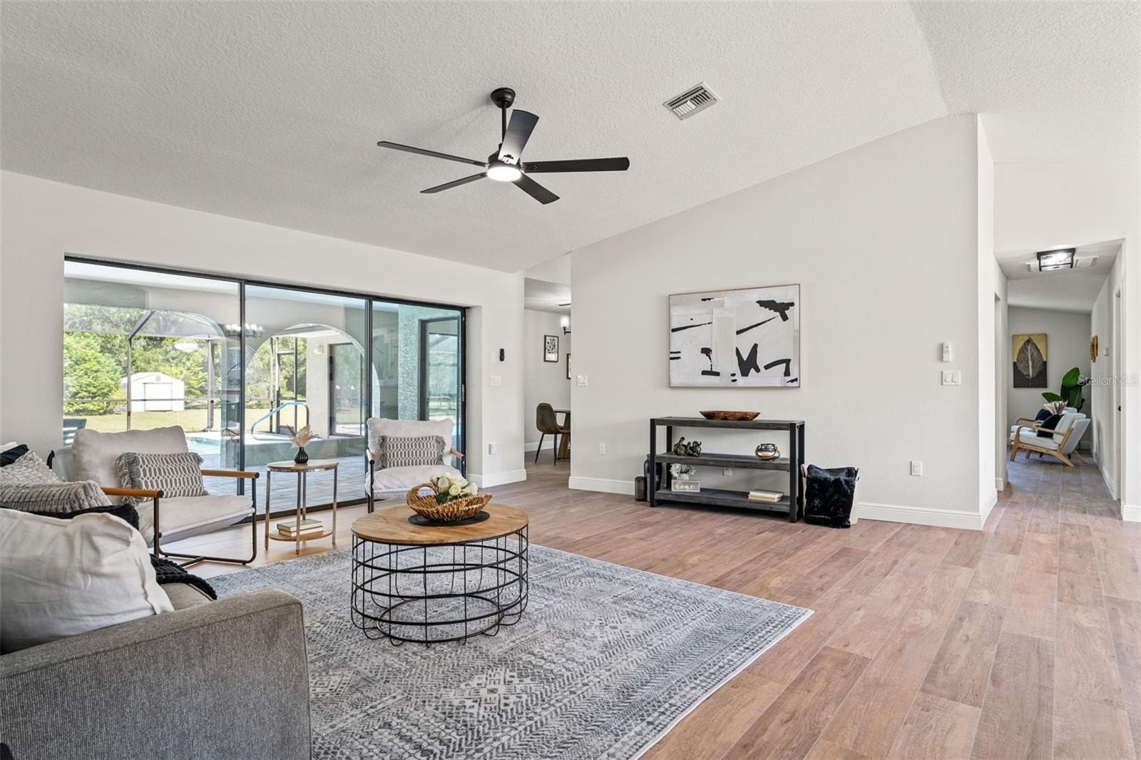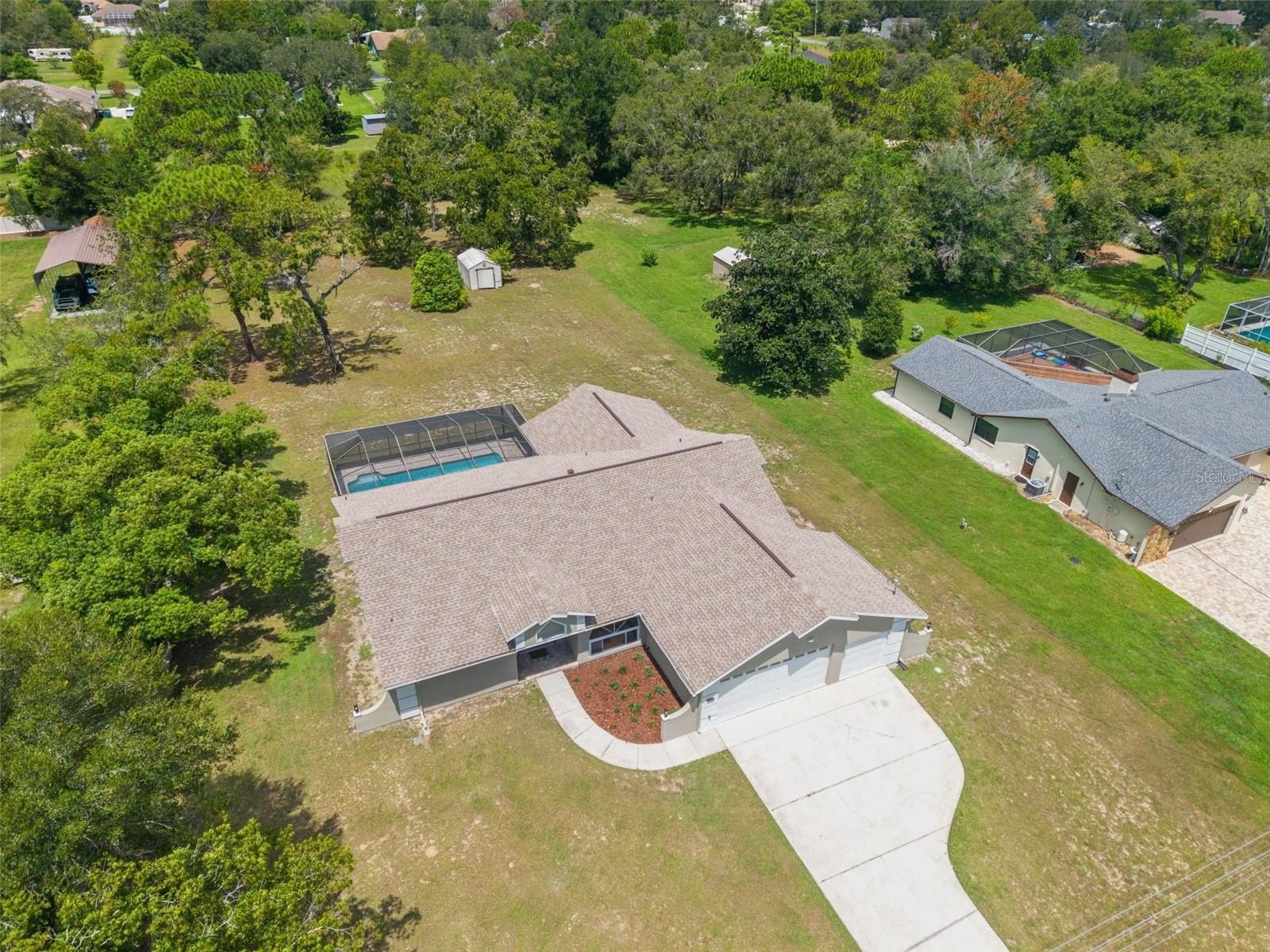 Sitting on a 0.86 acre lot, this absolutely gorgeous fully renovated POOL home is now available! Worry free here as the ROOF IS BRAND NEW! Upon entry into this home, you are greeted with an open living room, tall ceilings, and a direct view of the pool through the fully collapsible pocket sliders. With brand new flooring throughout and tons of natural light, this home feels so spacious and inviting. The stunning kitchen is a chef's dream! All new soft close cabinets, luxury countertops, new stainless steel appliances, a deep sink, and a giant breakfast bar. Sharing a room with the kitchen is a second full living room - perfect for entertaining! There are multiple dining options here in this home: the formal dining room, nook table in the kitchen, breakfast bar, or dine outside on the huge pool deck. The primary bedroom boasts a beautiful private view of the pool and backyard through the sliders. Featuring a huge walk-in closet and en suite bathroom, this primary is a true owner's retreat! The bathroom has a large brand new walk-in shower with frameless glass, a shower niche for storage, double vanities, and a separate water closet for privacy. Both guest bedrooms are generously sized and both have large walk in closets. One of the bedrooms has another set of sliders that lead onto the pool deck. The guest bathroom is also the pool bathroom, making for efficient use and convenience. This large sparkling blue pool has a brand new pool pump and new marcite! New pavers were just installed around the entire pool and lanai. Enjoy cooking outside on the grill, as there is a brand new outdoor sink station with cabinets and countertops to use! This home features a spacious laundry room with built-in cabinetry, a utility sink, and plenty of space for storage. Not only does this property have an extra long 3 car garage (28 feet deep!), it also has an expansive driveway for parking multiple vehicles if needed! Additional items in this home that are BRAND NEW are: hot water heater, all interior doors, all baseboards, inside and outside paint, light fixtures, ceiling fans, and shelving. No HOA, No CDD, and No flood insurance required here! This location is a dream as it's just 2 minutes to the Suncoast Parkway, Target, Publix, Walmart, and lots of restaurants. Hop on the Suncoast Parkway and you'll be at Tampa International Airport in just 45 minutes. Come see this beautiful home in a highly desirable location!