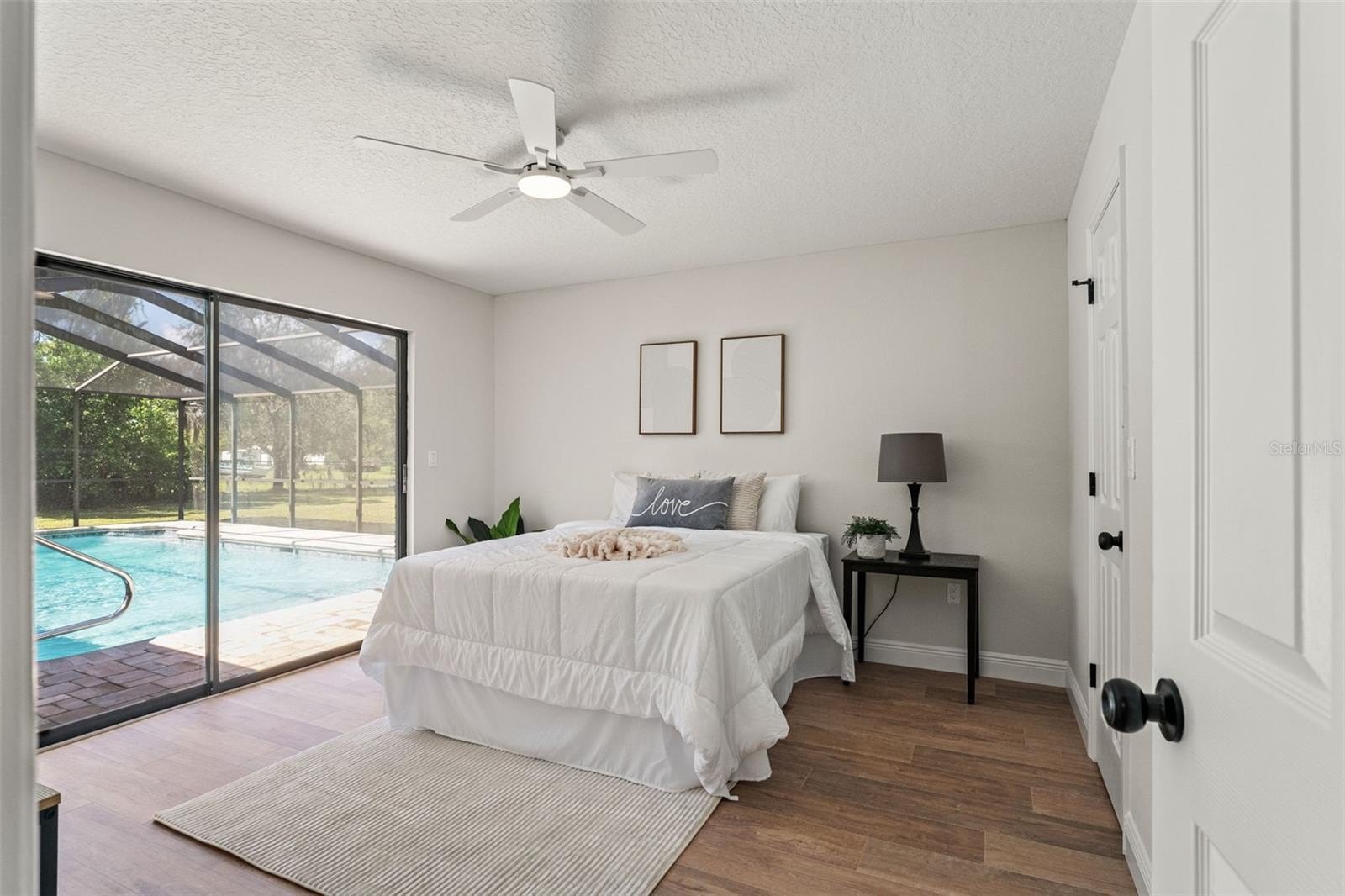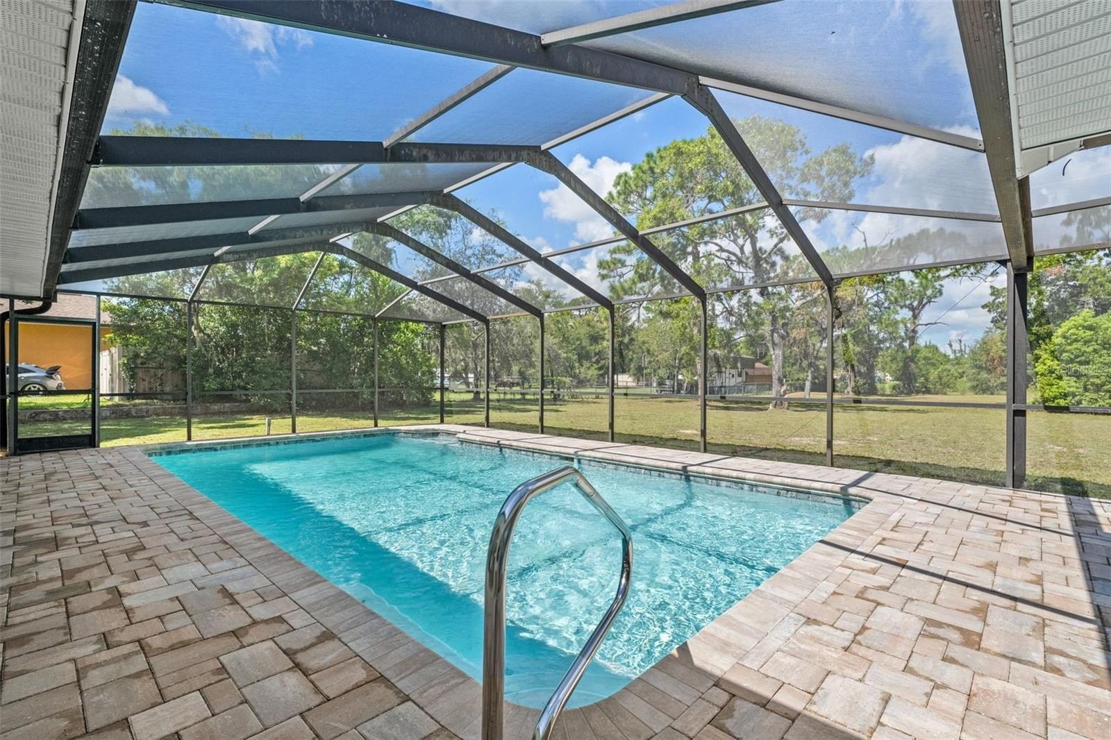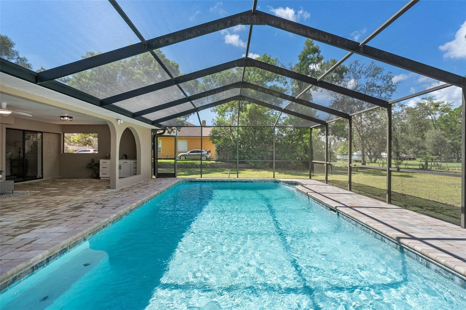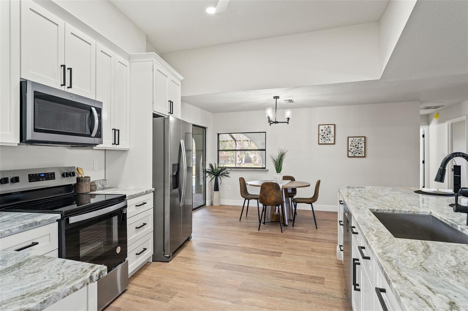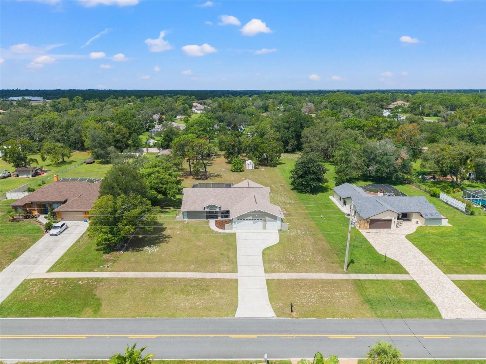 Sitting on a 0.86 acre lot, this absolutely gorgeous fully renovated POOL home is now available! Worry free here as the ROOF IS BRAND NEW! Upon entry into this home, you are greeted with an open living room, tall ceilings, and a direct view of the pool through the fully collapsible pocket sliders. With brand new flooring throughout and tons of natural light, this home feels so spacious and inviting. The stunning kitchen is a chef's dream! All new soft close cabinets, luxury countertops, new stainless steel appliances, a deep sink, and a giant breakfast bar. Sharing a room with the kitchen is a second full living room - perfect for entertaining! There are multiple dining options here in this home: the formal dining room, nook table in the kitchen, breakfast bar, or dine outside on the huge pool deck. The primary bedroom boasts a beautiful private view of the pool and backyard through the sliders. Featuring a huge walk-in closet and en suite bathroom, this primary is a true owner's retreat! The bathroom has a large brand new walk-in shower with frameless glass, a shower niche for storage, double vanities, and a separate water closet for privacy. Both guest bedrooms are generously sized and both have large walk in closets. One of the bedrooms has another set of sliders that lead onto the pool deck. The guest bathroom is also the pool bathroom, making for efficient use and convenience. This large sparkling blue pool has a brand new pool pump and new marcite! New pavers were just installed around the entire pool and lanai. Enjoy cooking outside on the grill, as there is a brand new outdoor sink station with cabinets and countertops to use! This home features a spacious laundry room with built-in cabinetry, a utility sink, and plenty of space for storage. Not only does this property have an extra long 3 car garage (28 feet deep!), it also has an expansive driveway for parking multiple vehicles if needed! Additional items in this home that are BRAND NEW are: hot water heater, all interior doors, all baseboards, inside and outside paint, light fixtures, ceiling fans, and shelving. No HOA, No CDD, and No flood insurance required here! This location is a dream as it's just 2 minutes to the Suncoast Parkway, Target, Publix, Walmart, and lots of restaurants. Hop on the Suncoast Parkway and you'll be at Tampa International Airport in just 45 minutes. Come see this beautiful home in a highly desirable location!
