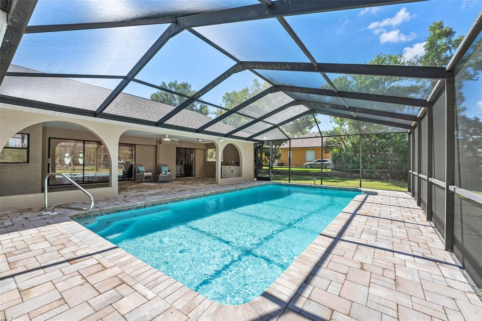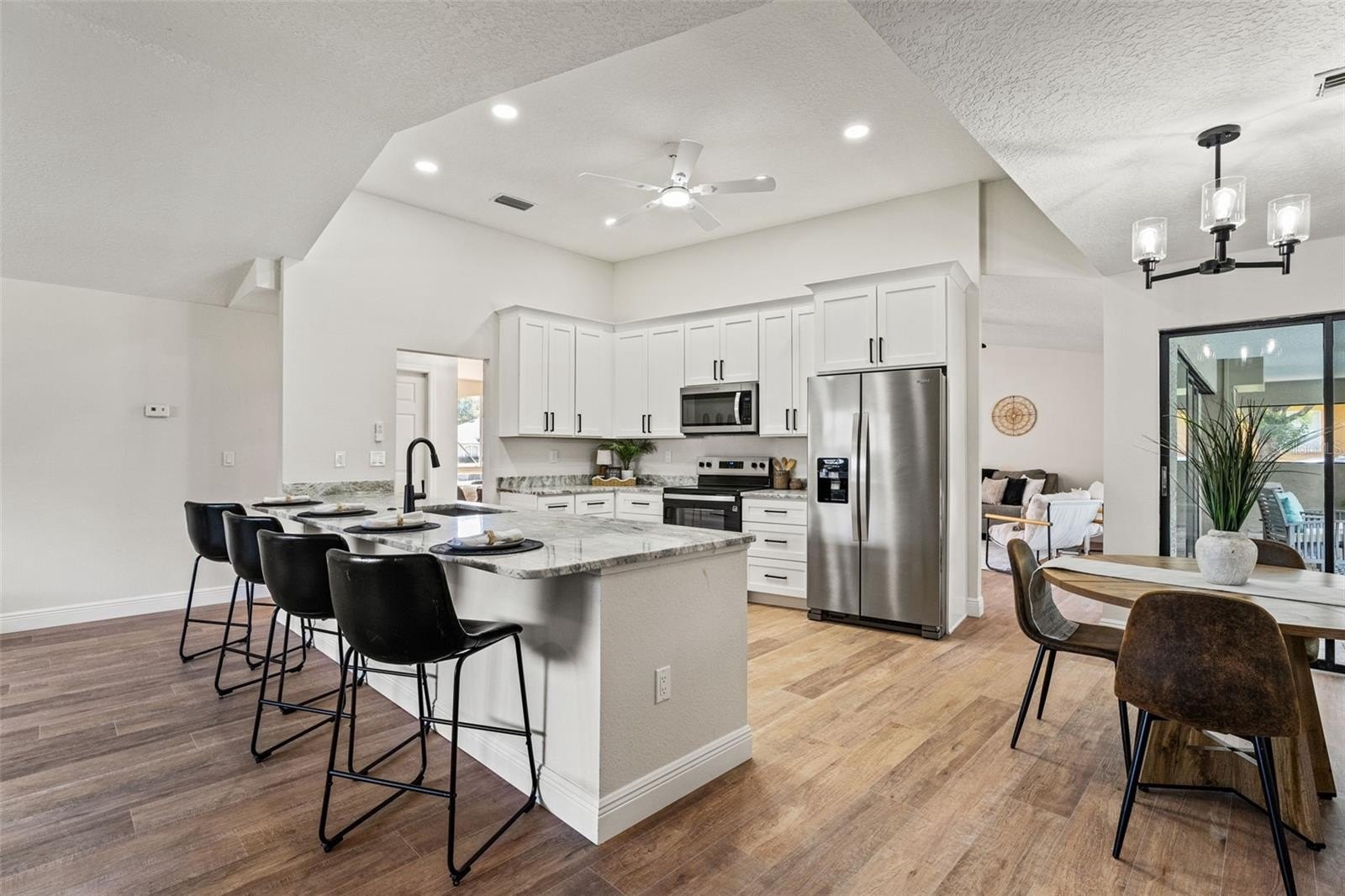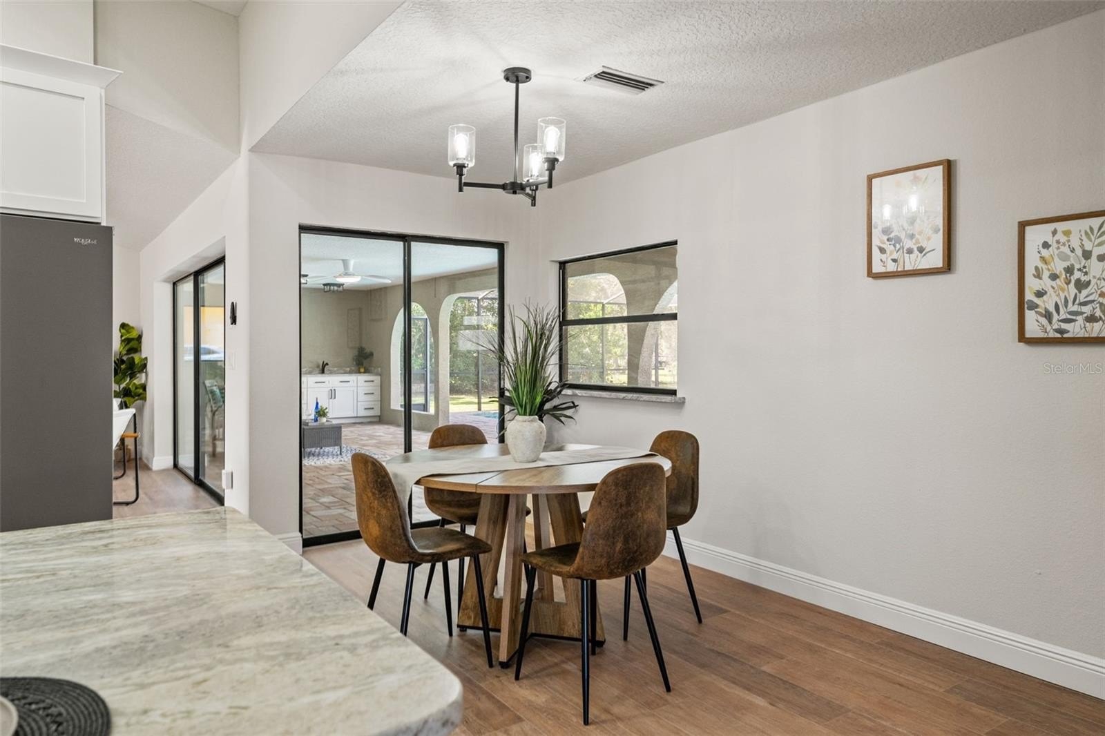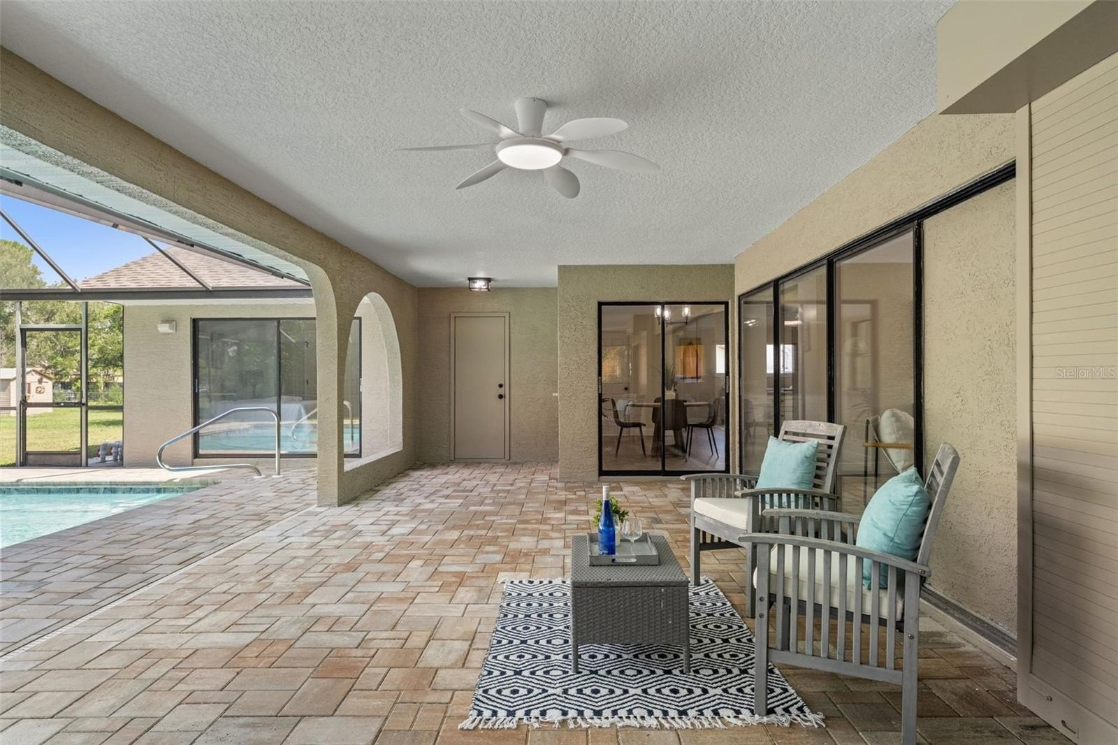Sitting on a 0.86 acre lot, this absolutely gorgeous fully renovated POOL home is now available! Worry free here as the ROOF IS BRAND NEW! Upon entry into this home, you are greeted with an open living room, tall ceilings, and a direct view of the pool through the fully collapsible pocket sliders. With brand new flooring throughout and tons of natural light, this home feels so spacious and inviting. The stunning kitchen is a chef's dream! All new soft close cabinets, luxury countertops, new stainless steel appliances, a deep sink, and a giant breakfast bar. Sharing a room with the kitchen is a second full living room - perfect for entertaining! There are multiple dining options here in this home: the formal dining room, nook table in the kitchen, breakfast bar, or dine outside on the huge pool deck. The primary bedroom boasts a beautiful private view of the pool and backyard through the sliders. Featuring a huge walk-in closet and en suite bathroom, this primary is a true owner's retreat! The bathroom has a large brand new walk-in shower with frameless glass, a shower niche for storage, double vanities, and a separate water closet for privacy. Both guest bedrooms are generously sized and both have large walk in closets. One of the bedrooms has another set of sliders that lead onto the pool deck. The guest bathroom is also the pool bathroom, making for efficient use and convenience. This large sparkling blue pool has a brand new pool pump and new marcite! New pavers were just installed around the entire pool and lanai. Enjoy cooking outside on the grill, as there is a brand new outdoor sink station with cabinets and countertops to use! This home features a spacious laundry room with built-in cabinetry, a utility sink, and plenty of space for storage. Not only does this property have an extra long 3 car garage (28 feet deep!), it also has an expansive driveway for parking multiple vehicles if needed! Additional items in this home that are BRAND NEW are: hot water heater, all interior doors, all baseboards, inside and outside paint, light fixtures, ceiling fans, and shelving. No HOA, No CDD, and No flood insurance required here! This location is a dream as it's just 2 minutes to the Suncoast Parkway, Target, Publix, Walmart, and lots of restaurants. Hop on the Suncoast Parkway and you'll be at Tampa International Airport in just 45 minutes. Come see this beautiful home in a highly desirable location!