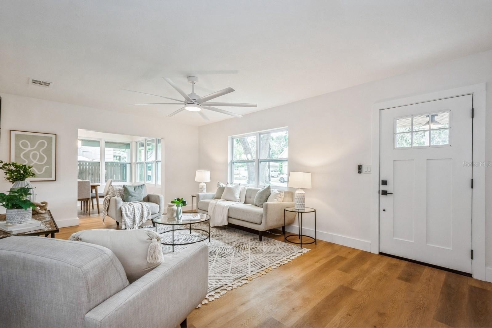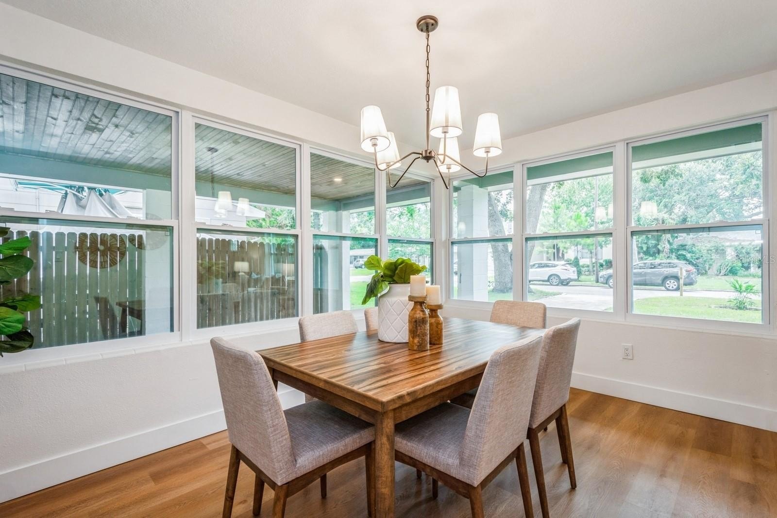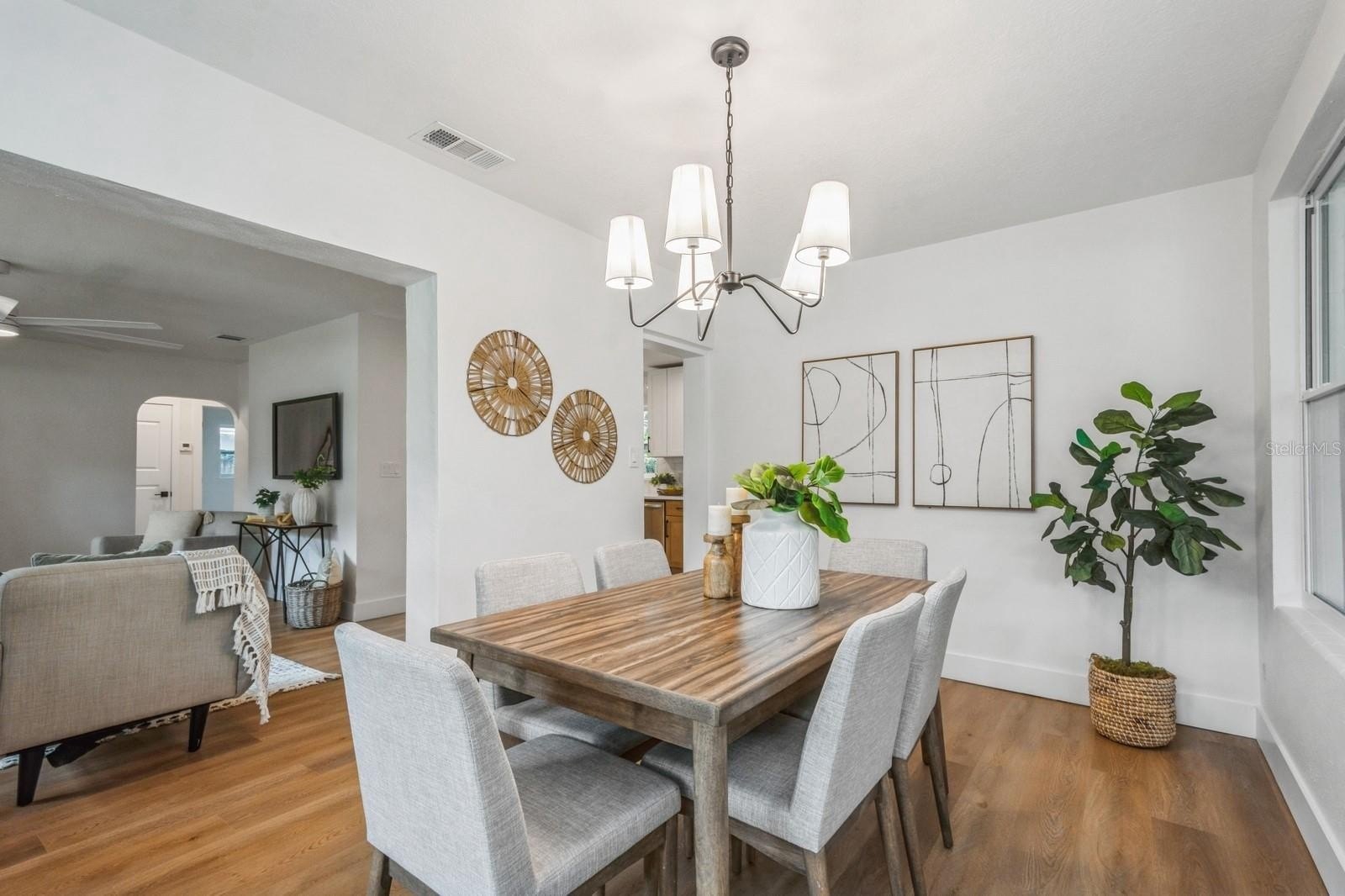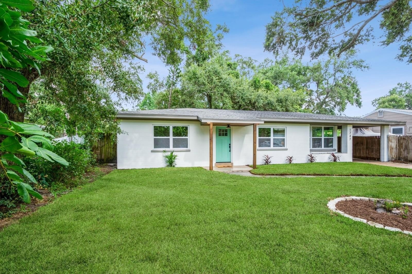 This fully remodeled 2 bedroom, 1.5 bathroom single story home is in a prime location just minutes from the many shops and restaurants of downtown Dunedin! Designer finishes and new luxury vinyl plank flooring are found throughout the home, which has a great floor plan perfect for living and entertaining. The spacious and bright living room is open to the kitchen which features new shaker cabinets, quartz counters, new stainless appliances and space for an eat-in area. Laundry and a chic powder bathroom are just off the kitchen, which also leads out to the covered car port with new tongue-and-groove ceiling. A separate dining room surrounded by windows streams in natural light. Two spacious bedrooms share the full bathroom which has a new tiled shower. The spacious fenced backyard has a seashell gravel patio and ample space for a pool. Other features include new impact-rated vinyl windows throughout, updated electrical and newer HVAC (2020) and water heater (2022), and a large storage room at the back of the car port. This home is nestled in a golf cart-friendly neighborhood of picturesque homes which the Pinellas Bike Trail runs right through. It is also a short stroll to Hammock Park, Dunedin Golf Club and Honeymoon Island. This home sat HIGH AND DRY with NO FLOODING OR STORM DAMAGE during Helene and Milton.
