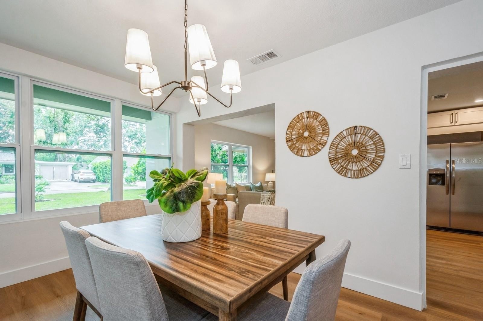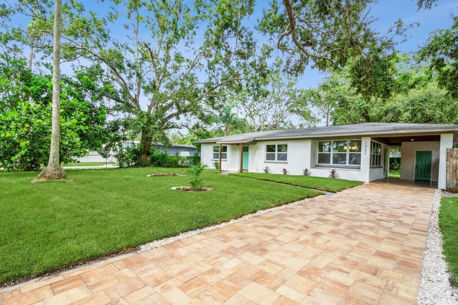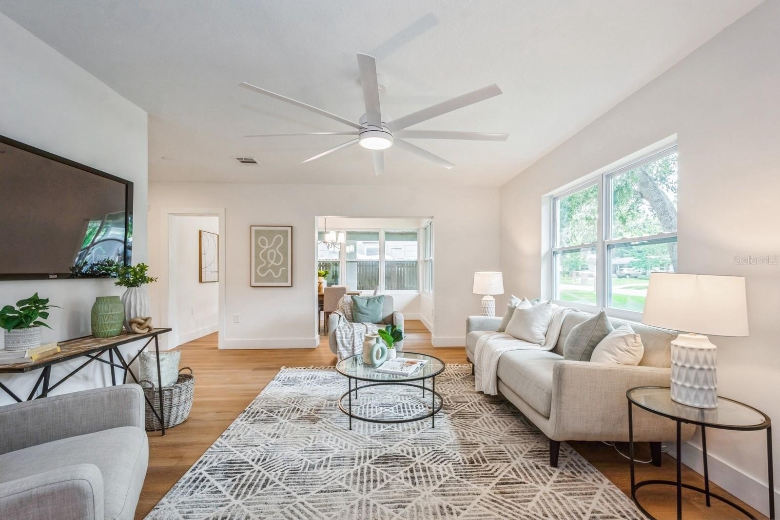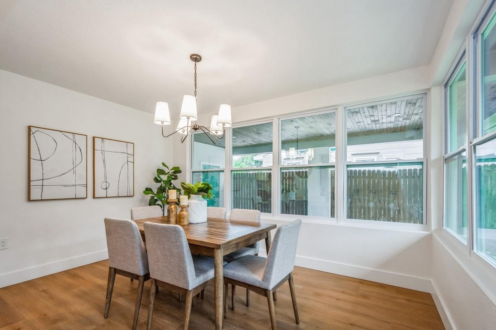 This fully remodeled 2 bedroom, 1.5 bathroom single story home is in a prime location just minutes from the many shops and restaurants of downtown Dunedin! Designer finishes and new luxury vinyl plank flooring are found throughout the home, which has a great floor plan perfect for living and entertaining. The spacious and bright living room is open to the kitchen which features new shaker cabinets, quartz counters, new stainless appliances and space for an eat-in area. Laundry and a chic powder bathroom are just off the kitchen, which also leads out to the covered car port with new tongue-and-groove ceiling. A separate dining room surrounded by windows streams in natural light. Two spacious bedrooms share the full bathroom which has a new tiled shower. The spacious fenced backyard has a seashell gravel patio and ample space for a pool. Other features include new impact-rated vinyl windows throughout, updated electrical and newer HVAC (2020) and water heater (2022), and a large storage room at the back of the car port. This home is nestled in a golf cart-friendly neighborhood of picturesque homes which the Pinellas Bike Trail runs right through. It is also a short stroll to Hammock Park, Dunedin Golf Club and Honeymoon Island. This home sat HIGH AND DRY with NO FLOODING OR STORM DAMAGE during Helene and Milton.