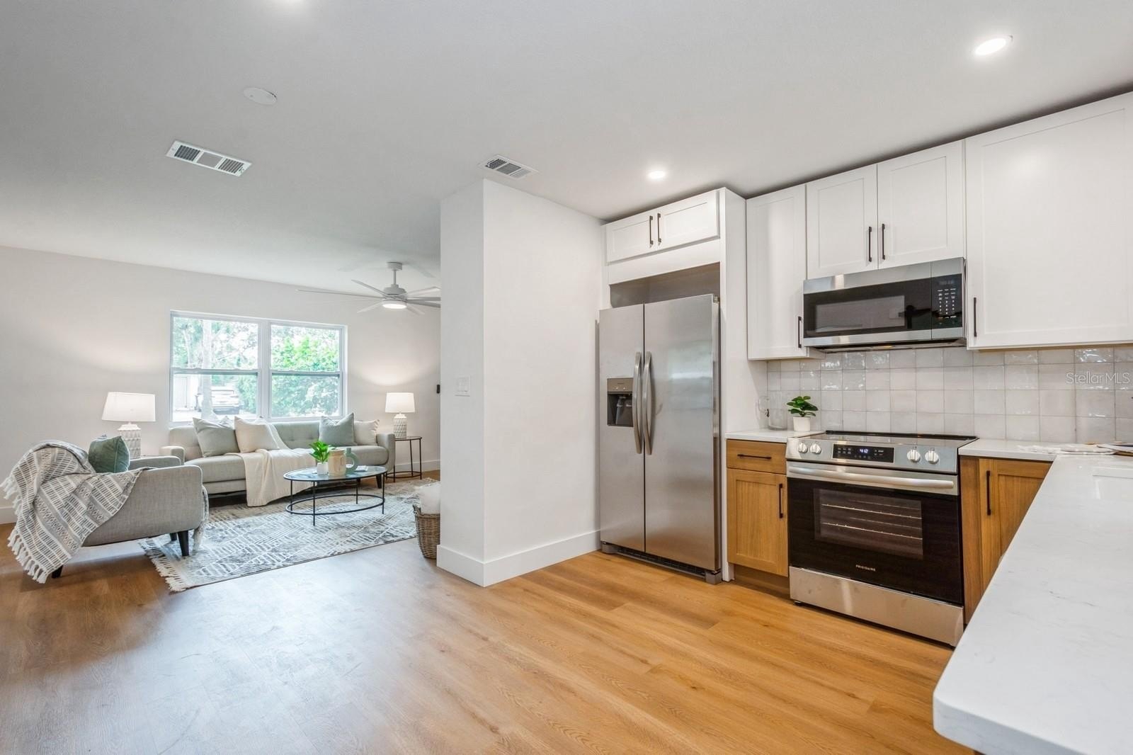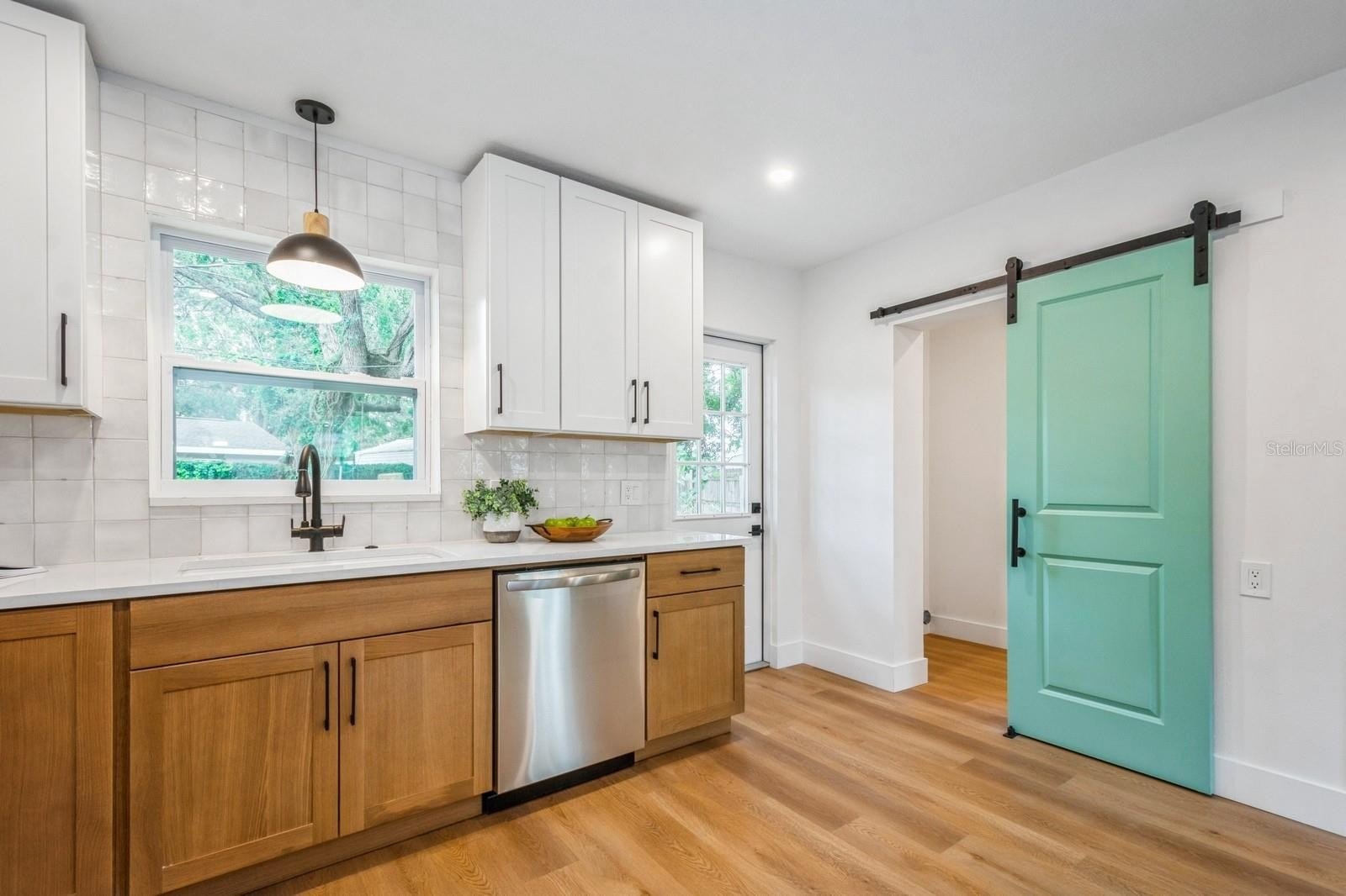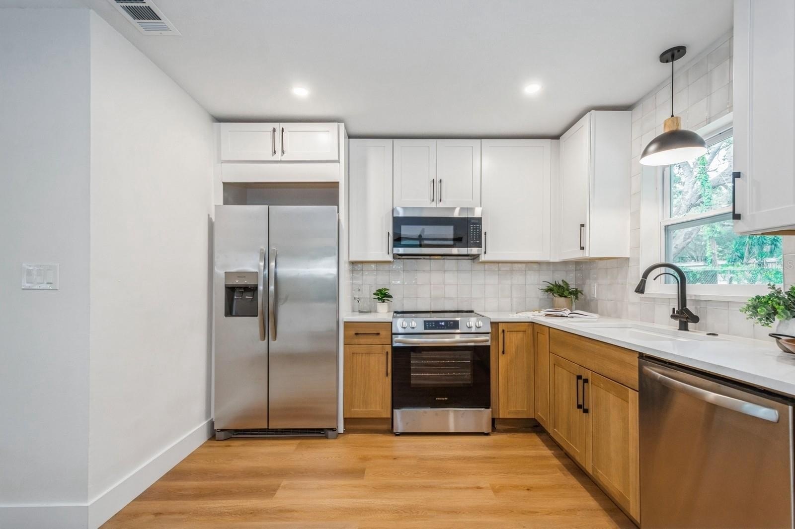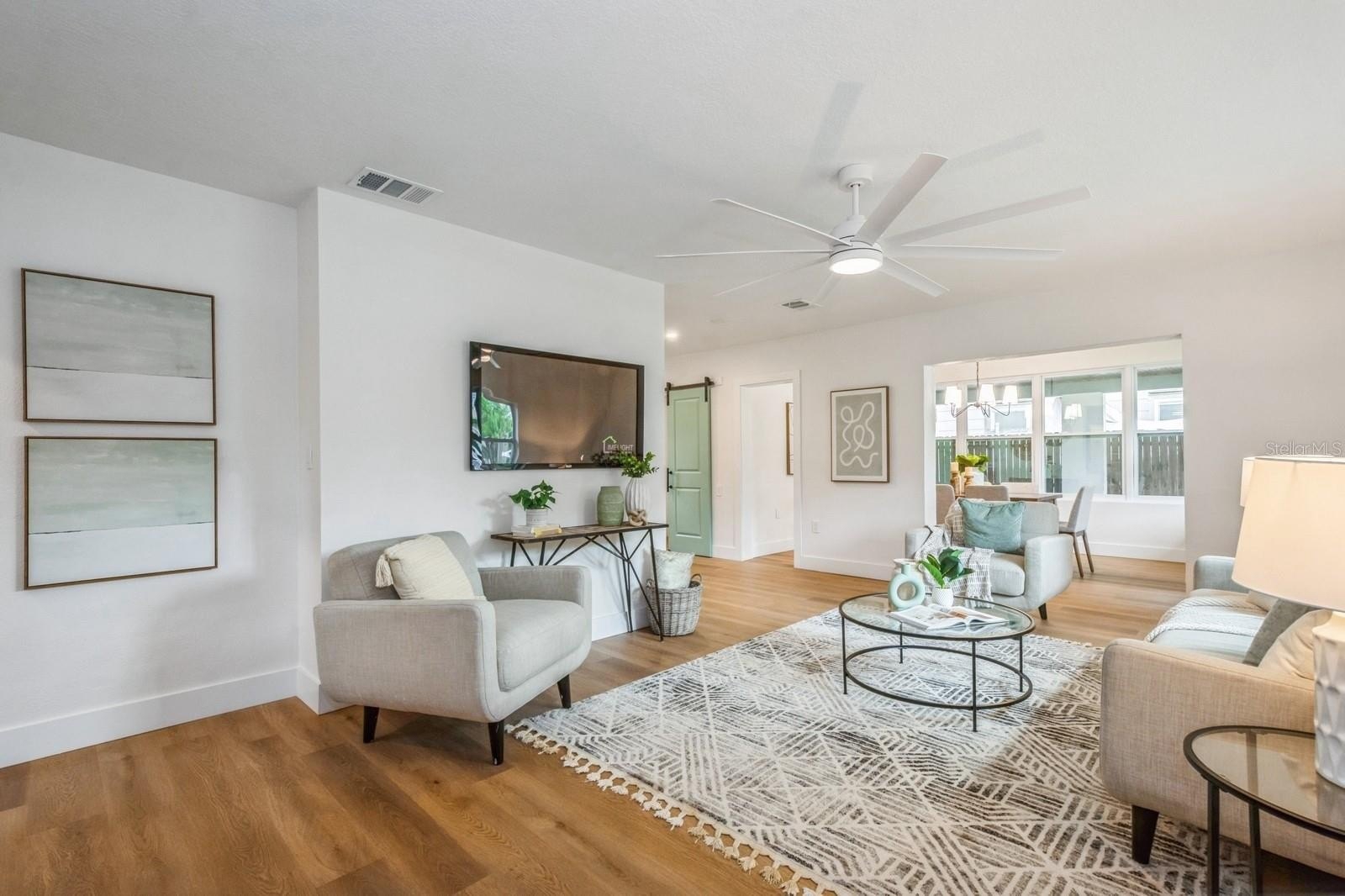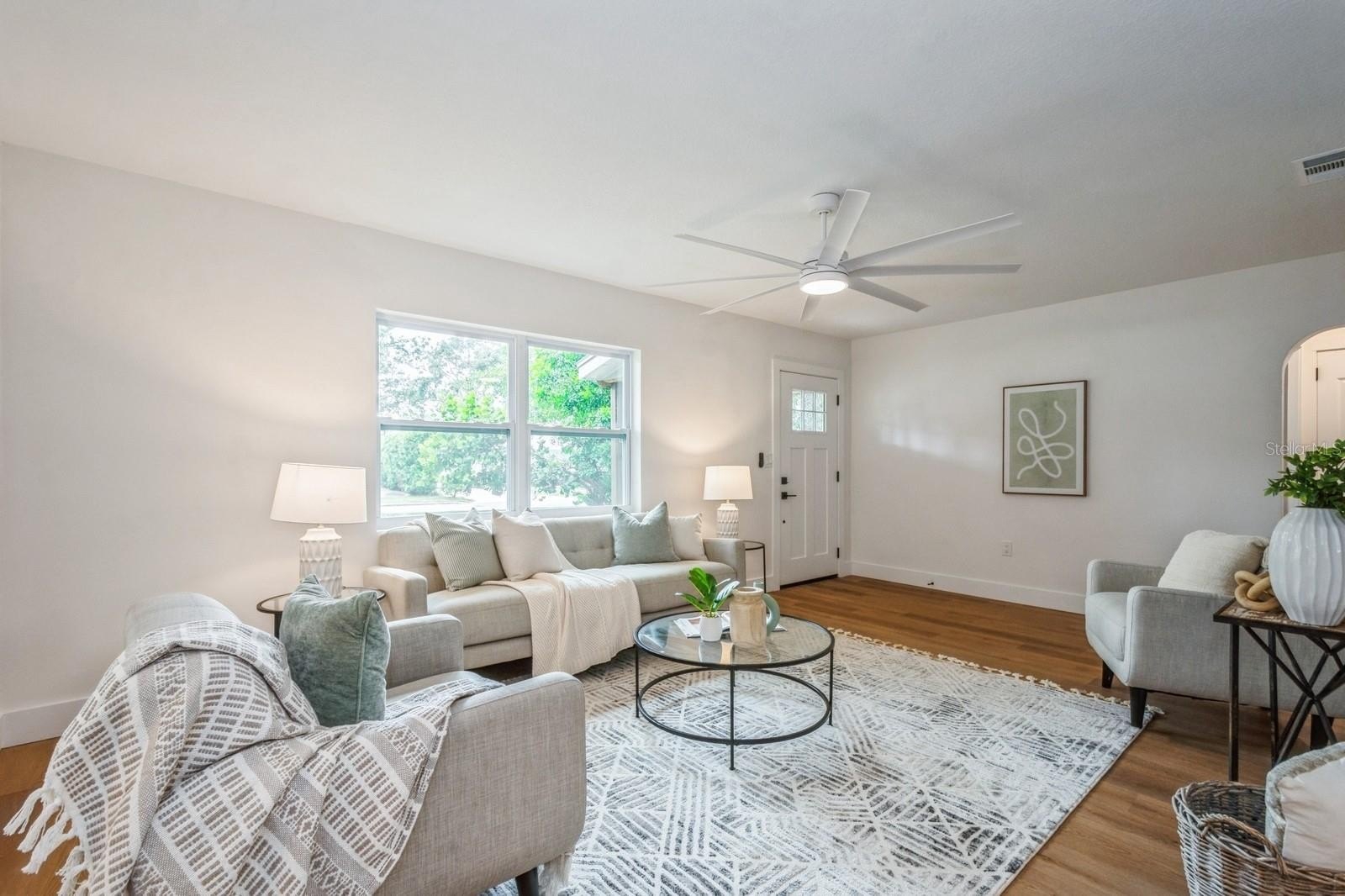 This fully remodeled 2 bedroom, 1.5 bathroom single story home is in a prime location just minutes from the many shops and restaurants of downtown Dunedin! Designer finishes and new luxury vinyl plank flooring are found throughout the home, which has a great floor plan perfect for living and entertaining. The spacious and bright living room is open to the kitchen which features new shaker cabinets, quartz counters, new stainless appliances and space for an eat-in area. Laundry and a chic powder bathroom are just off the kitchen, which also leads out to the covered car port with new tongue-and-groove ceiling. A separate dining room surrounded by windows streams in natural light. Two spacious bedrooms share the full bathroom which has a new tiled shower. The spacious fenced backyard has a seashell gravel patio and ample space for a pool. Other features include new impact-rated vinyl windows throughout, updated electrical and newer HVAC (2020) and water heater (2022), and a large storage room at the back of the car port. This home is nestled in a golf cart-friendly neighborhood of picturesque homes which the Pinellas Bike Trail runs right through. It is also a short stroll to Hammock Park, Dunedin Golf Club and Honeymoon Island. This home sat HIGH AND DRY with NO FLOODING OR STORM DAMAGE during Helene and Milton.