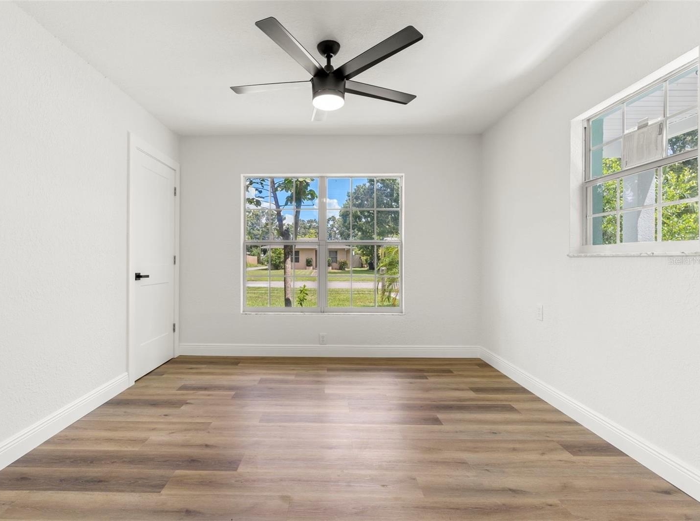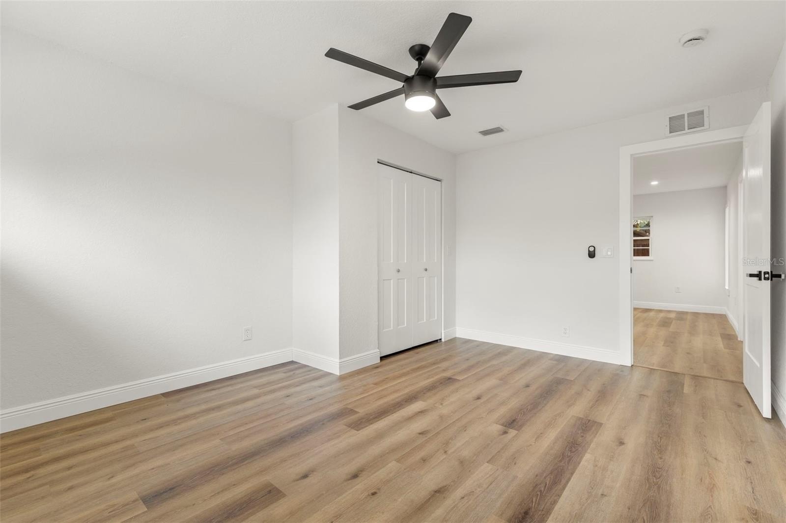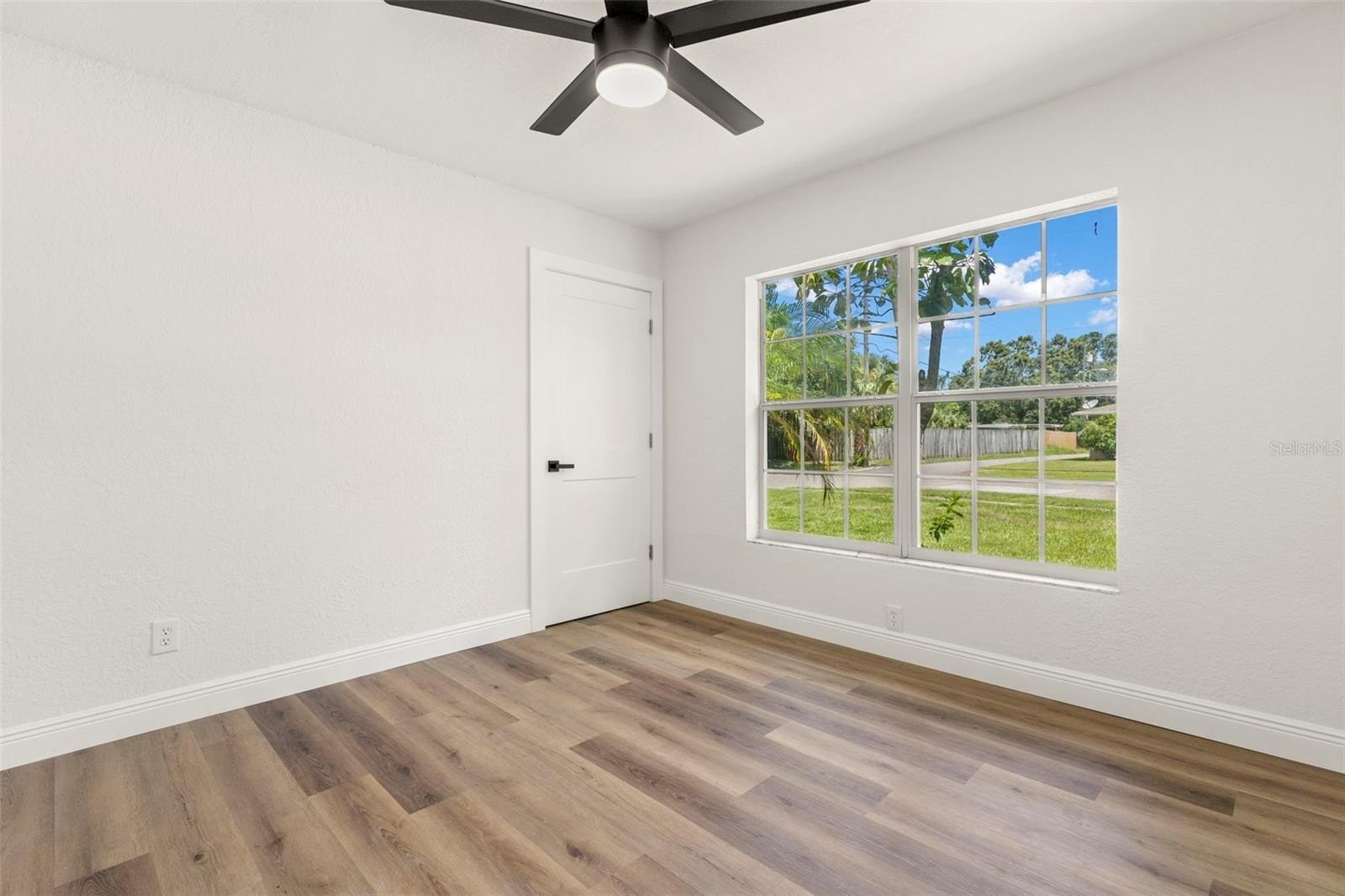 Each of the four spacious bedrooms is filled with natural light, while the two full bathrooms feature matching modern finishes. The primary suite includes a generous walk-in closet for ample storage. At the rear of the home, you'll find a dedicated laundry room with washer/dryer hookups and enough space to double as a storage area.
