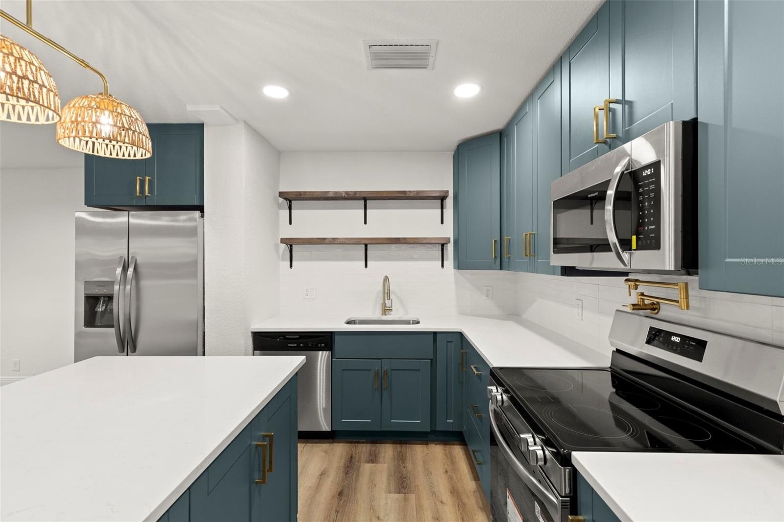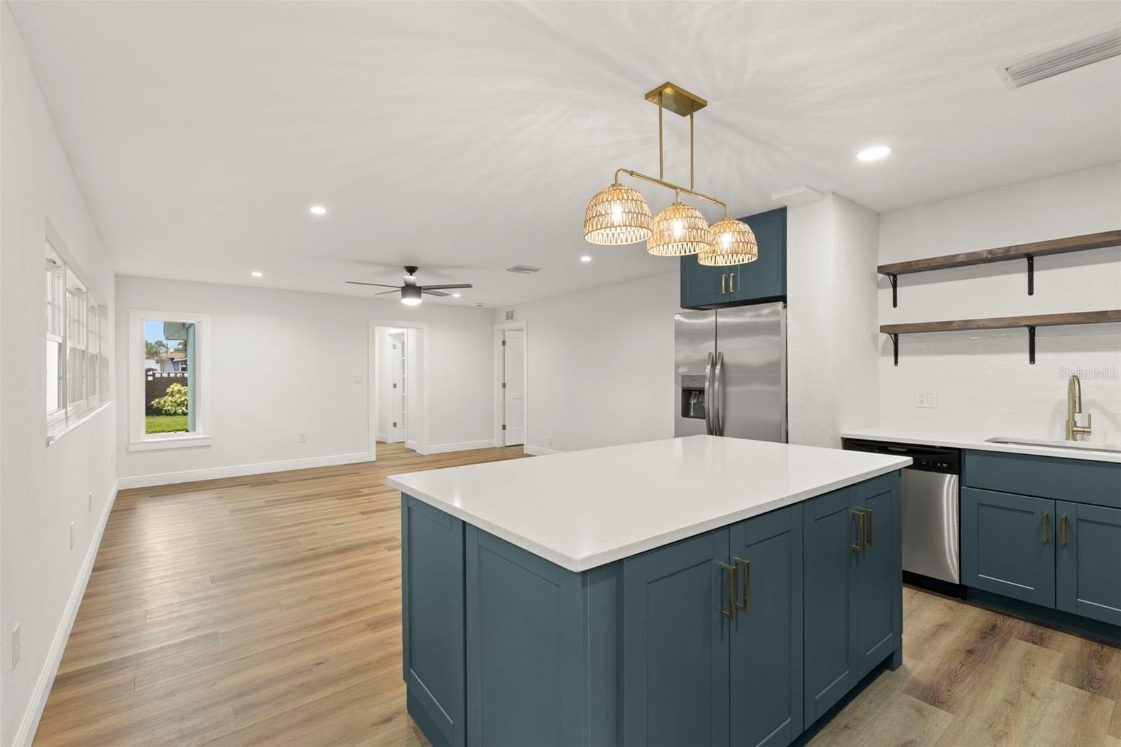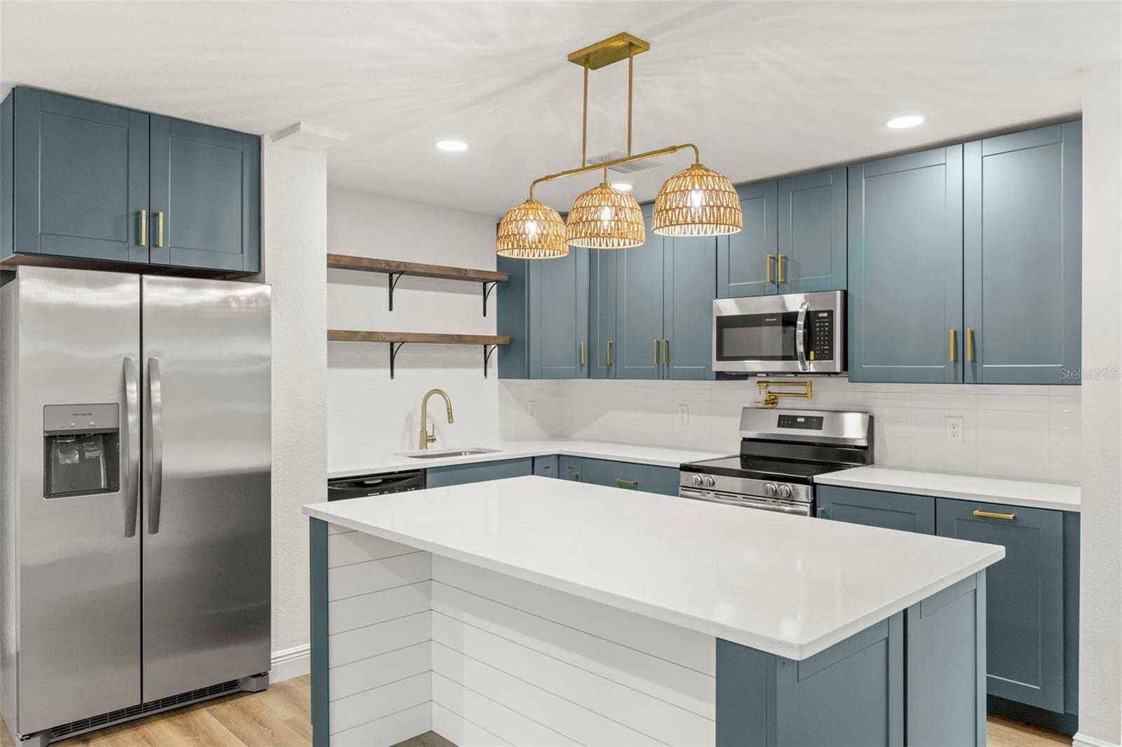 This move-in ready home was completely renovated from top to bottom—NEW NEW NEW: roof, A/C system, luxury vinyl floors, kitchen cabinets, quartz countertops, matching stainless steel appliances, bathroom tile flooring, showers, vanities, drywall, paint, and light fixtures. The stunning chef’s kitchen is the heart of the home, featuring an abundance of counter space, an oversized island, custom cabinetry, and a spacious pantry—ideal for both everyday living and entertaining.