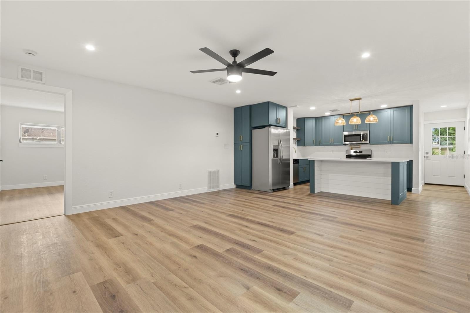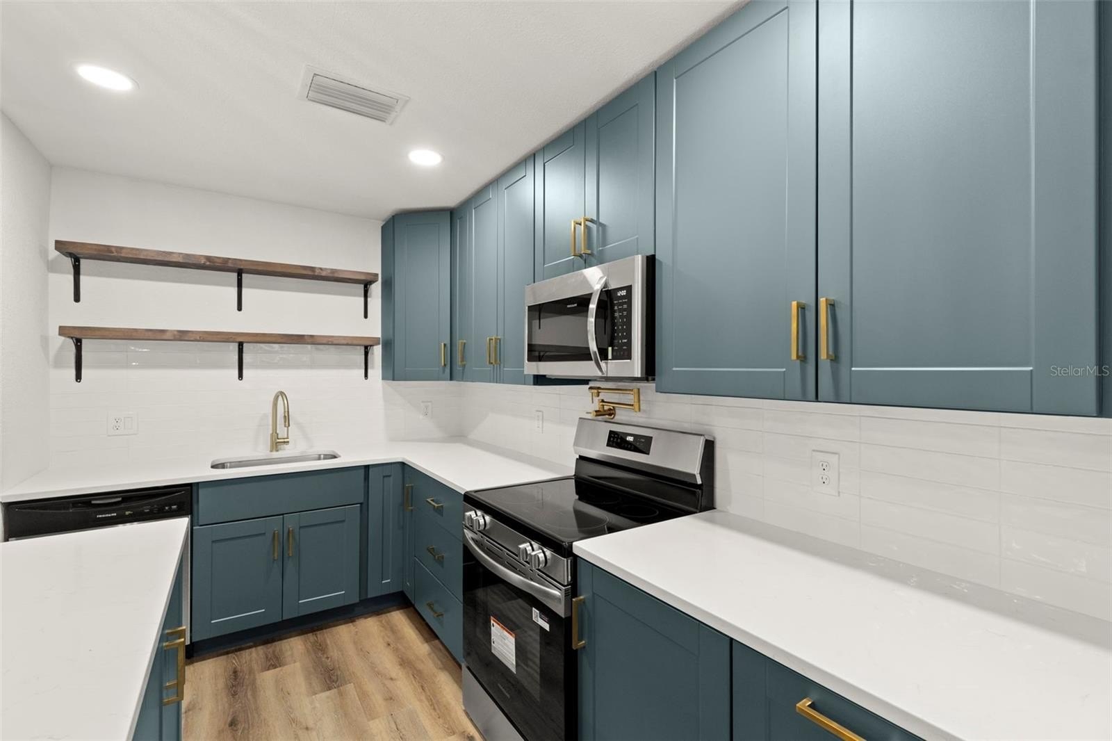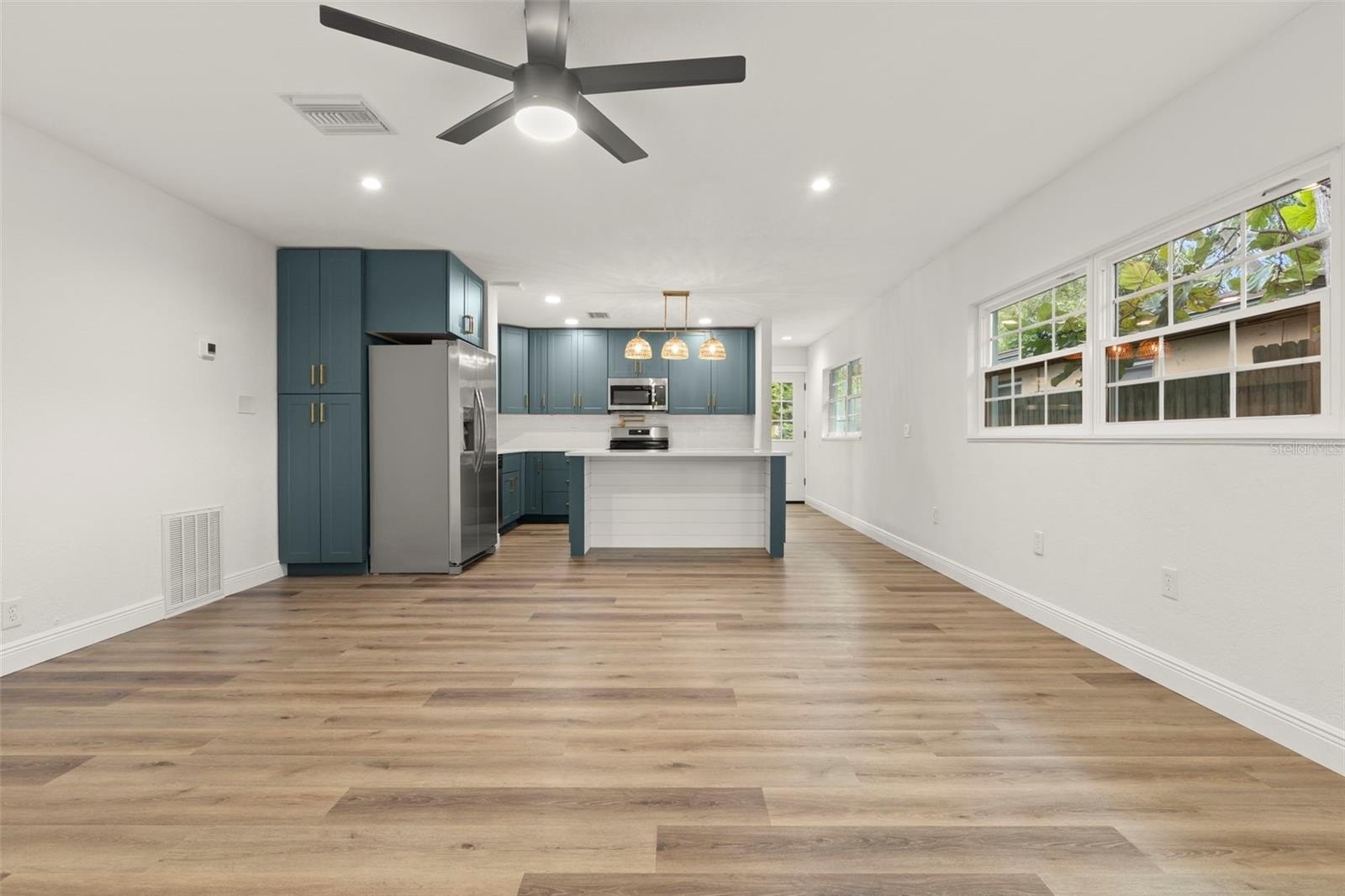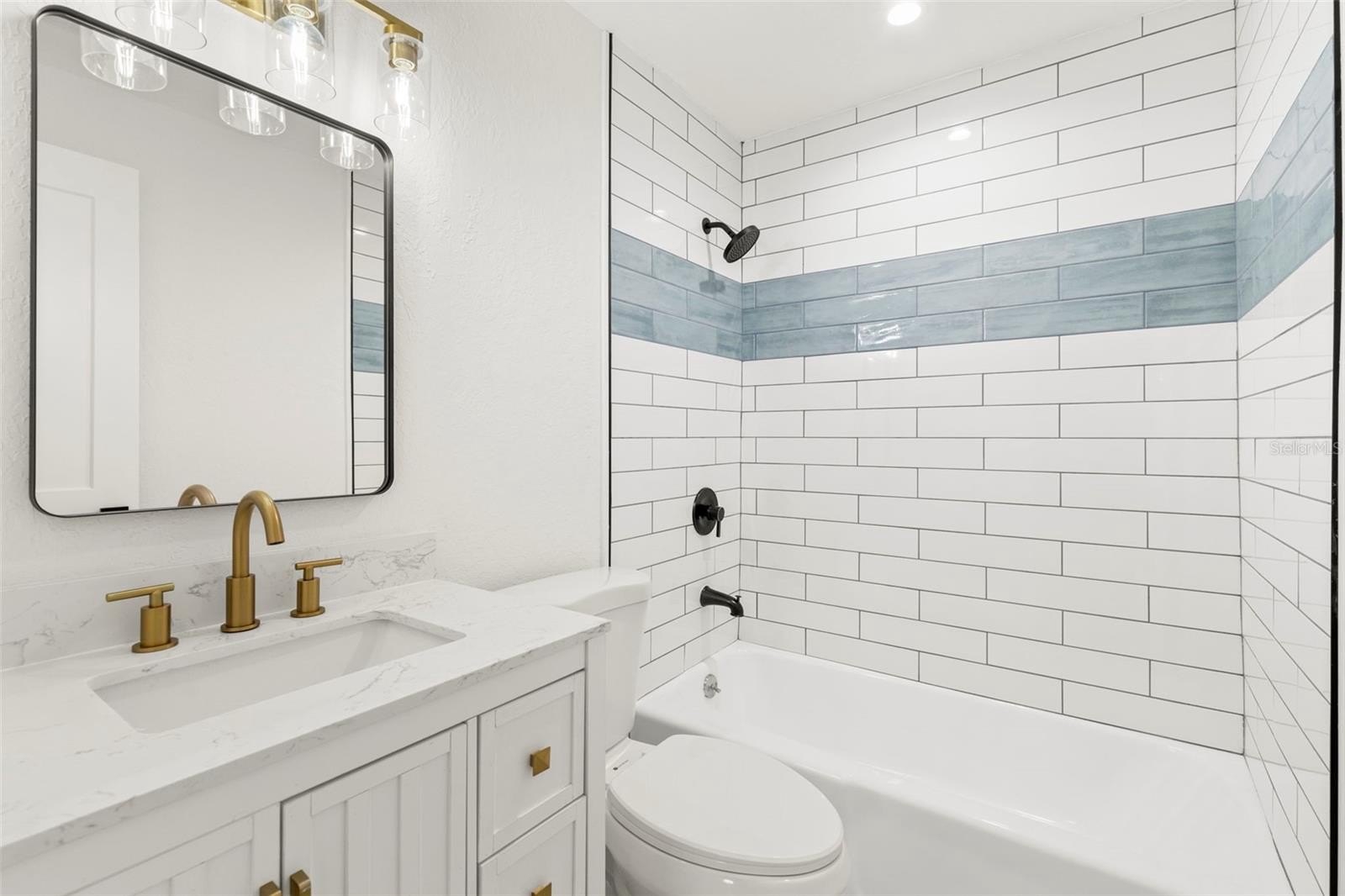 This move-in ready home was completely renovated from top to bottom—NEW NEW NEW: roof, A/C system, luxury vinyl floors, kitchen cabinets, quartz countertops, matching stainless steel appliances, bathroom tile flooring, showers, vanities, drywall, paint, and light fixtures. The stunning chef’s kitchen is the heart of the home, featuring an abundance of counter space, an oversized island, custom cabinetry, and a spacious pantry—ideal for both everyday living and entertaining.