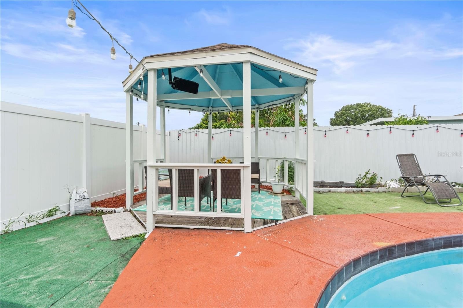 The backyard is your private retreat with plenty of ample space to enjoy — featuring an oversized covered porch, a sparkling pool, a shady gazebo, a cozy fire pit area, and room for unforgettable cookouts and gatherings. A storage shed adds even more convenience.