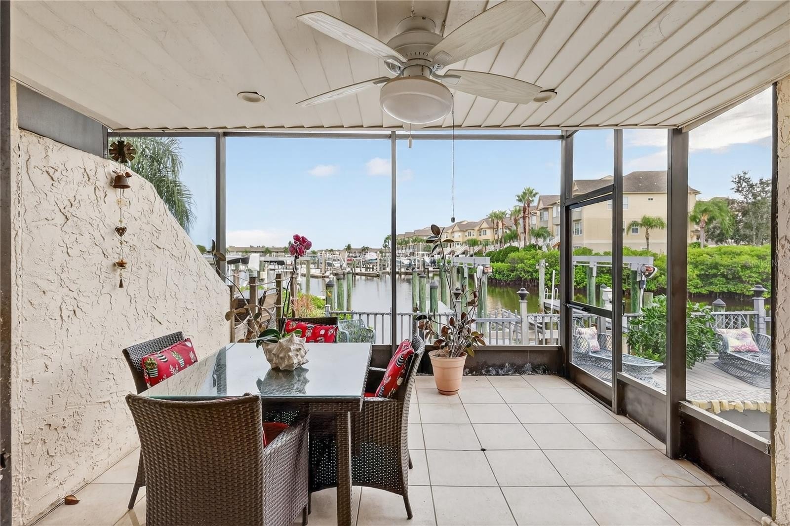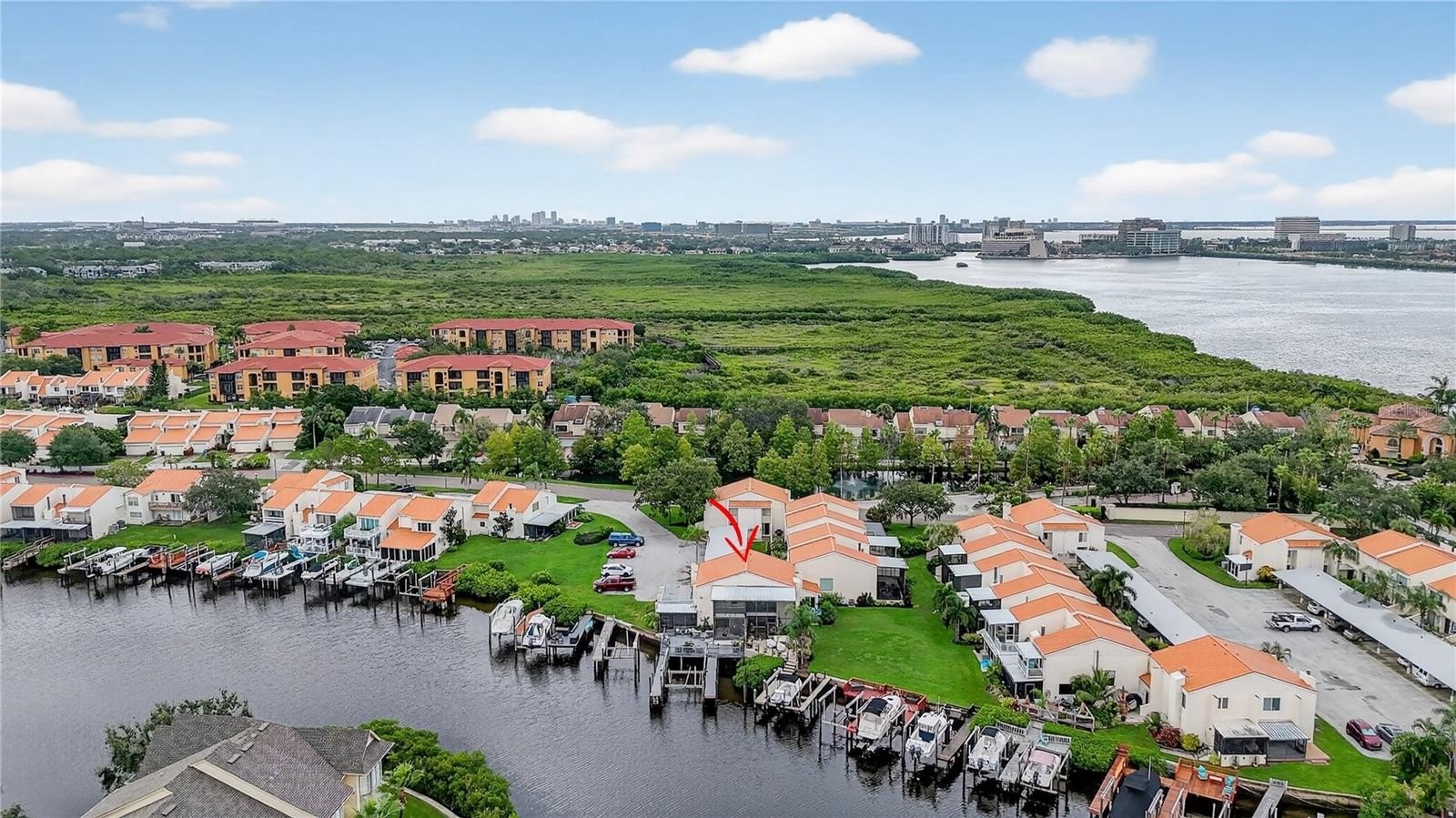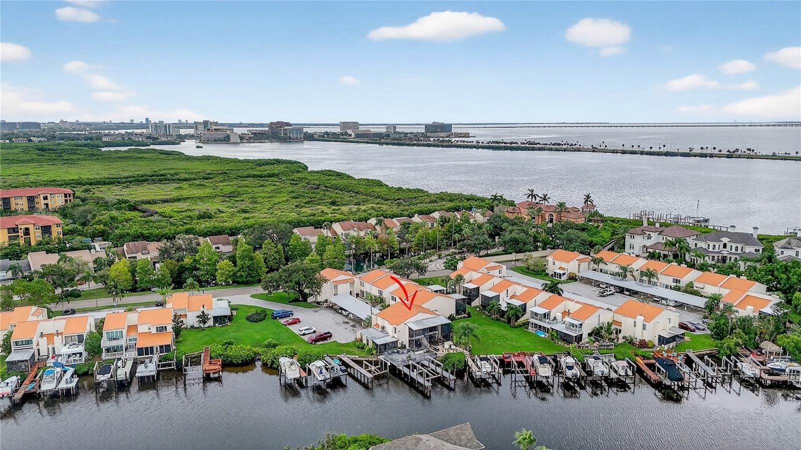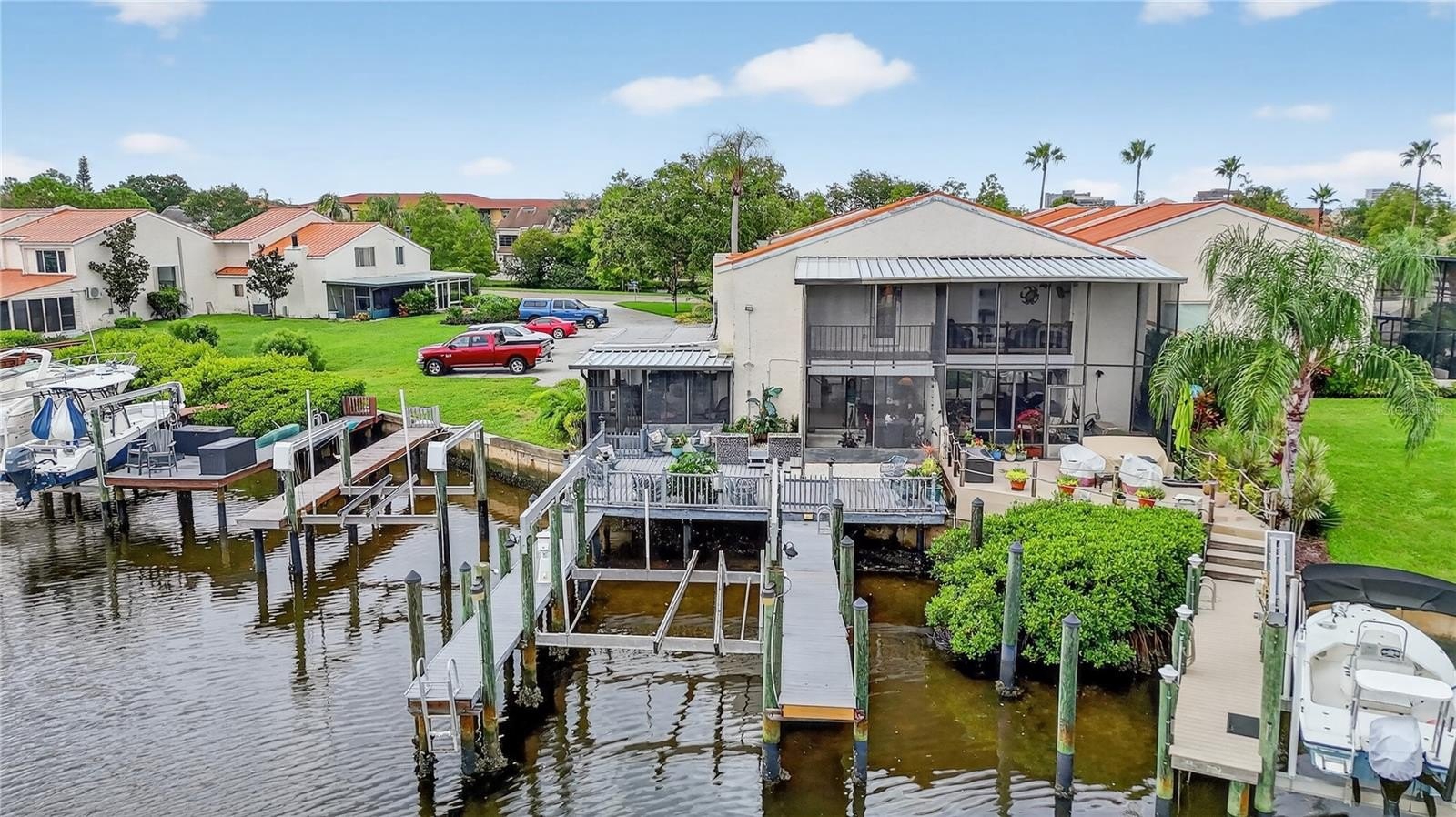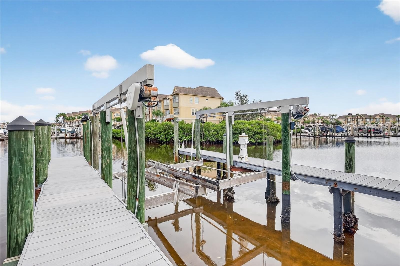 This captivating two-story condominium feels like the waterfront house you have always wanted, without the maintenance or the price. Enjoy an extra-large, 1,650 square foot, corner unit on the ground floor with 180 degrees of water views. Savor brilliant, tropical sunsets reflecting on the water from any of your three balconies or outdoor patio. All living areas overlook your boat lift and tranquil saltwater cove, giving you access to the warm waters of Tampa Bay. The open floor plan creates a comfortable living environment, seamlessly integrating the indoor and outdoor spaces. The renovated kitchen opens onto the family room and two walls of windows with water views. Upstairs, the primary bedroom offers ample space and direct access to the private screened balcony. The guest room is also upstairs. A private boat lift, 8-10K lbs, ideal for those with a passion for boating or water-based activities, is outside your back door, and the community pool and pickleball courts are just a block away. There is nobody above you in this townhouse-concept condo, and there is a carport next to your front door. The friendly community is just 15 minutes to Tampa International Airport, and the maintenance fee covers exterior maintenance, cable, flood insurance, and access to community amenities.