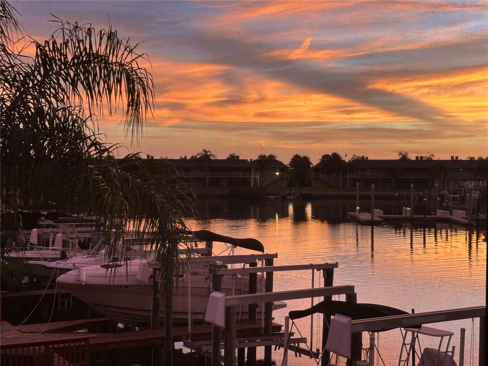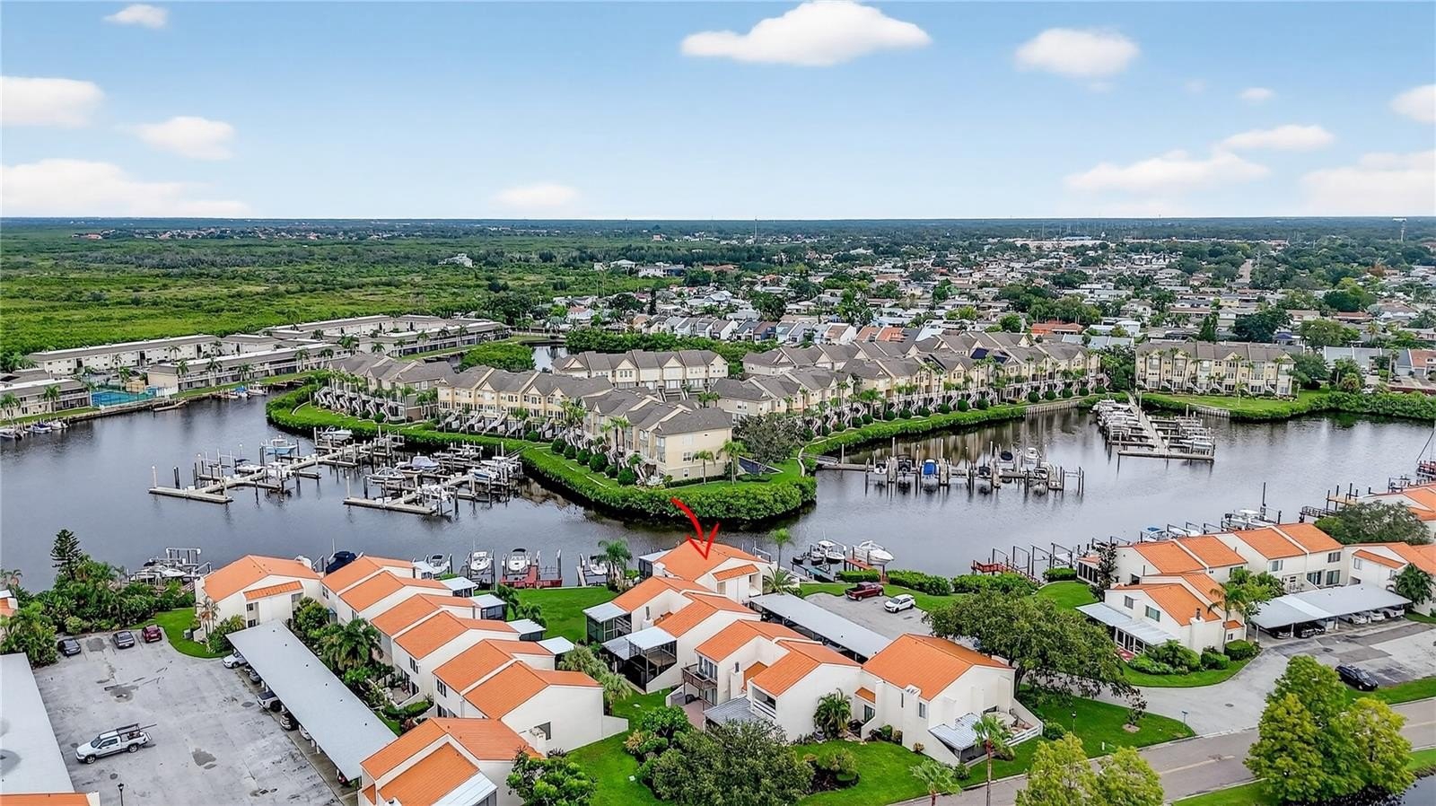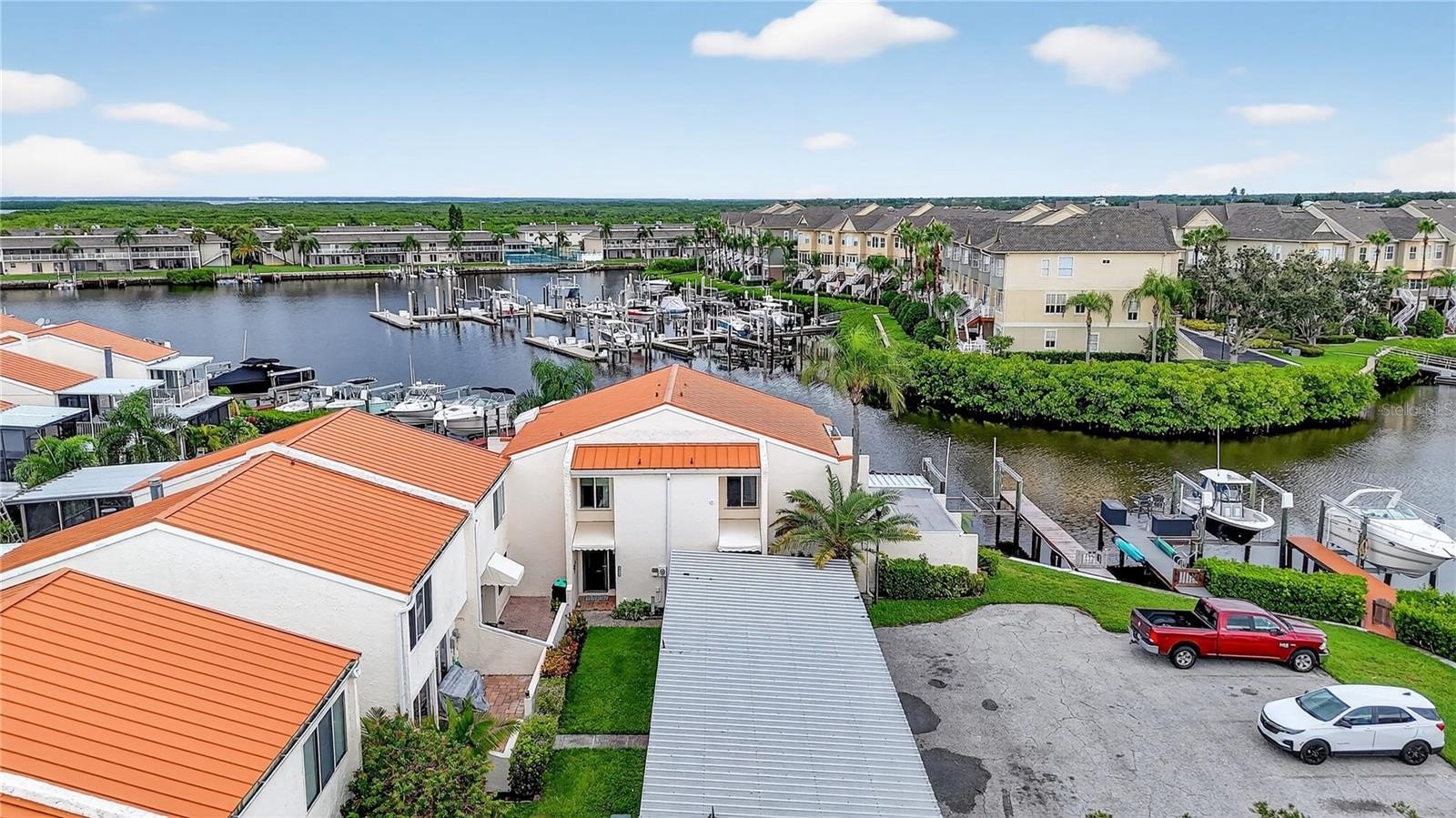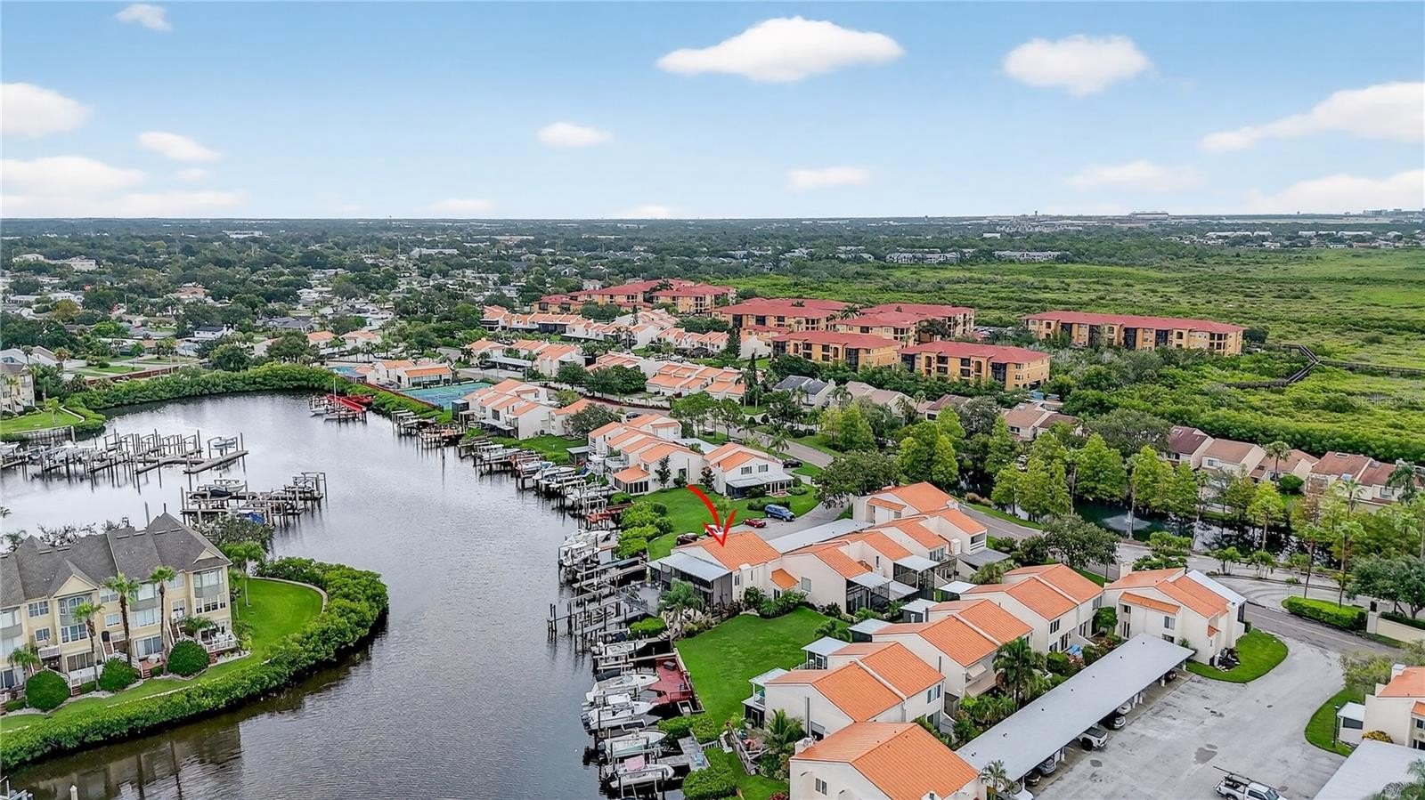 This captivating two-story condominium feels like the waterfront house you have always wanted, without the maintenance or the price. Enjoy an extra-large, 1,650 square foot, corner unit on the ground floor with 180 degrees of water views. Savor brilliant, tropical sunsets reflecting on the water from any of your three balconies or outdoor patio. All living areas overlook your boat lift and tranquil saltwater cove, giving you access to the warm waters of Tampa Bay. The open floor plan creates a comfortable living environment, seamlessly integrating the indoor and outdoor spaces. The renovated kitchen opens onto the family room and two walls of windows with water views. Upstairs, the primary bedroom offers ample space and direct access to the private screened balcony. The guest room is also upstairs. A private boat lift, 8-10K lbs, ideal for those with a passion for boating or water-based activities, is outside your back door, and the community pool and pickleball courts are just a block away. There is nobody above you in this townhouse-concept condo, and there is a carport next to your front door. The friendly community is just 15 minutes to Tampa International Airport, and the maintenance fee covers exterior maintenance, cable, flood insurance, and access to community amenities.