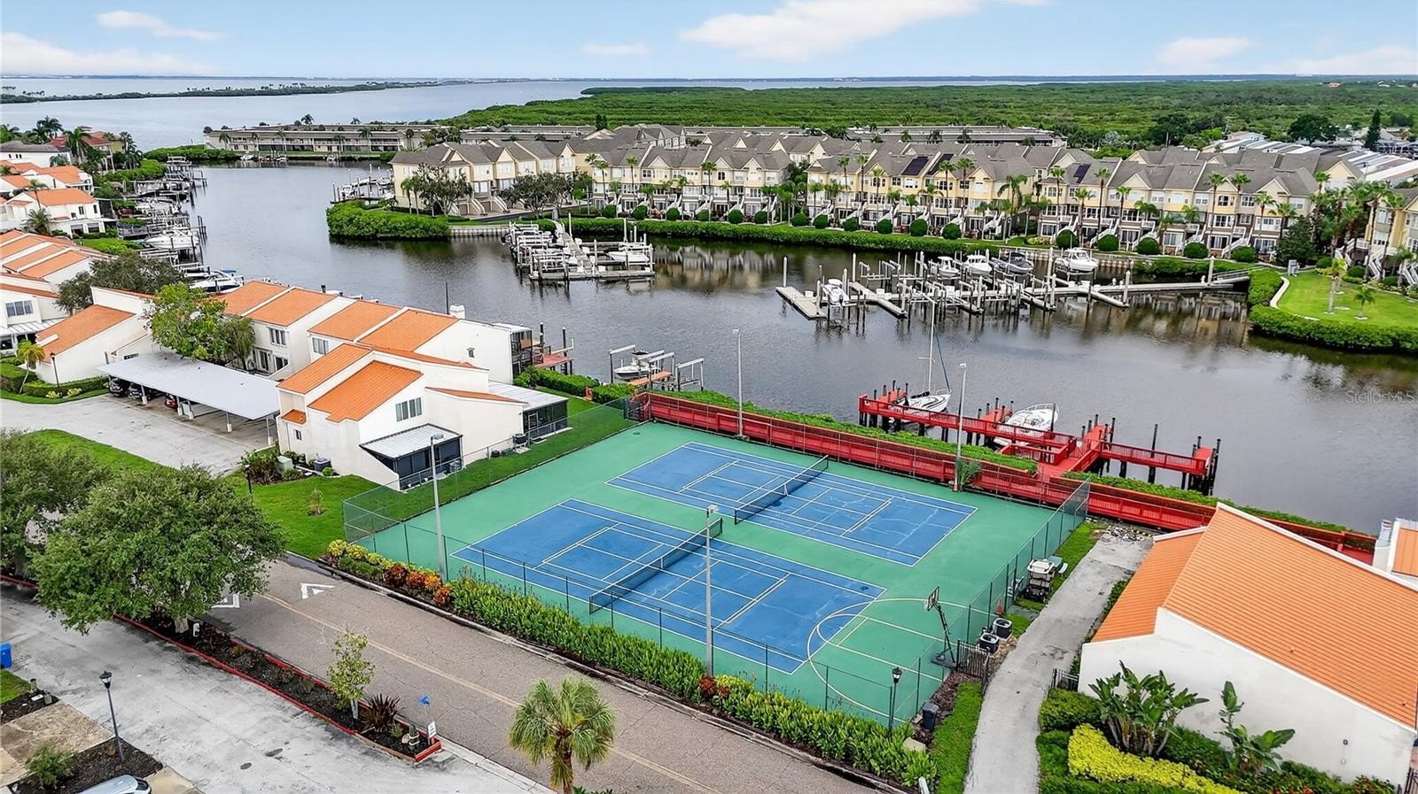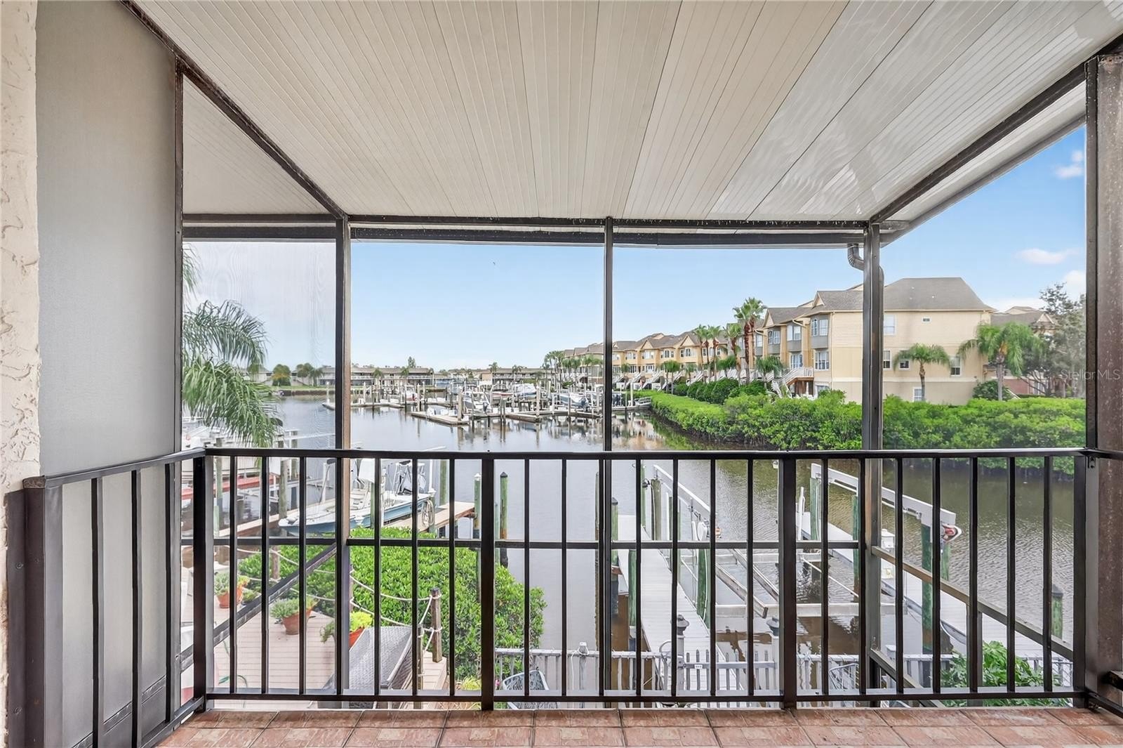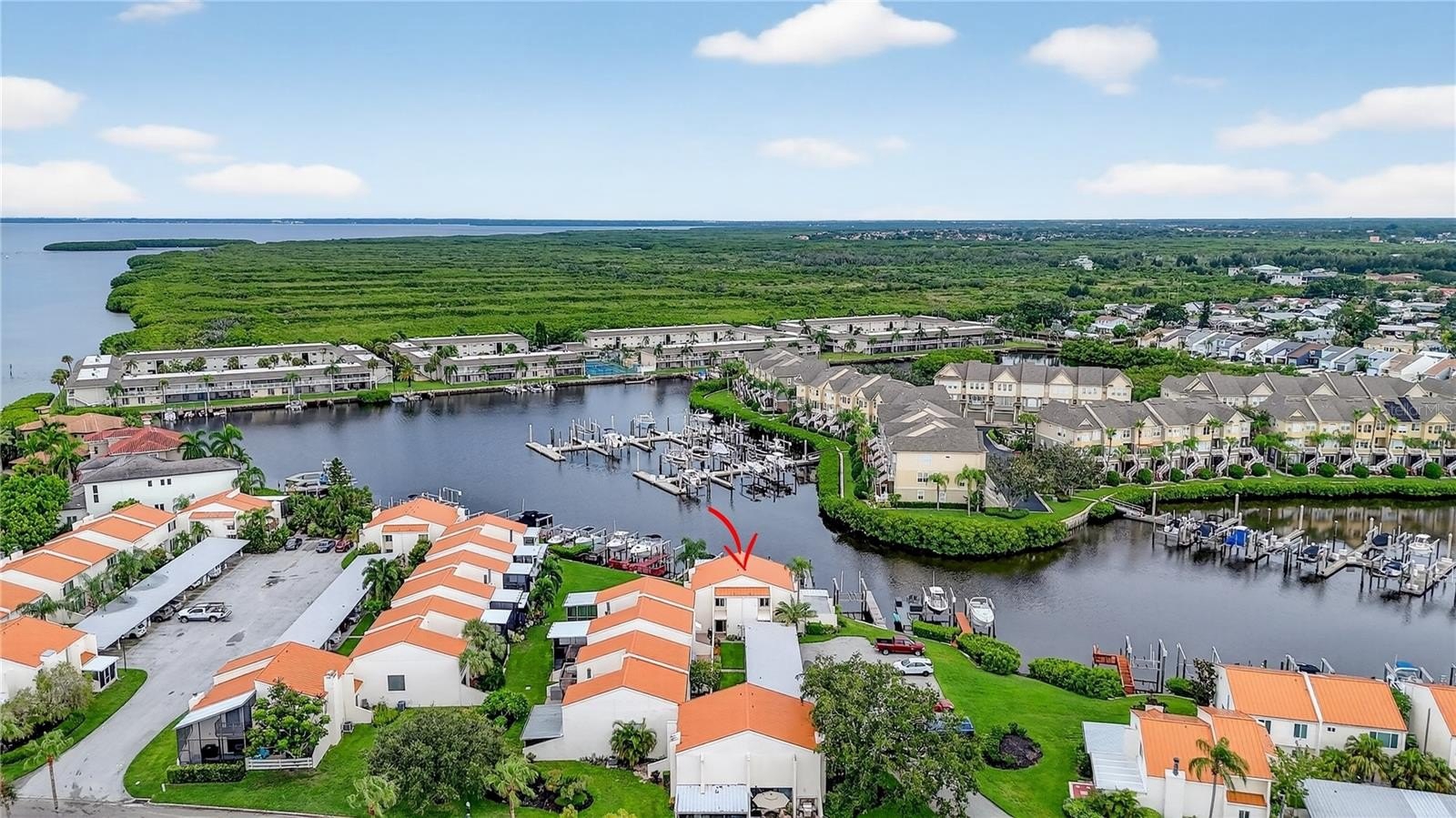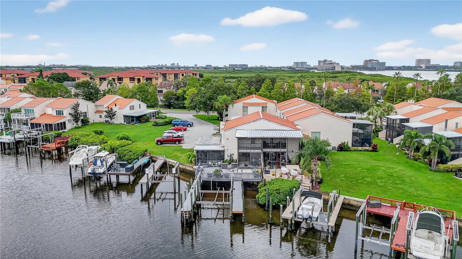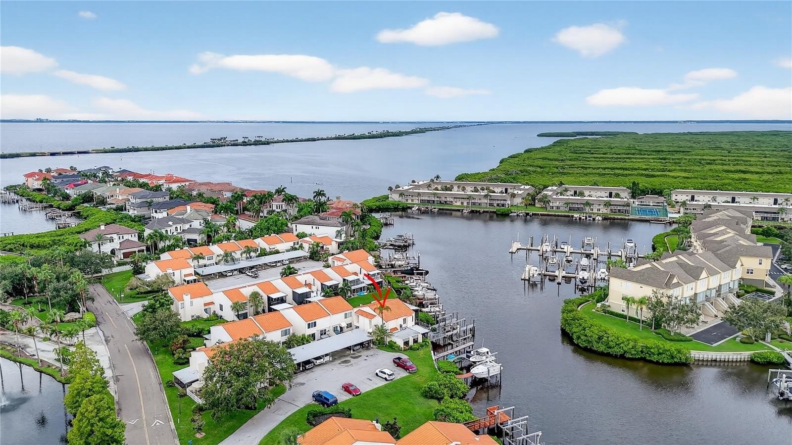 This captivating two-story condominium feels like the waterfront house you have always wanted, without the maintenance or the price. Enjoy an extra-large, 1,650 square foot, corner unit on the ground floor with 180 degrees of water views. Savor brilliant, tropical sunsets reflecting on the water from any of your three balconies or outdoor patio. All living areas overlook your boat lift and tranquil saltwater cove, giving you access to the warm waters of Tampa Bay. The open floor plan creates a comfortable living environment, seamlessly integrating the indoor and outdoor spaces. The renovated kitchen opens onto the family room and two walls of windows with water views. Upstairs, the primary bedroom offers ample space and direct access to the private screened balcony. The guest room is also upstairs. A private boat lift, 8-10K lbs, ideal for those with a passion for boating or water-based activities, is outside your back door, and the community pool and pickleball courts are just a block away. There is nobody above you in this townhouse-concept condo, and there is a carport next to your front door. The friendly community is just 15 minutes to Tampa International Airport, and the maintenance fee covers exterior maintenance, cable, flood insurance, and access to community amenities.