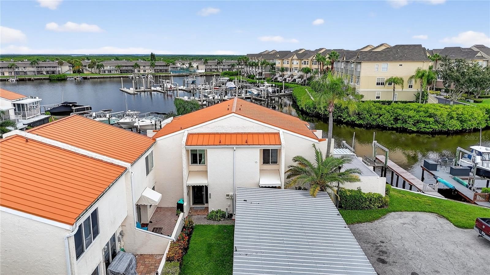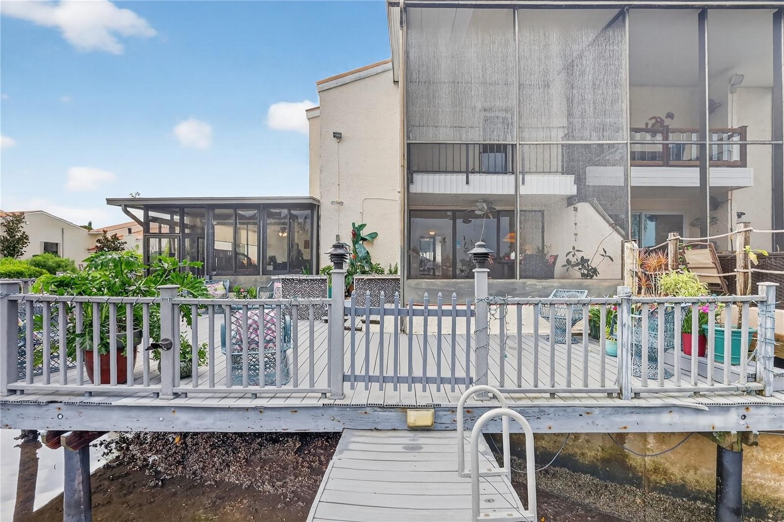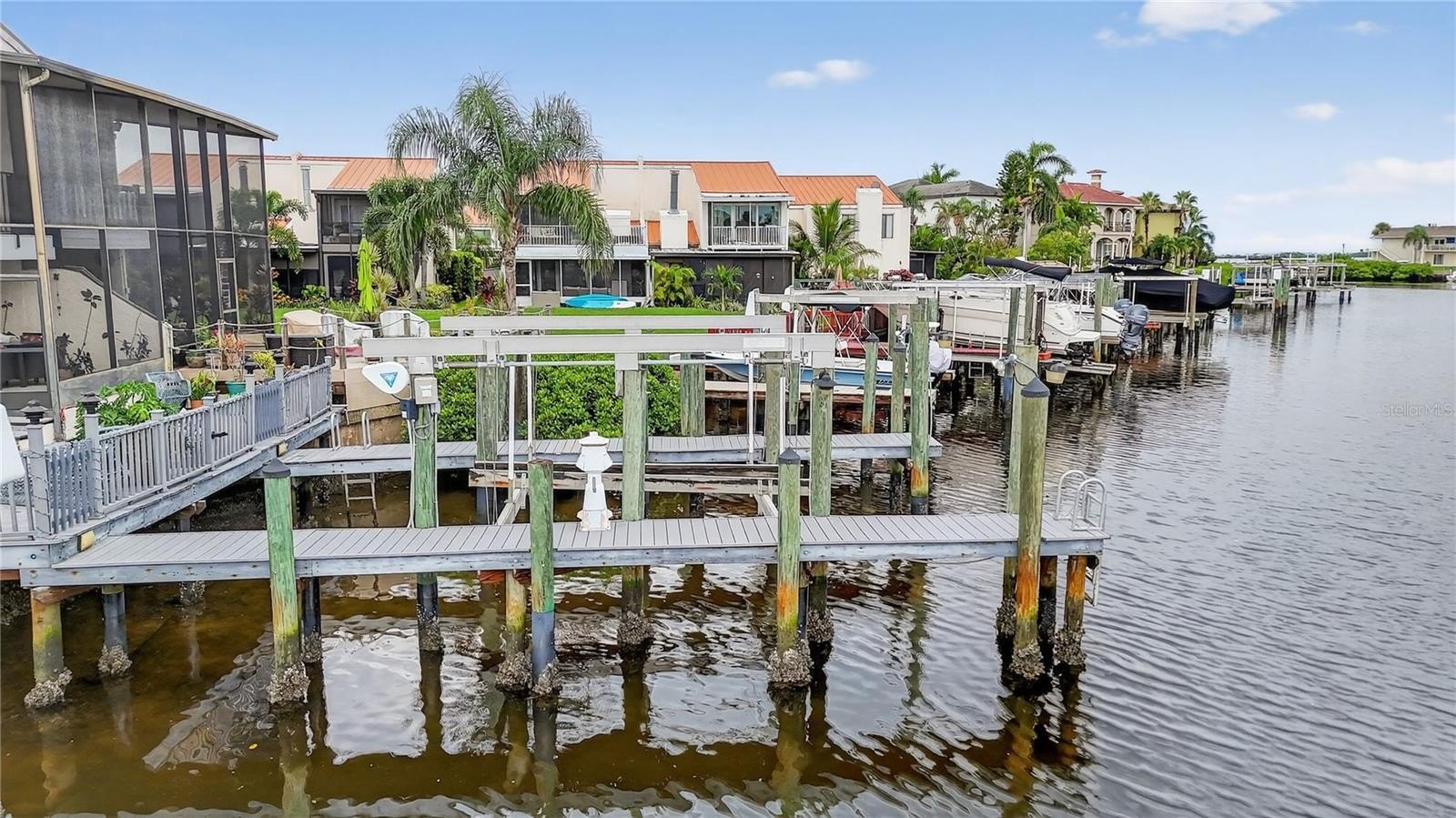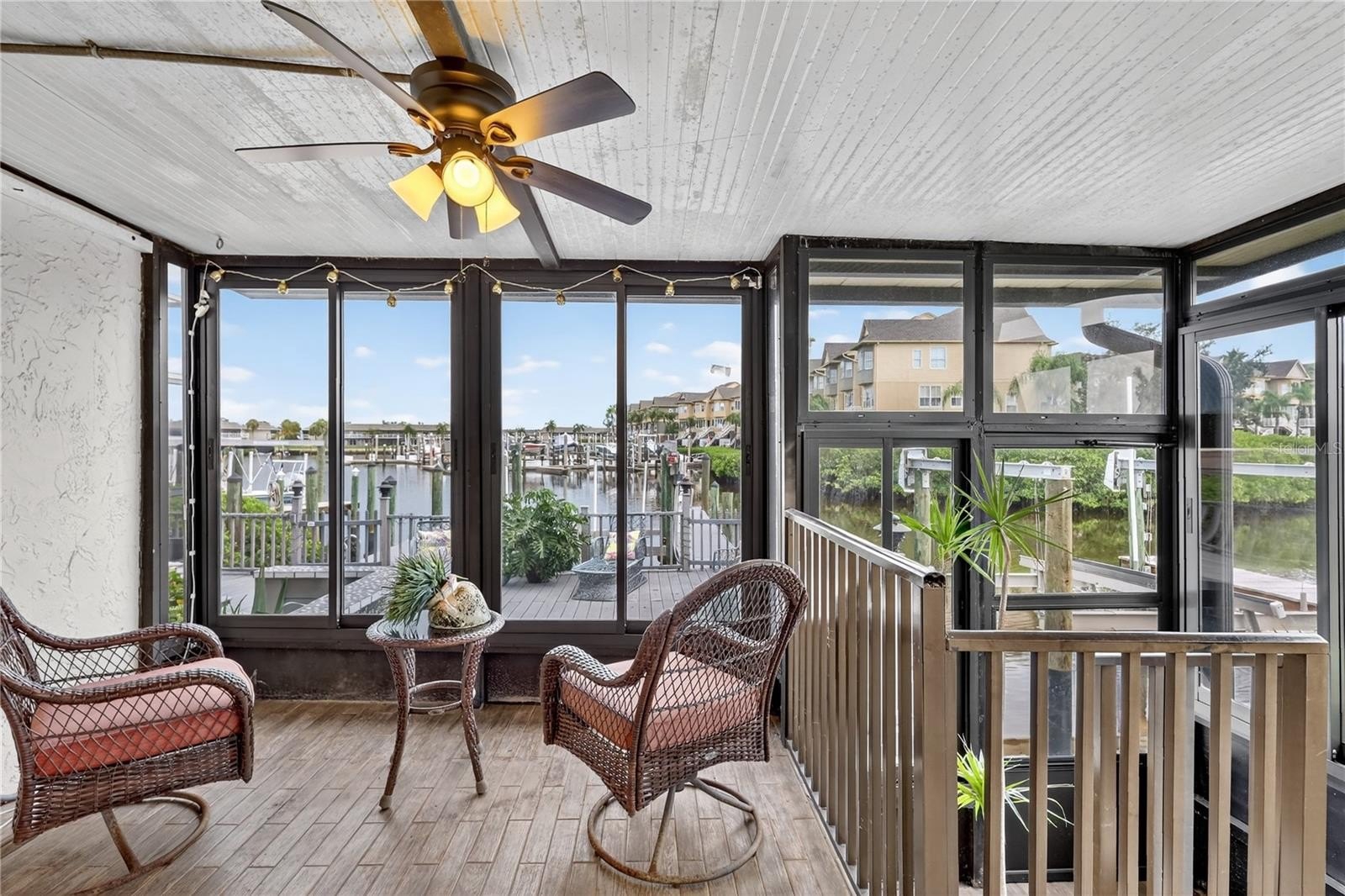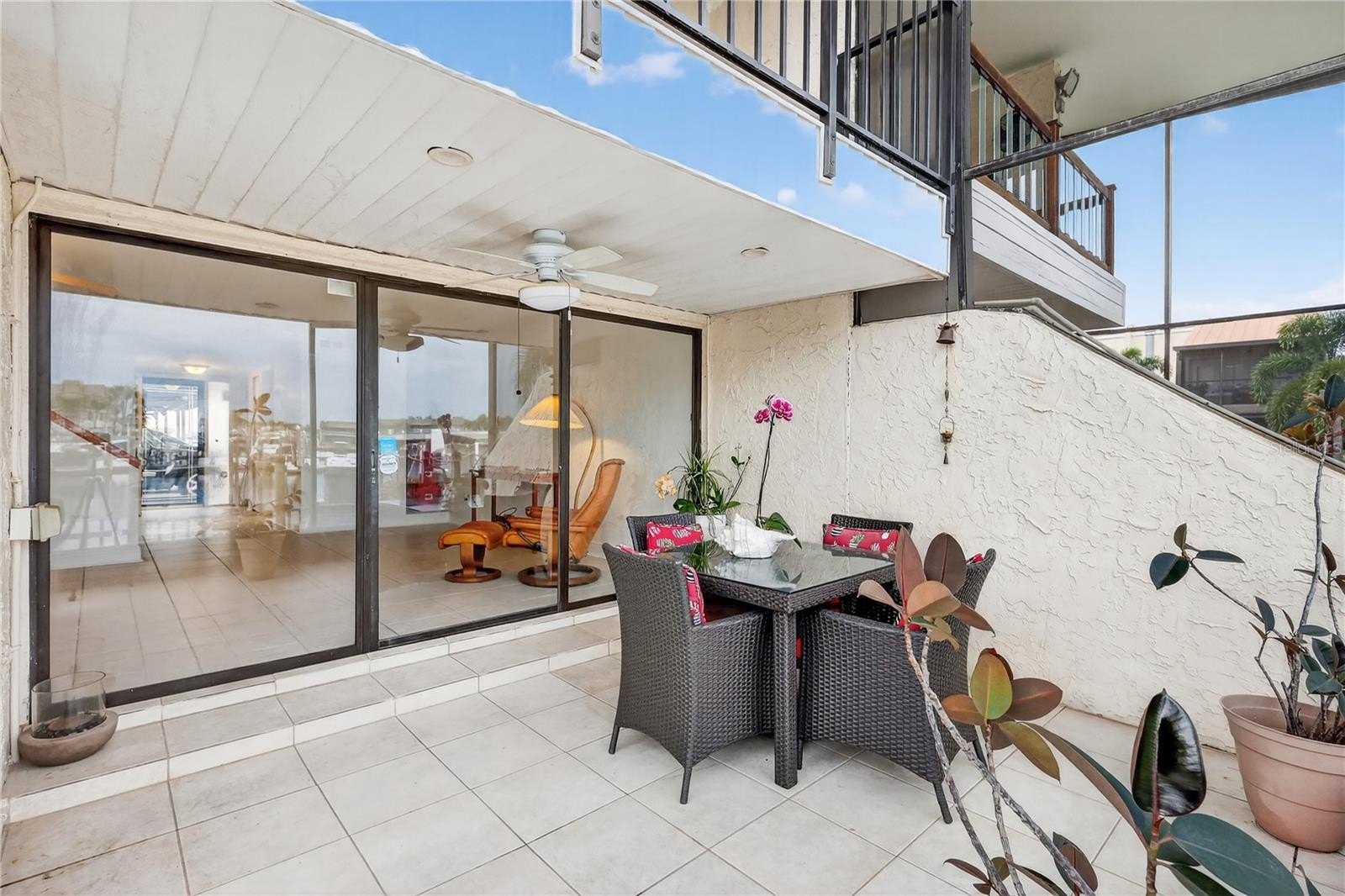 This captivating two-story condominium feels like the waterfront house you have always wanted, without the maintenance or the price. Enjoy an extra-large, 1,650 square foot, corner unit on the ground floor with 180 degrees of water views. Savor brilliant, tropical sunsets reflecting on the water from any of your three balconies or outdoor patio. All living areas overlook your boat lift and tranquil saltwater cove, giving you access to the warm waters of Tampa Bay. The open floor plan creates a comfortable living environment, seamlessly integrating the indoor and outdoor spaces. The renovated kitchen opens onto the family room and two walls of windows with water views. Upstairs, the primary bedroom offers ample space and direct access to the private screened balcony. The guest room is also upstairs. A private boat lift, 8-10K lbs, ideal for those with a passion for boating or water-based activities, is outside your back door, and the community pool and pickleball courts are just a block away. There is nobody above you in this townhouse-concept condo, and there is a carport next to your front door. The friendly community is just 15 minutes to Tampa International Airport, and the maintenance fee covers exterior maintenance, cable, flood insurance, and access to community amenities.