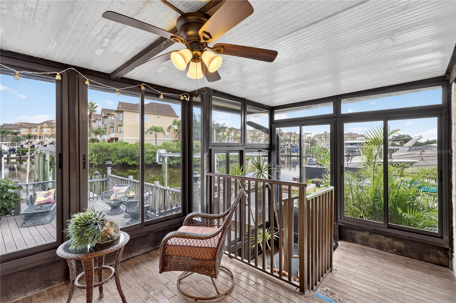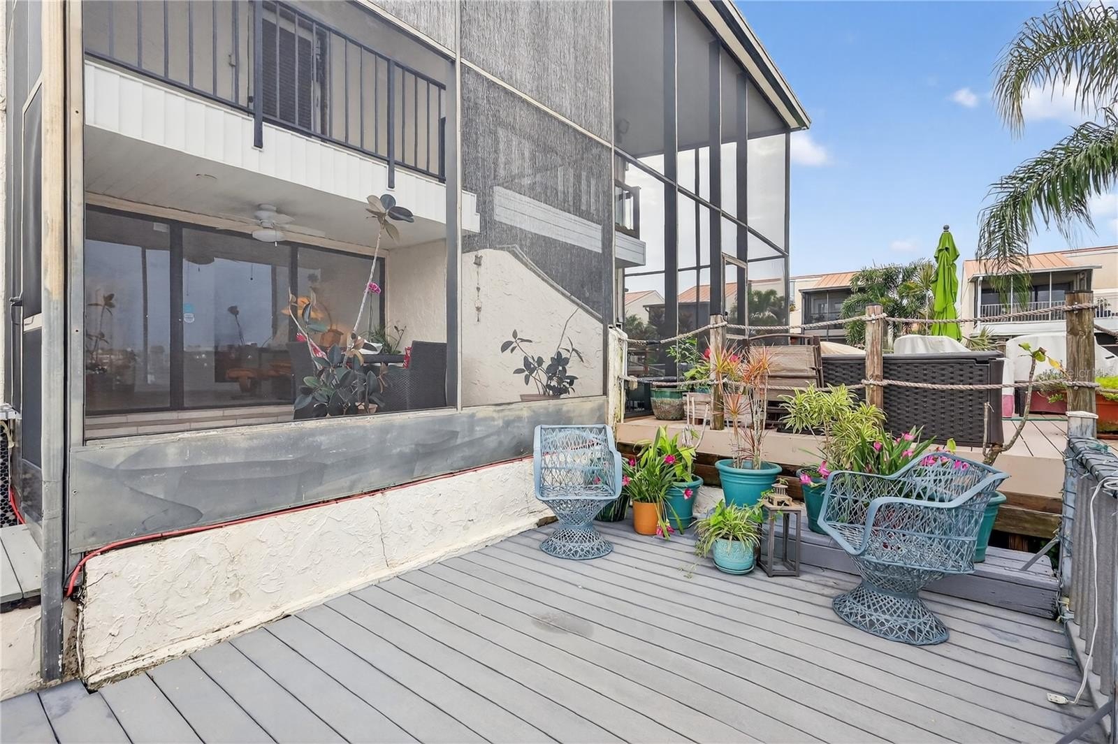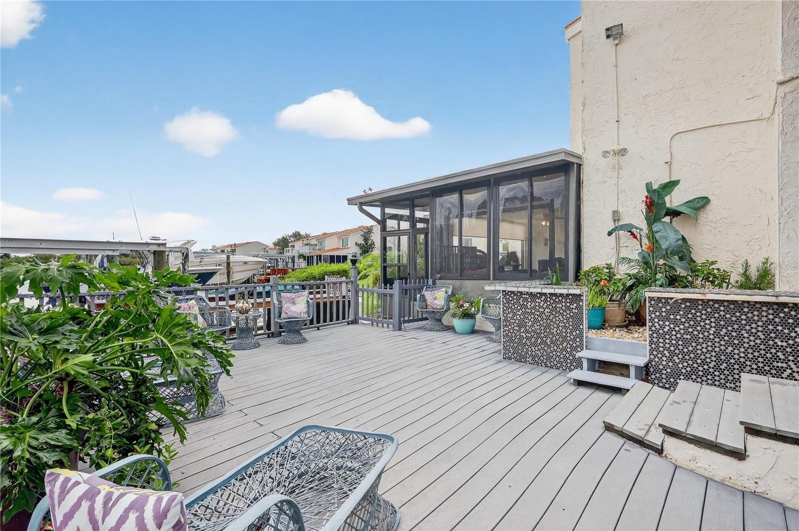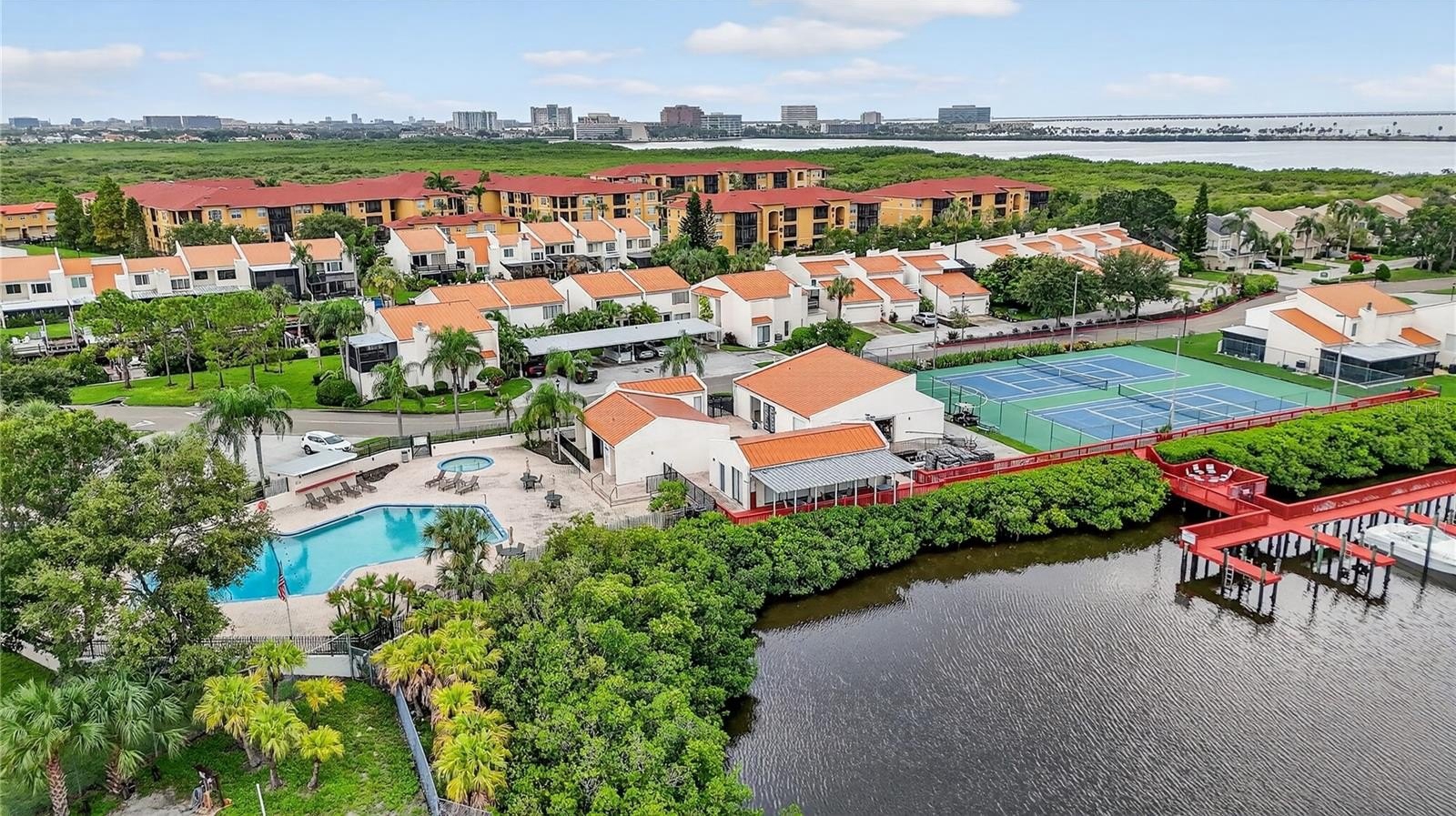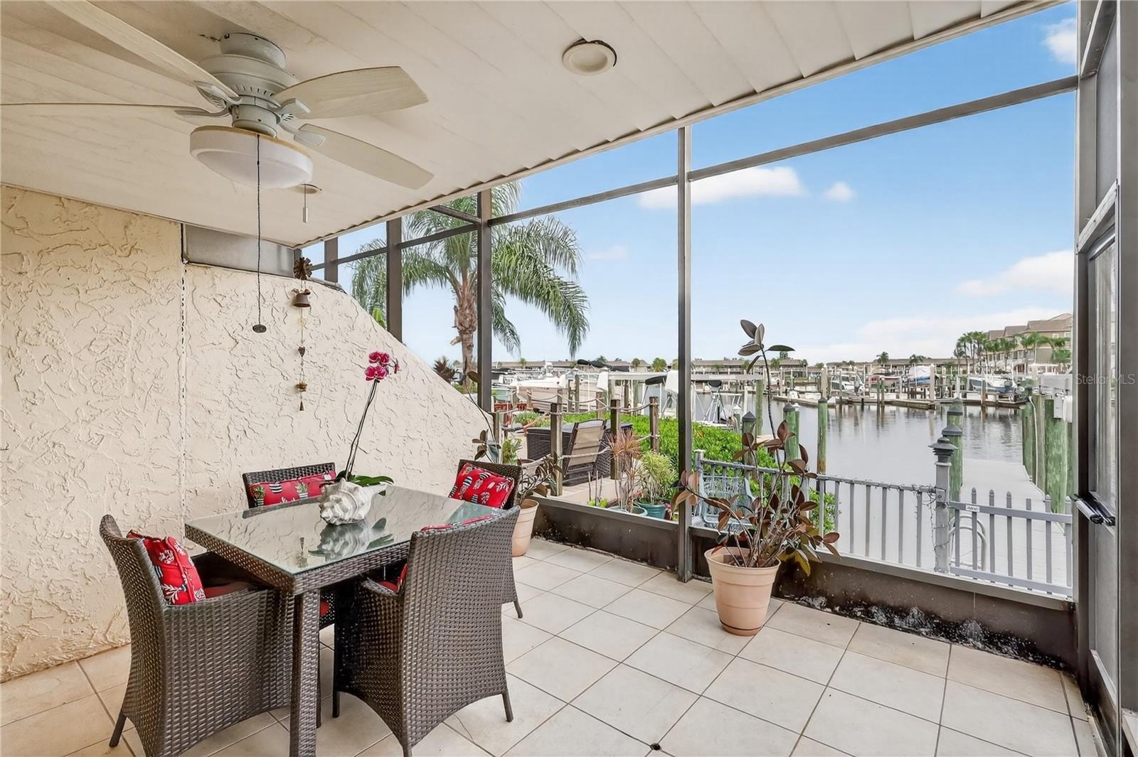 This captivating two-story condominium feels like the waterfront house you have always wanted, without the maintenance or the price. Enjoy an extra-large, 1,650 square foot, corner unit on the ground floor with 180 degrees of water views. Savor brilliant, tropical sunsets reflecting on the water from any of your three balconies or outdoor patio. All living areas overlook your boat lift and tranquil saltwater cove, giving you access to the warm waters of Tampa Bay. The open floor plan creates a comfortable living environment, seamlessly integrating the indoor and outdoor spaces. The renovated kitchen opens onto the family room and two walls of windows with water views. Upstairs, the primary bedroom offers ample space and direct access to the private screened balcony. The guest room is also upstairs. A private boat lift, 8-10K lbs, ideal for those with a passion for boating or water-based activities, is outside your back door, and the community pool and pickleball courts are just a block away. There is nobody above you in this townhouse-concept condo, and there is a carport next to your front door. The friendly community is just 15 minutes to Tampa International Airport, and the maintenance fee covers exterior maintenance, cable, flood insurance, and access to community amenities.