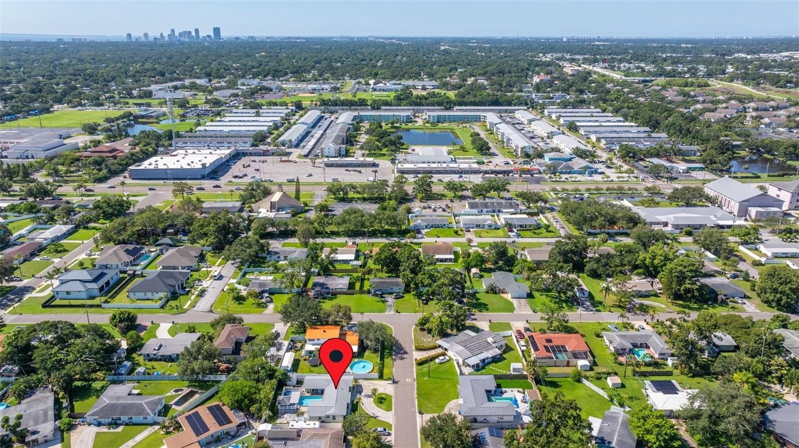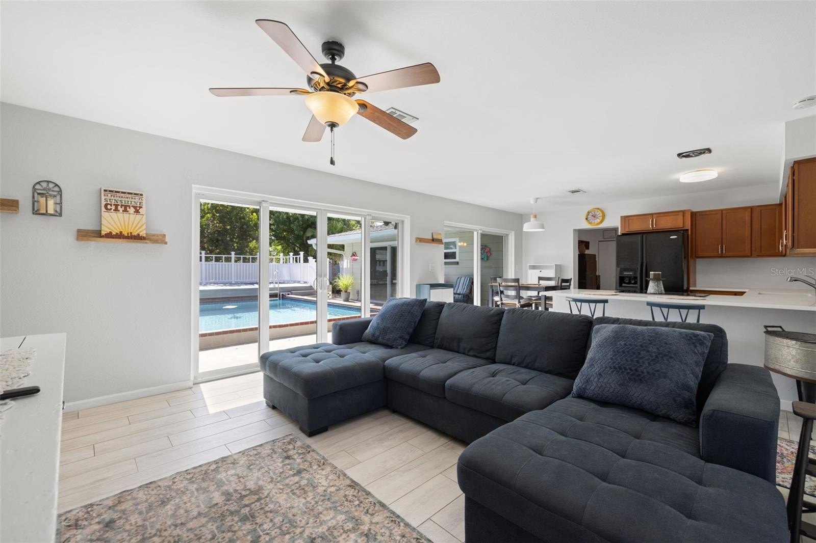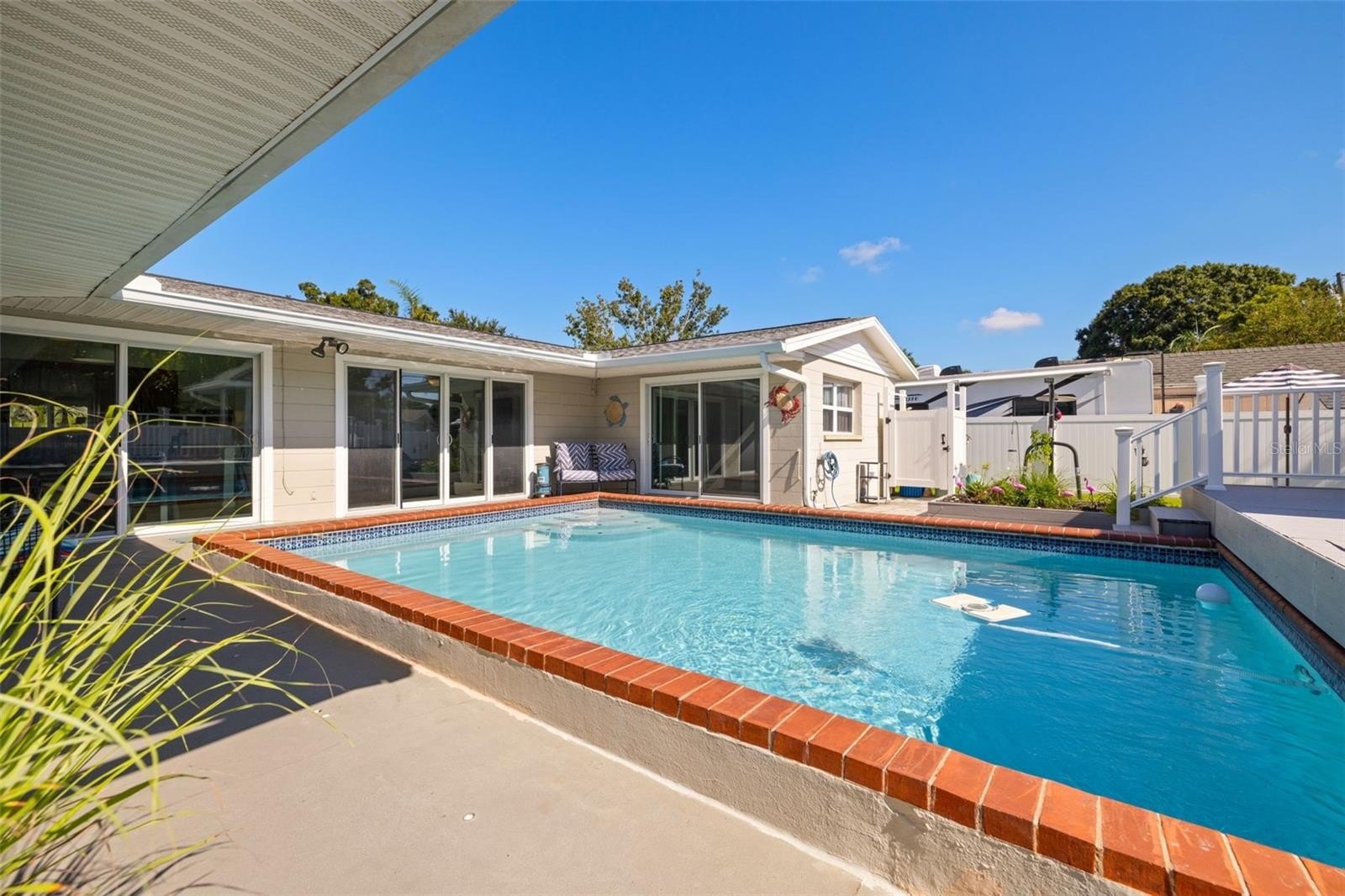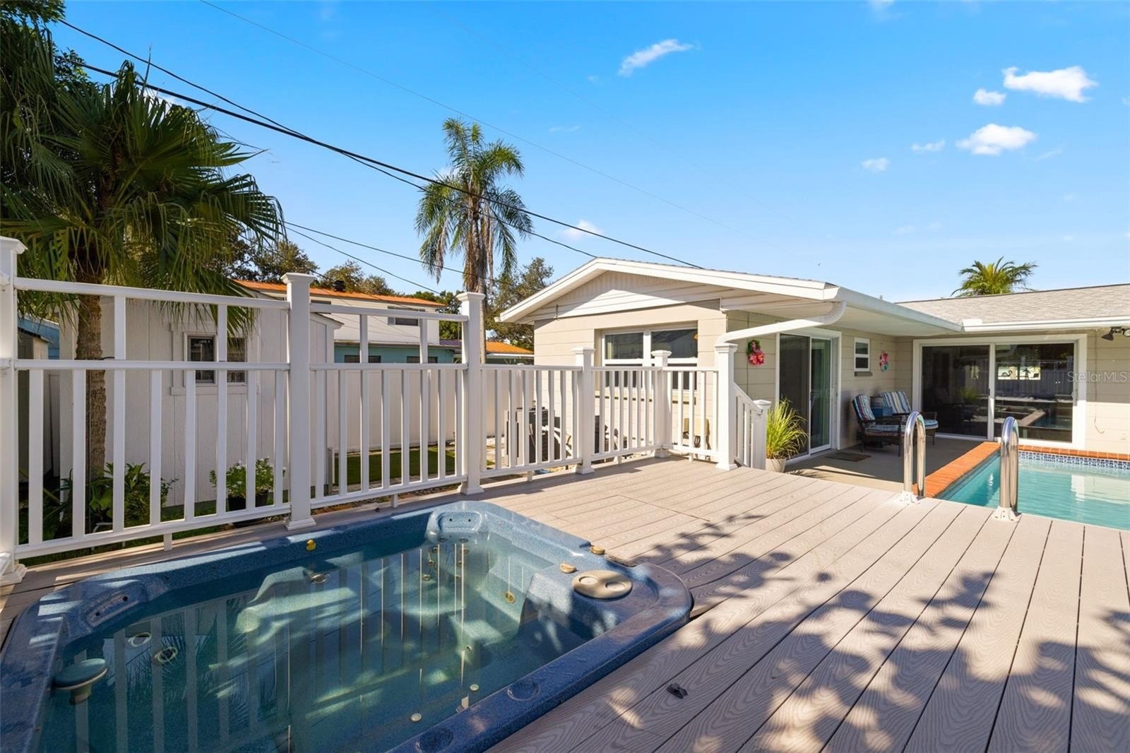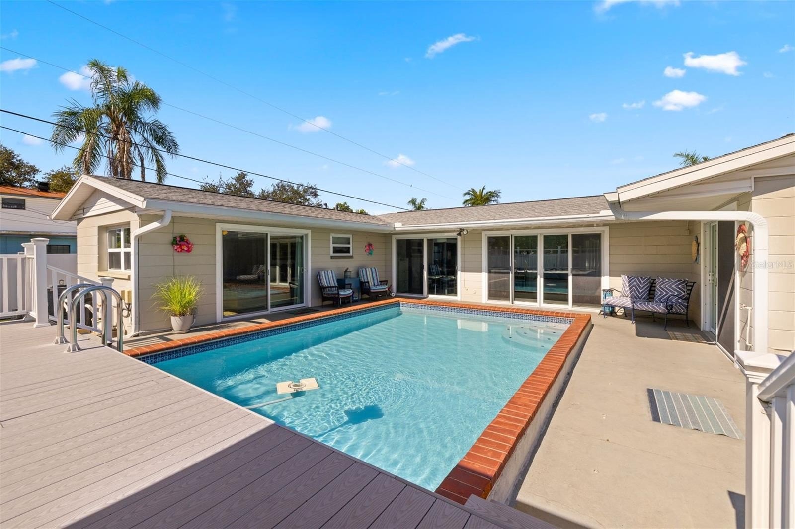 Resort-style living awaits in this beautifully updated 3-bedroom + BONUS ROOM, 2-bath, 1,419 sq ft POOL home in a desirable NON-FLOOD zone. Designed for both comfort and entertaining, the home welcomes you with an open floor plan where the living, dining, and kitchen spaces flow seamlessly together. Two expansive sets of sliding glass doors flood the interior with natural light and lead out to a private backyard oasis—complete with a sparkling pool, raised deck with hot tub, outdoor shower, and detached covered patio. The primary and secondary bedrooms each feature sliders overlooking the pool, blending indoor and outdoor living, while a versatile bonus room offers flexibility for a home office, gym, or media room. A separate laundry room adds convenience and functionality. Throughout the home, ceramic tile floors add a clean, modern touch and enhance the open, airy feel. Thoughtful updates provide peace of mind, including a new roof (2020), HVAC (2020) with the last service completed in June 2025 along with the installation of a new UV light, hurricane-rated Jeld-Wen sliding doors (2017 & 2019), resurfaced pool (2021), and a brand-new circular driveway (2024). Ample storage and outdoor living features make this home as functional as it is inviting. Perfectly located just minutes from downtown St. Petersburg’s vibrant dining, arts, and waterfront parks, with convenient access to Tampa International Airport and the Gulf beaches, this property offers the very best of Florida living.