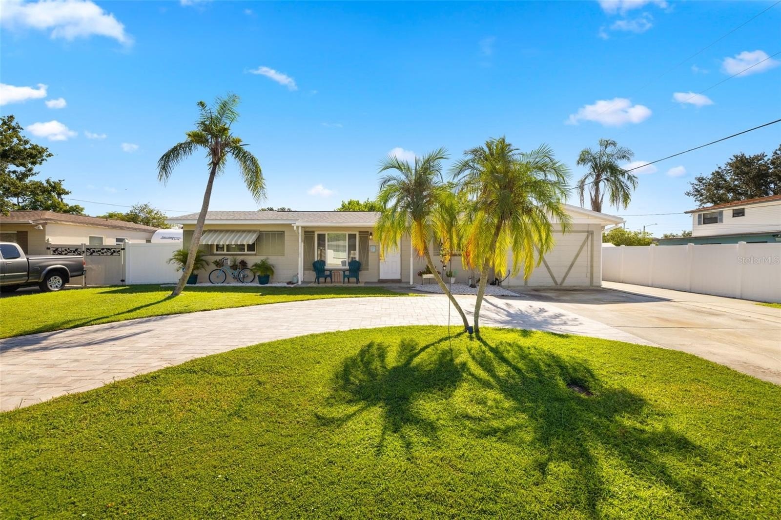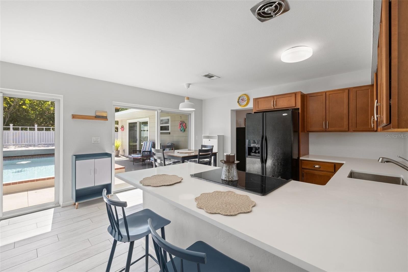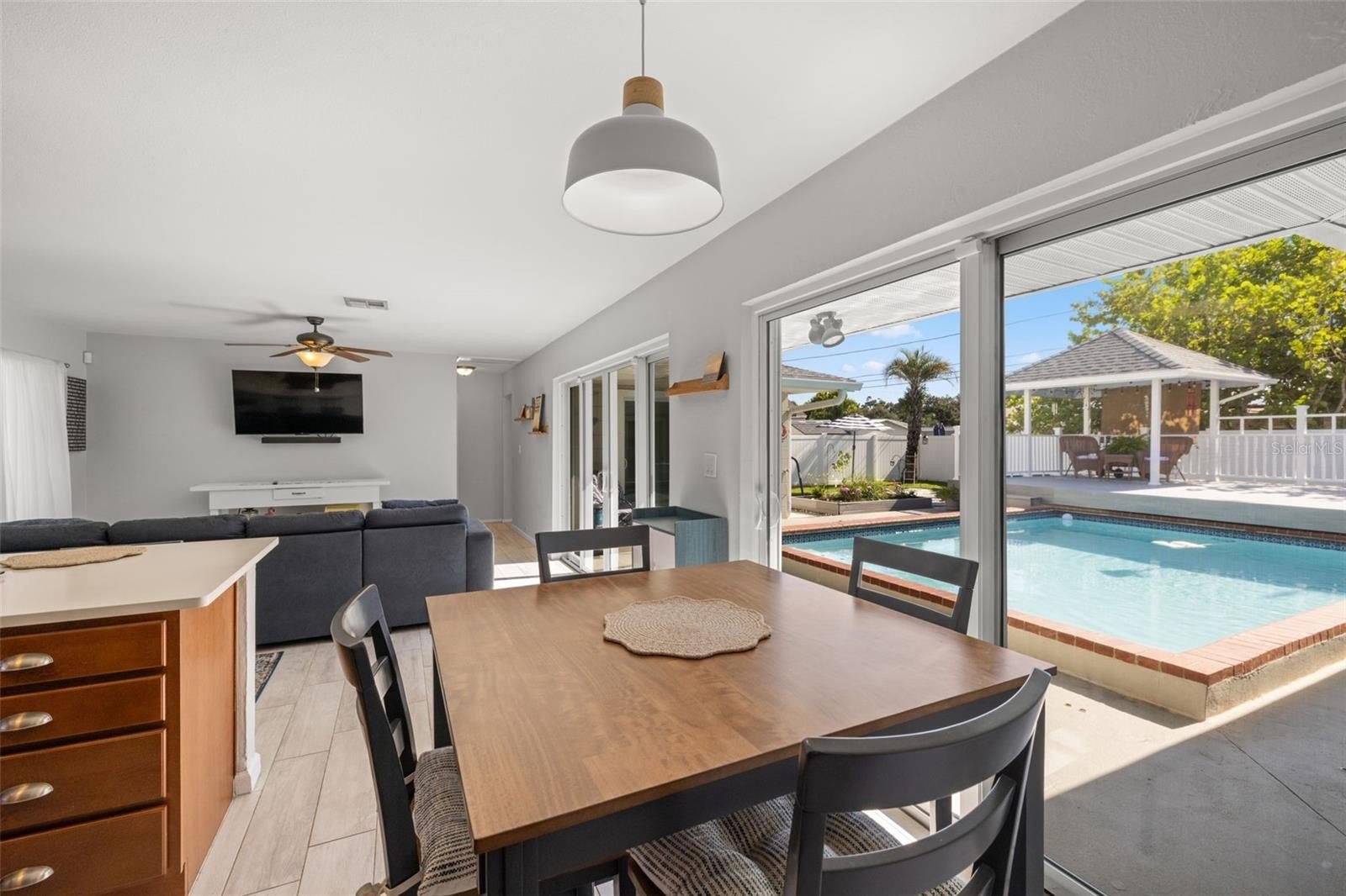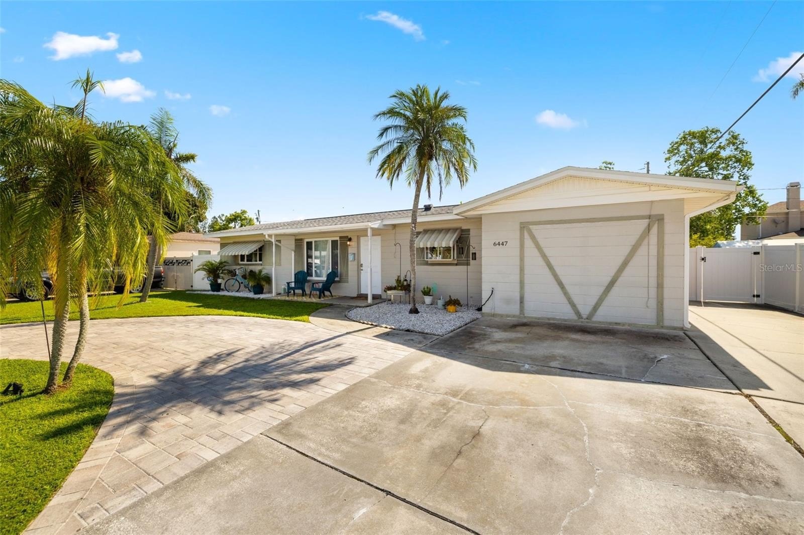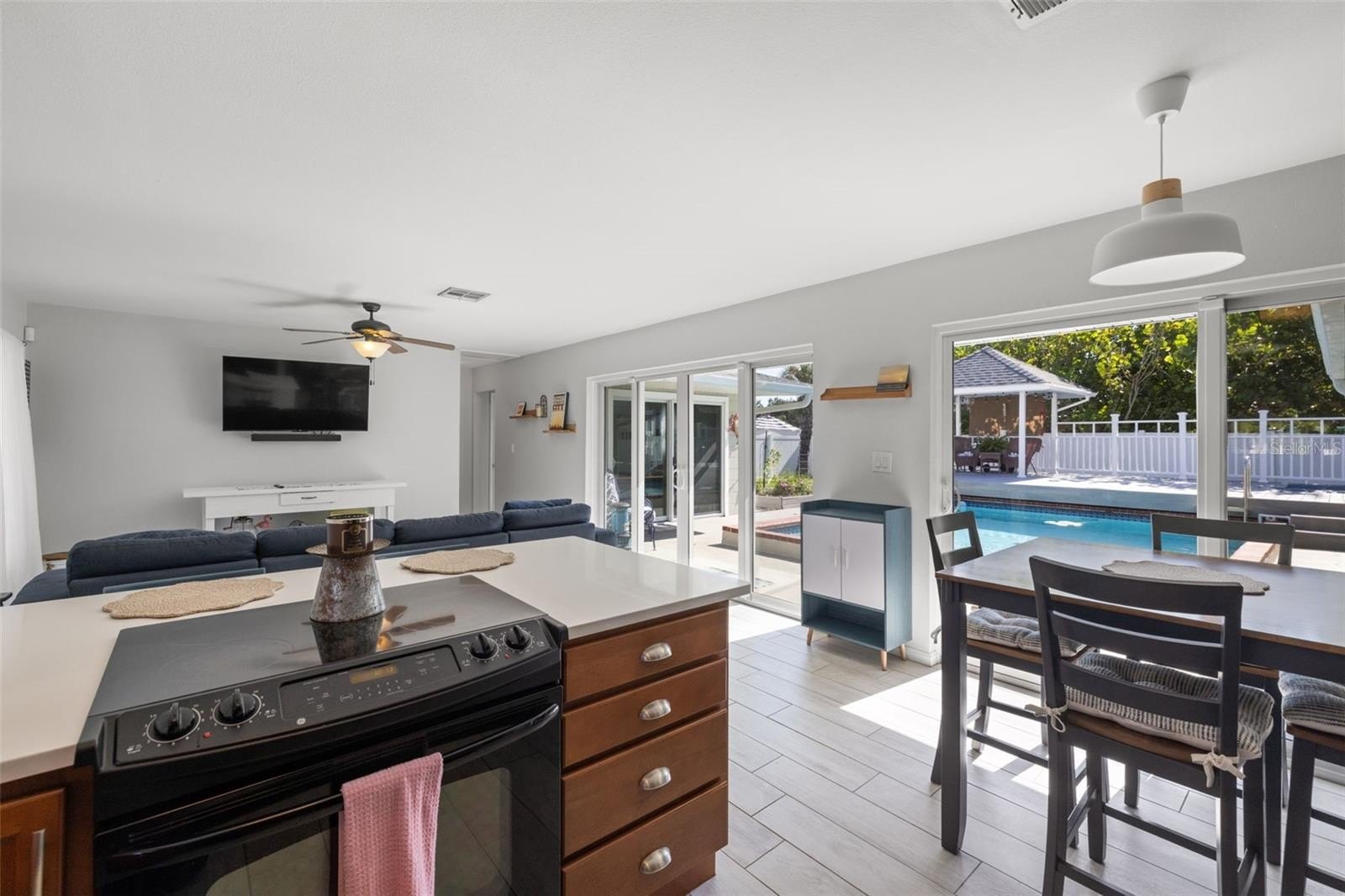 Resort-style living awaits in this beautifully updated 3-bedroom + BONUS ROOM, 2-bath, 1,419 sq ft POOL home in a desirable NON-FLOOD zone. Designed for both comfort and entertaining, the home welcomes you with an open floor plan where the living, dining, and kitchen spaces flow seamlessly together. Two expansive sets of sliding glass doors flood the interior with natural light and lead out to a private backyard oasis—complete with a sparkling pool, raised deck with hot tub, outdoor shower, and detached covered patio. The primary and secondary bedrooms each feature sliders overlooking the pool, blending indoor and outdoor living, while a versatile bonus room offers flexibility for a home office, gym, or media room. A separate laundry room adds convenience and functionality. Throughout the home, ceramic tile floors add a clean, modern touch and enhance the open, airy feel. Thoughtful updates provide peace of mind, including a new roof (2020), HVAC (2020) with the last service completed in June 2025 along with the installation of a new UV light, hurricane-rated Jeld-Wen sliding doors (2017 & 2019), resurfaced pool (2021), and a brand-new circular driveway (2024). Ample storage and outdoor living features make this home as functional as it is inviting. Perfectly located just minutes from downtown St. Petersburg’s vibrant dining, arts, and waterfront parks, with convenient access to Tampa International Airport and the Gulf beaches, this property offers the very best of Florida living.