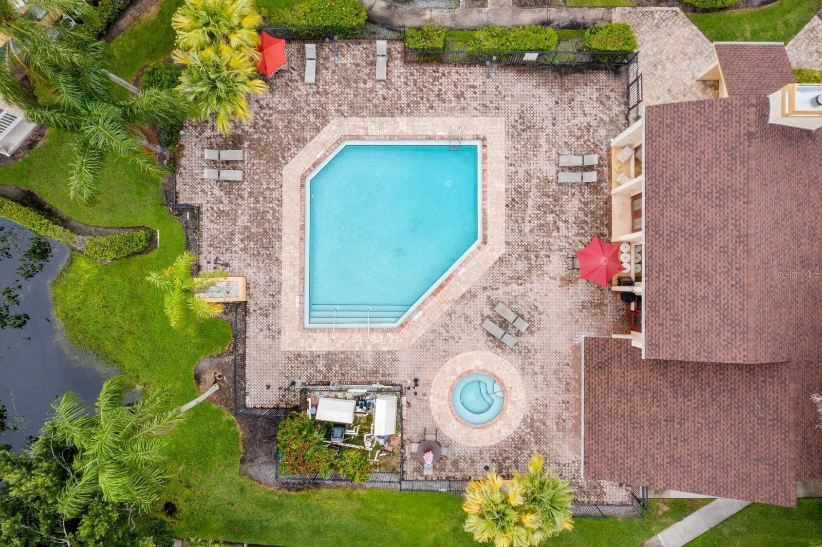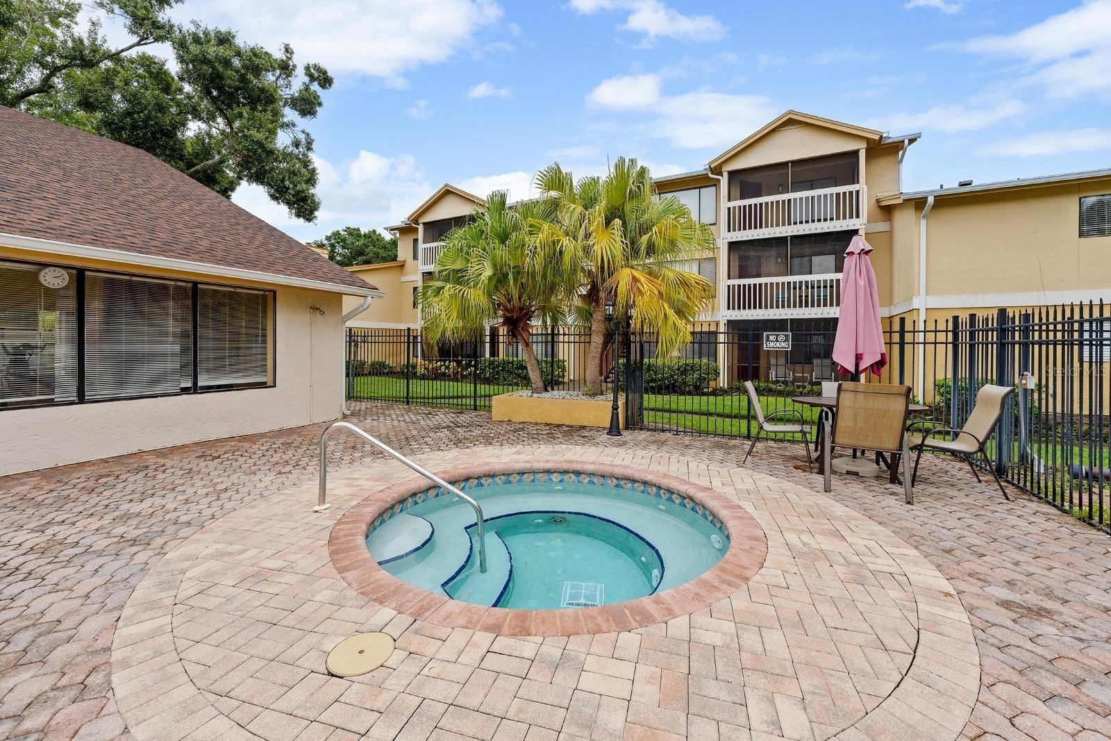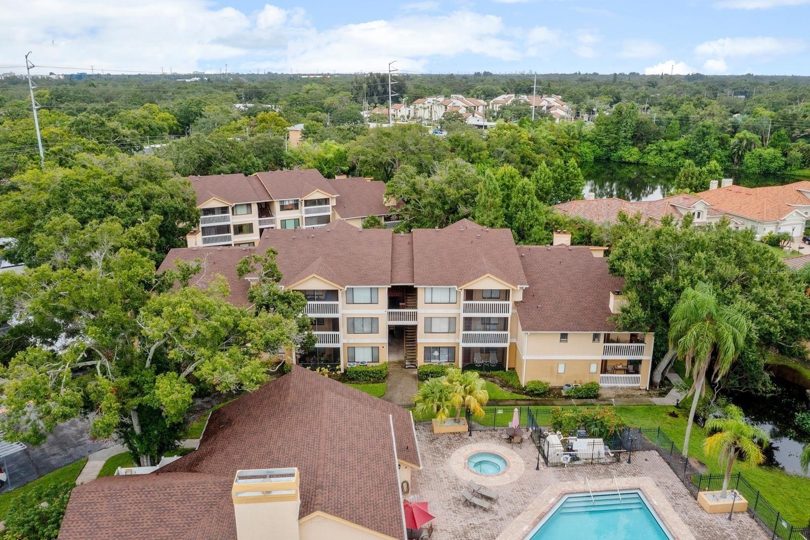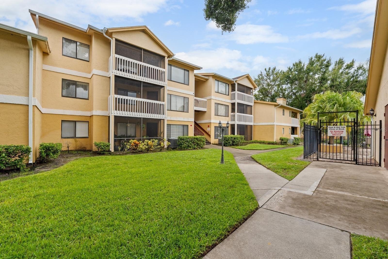 Condo fees cover: clubhouse, pool, hot tub, sauna, gym, ground and exterior maintenance, trash service, roof upkeep, and security cameras around the premises.