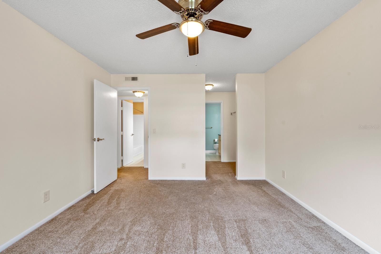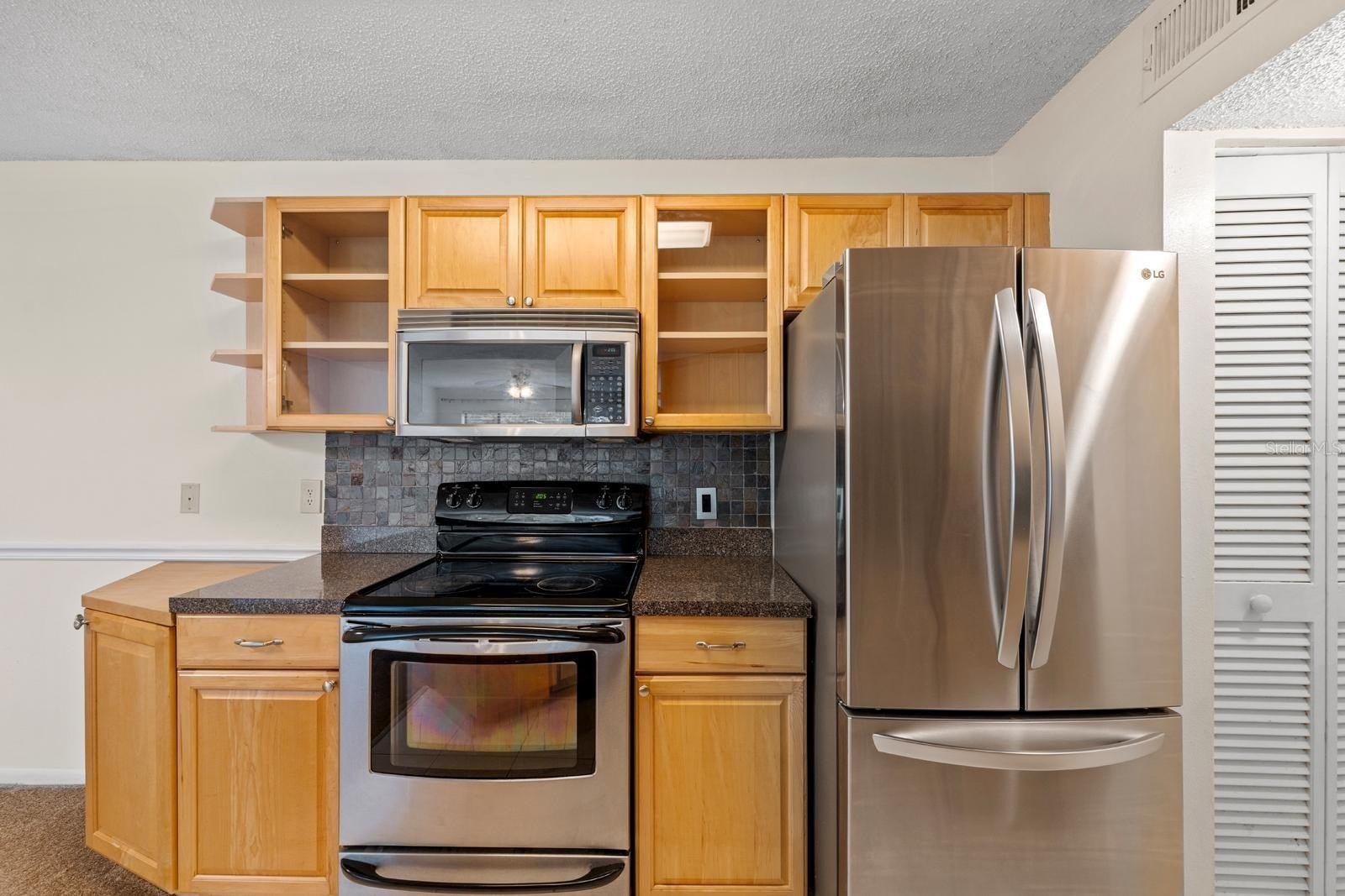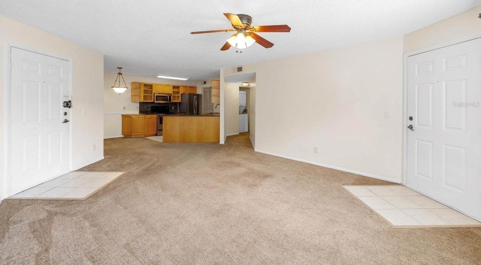 The kitchen features newer stainless steel appliances, and a convenient laundry closet with a stackable washer and dryer is located in the corridor. Important updates include a new A/C system (2023) and a water heater (2021), giving you peace of mind.