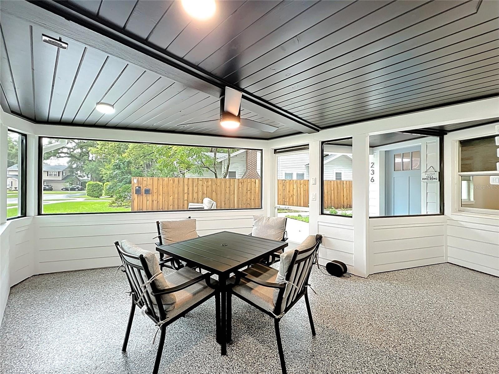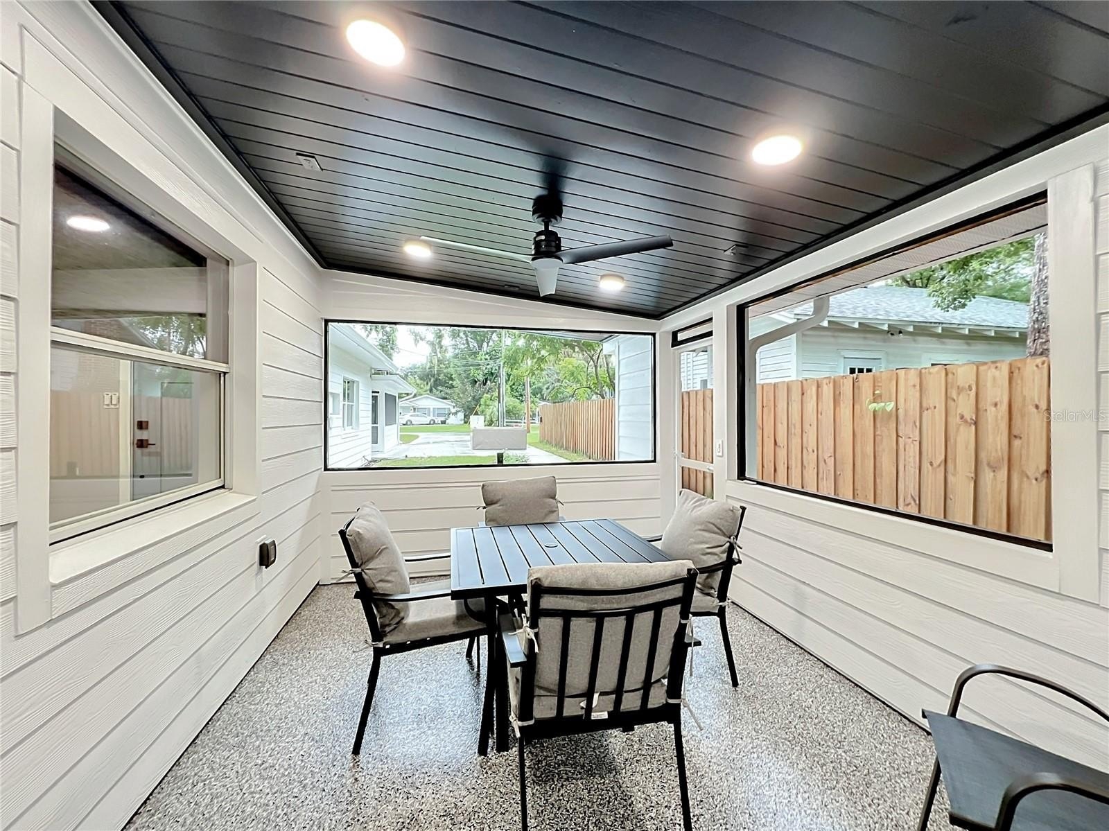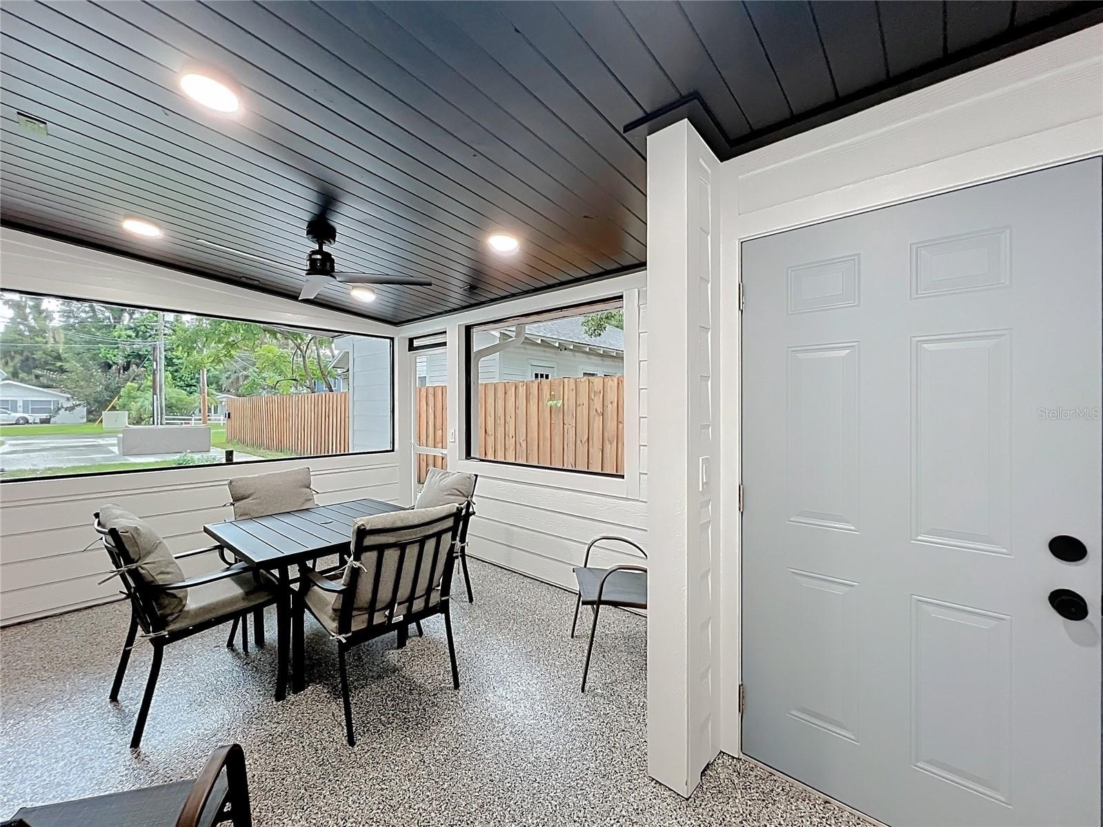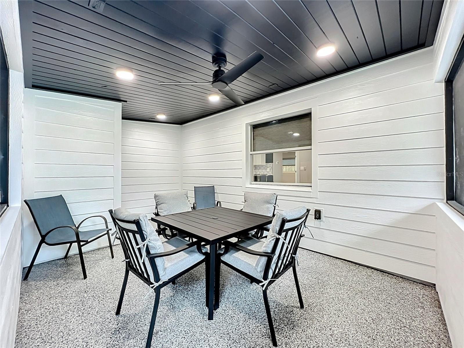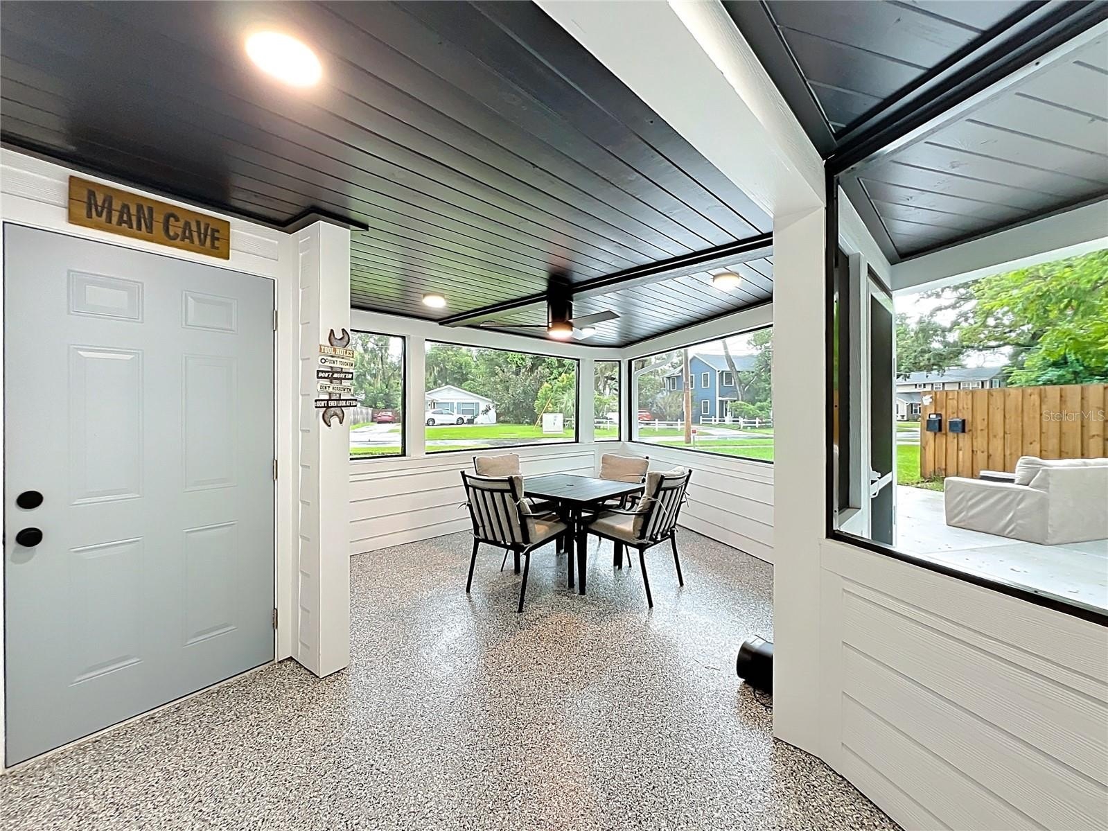 The custom epoxy floors, ceiling fans and a set of table and chairs make the screened in porch area an exceptional place to relax after a long day of work. There are also water closets with new water heaters and additional storage in the screened in porch areas.