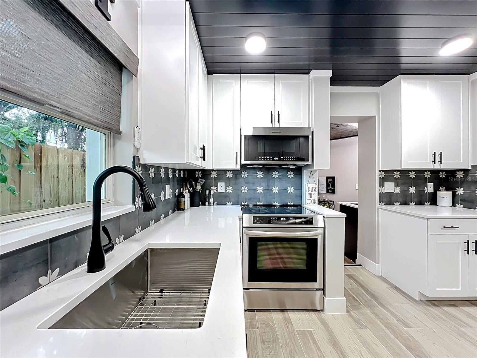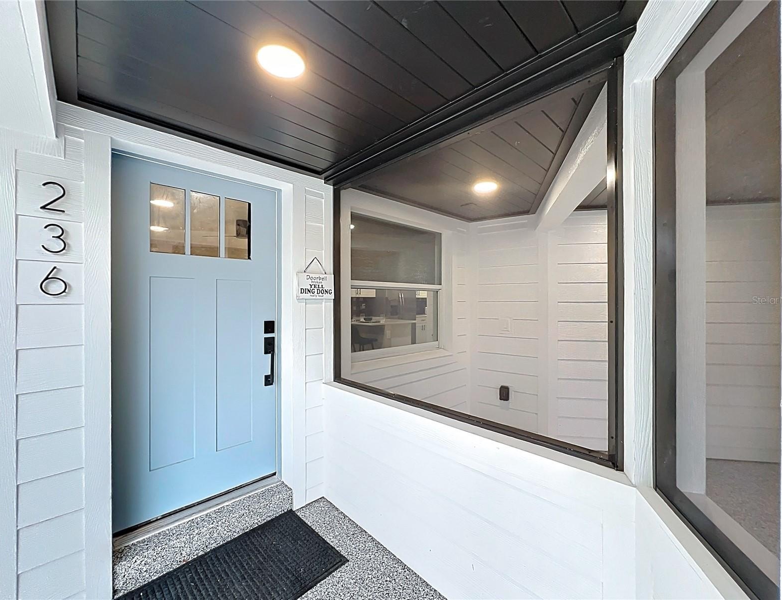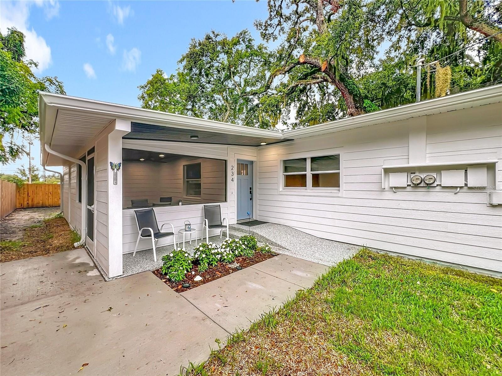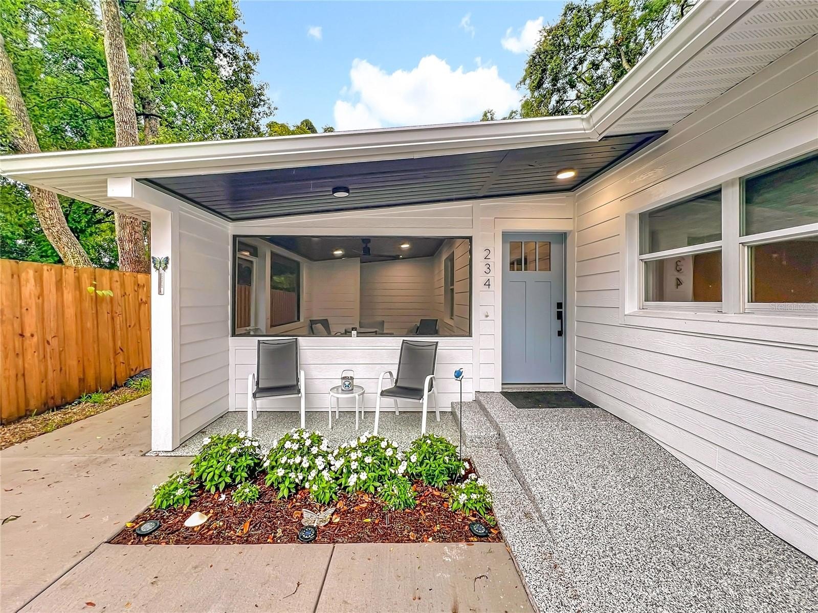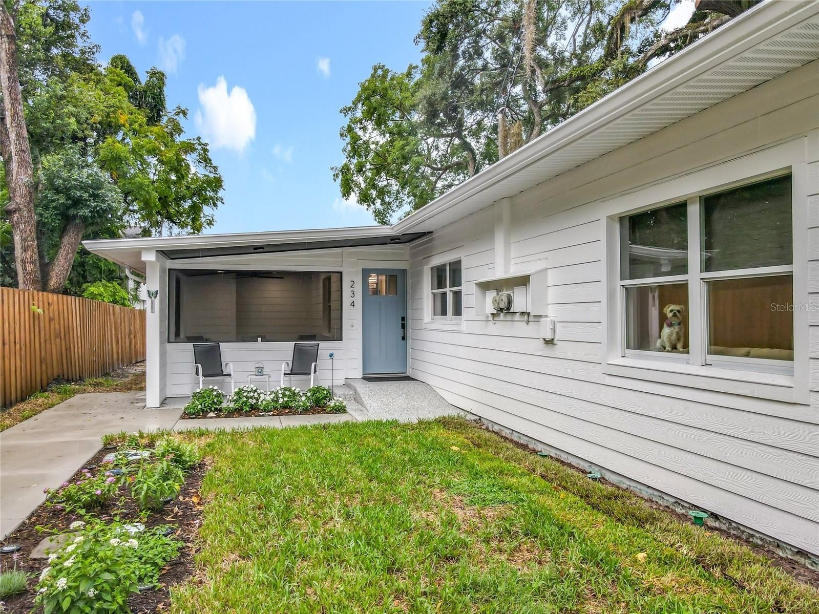 The colorful landscaping, which includes a beautiful new courtyard finish off the exterior renovations of this home.