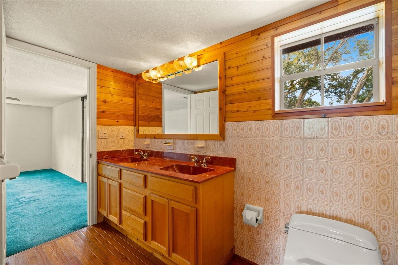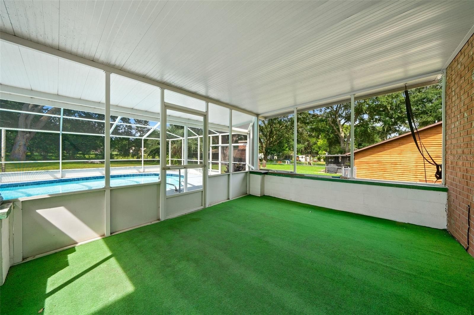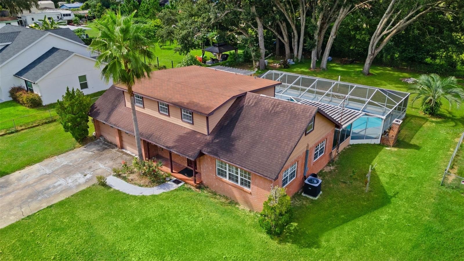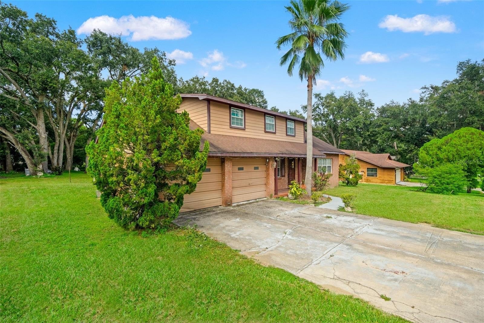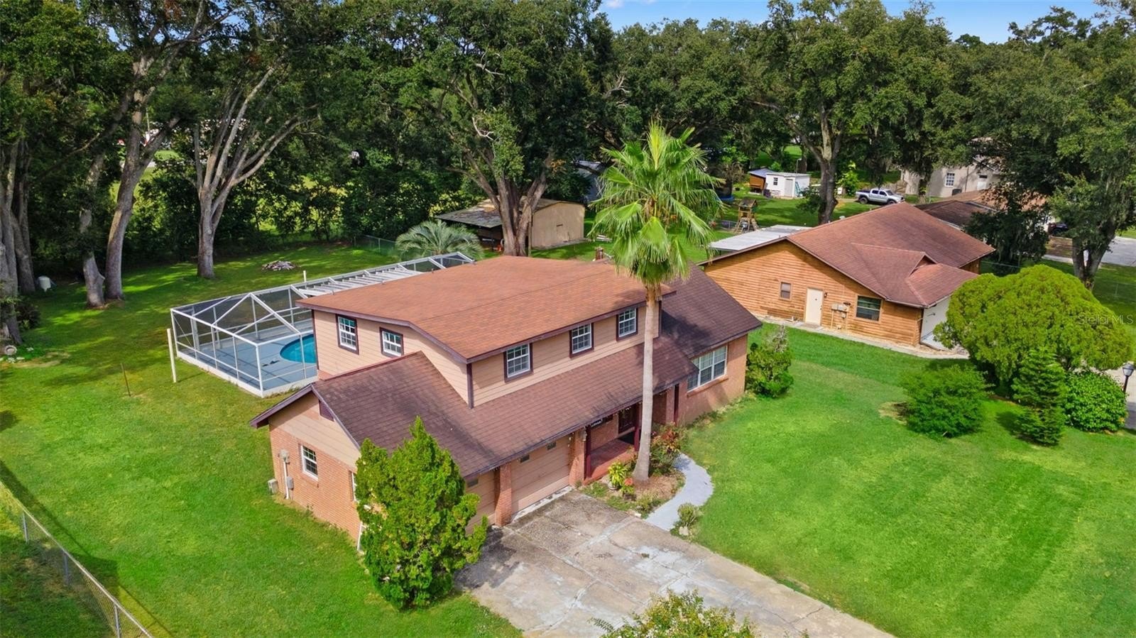 Enjoy year-round entertaining with the built-in Gunite pool, updated pool pump, and well-maintained screen enclosure. The concrete deck provides plenty of room for lounging, with just a touch of TLC needed to make it shine. A separate dining room completes the first floor, ideal for family meals and gatherings. Upstairs, the primary suite includes a private balcony overlooking the pool and backyard, while two additional bedrooms have built-in closets and comfortable carpet flooring. The backyard is fenced on three sides for added privacy, and the home includes a spacious two-car garage for convenience. With solid bones and a little TCL, this home is ready for your personal touch and offers tremendous potential in a desirable location.
