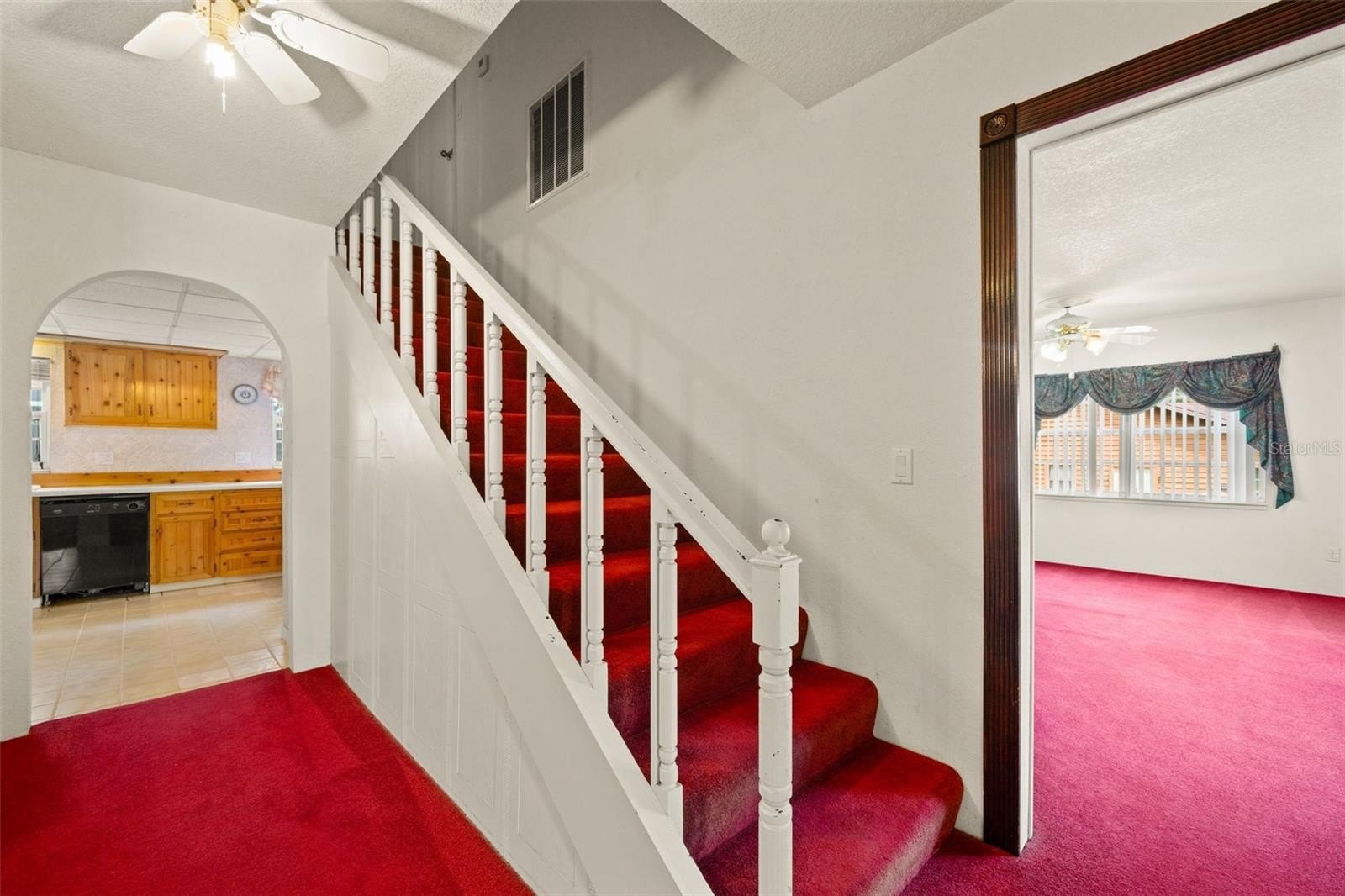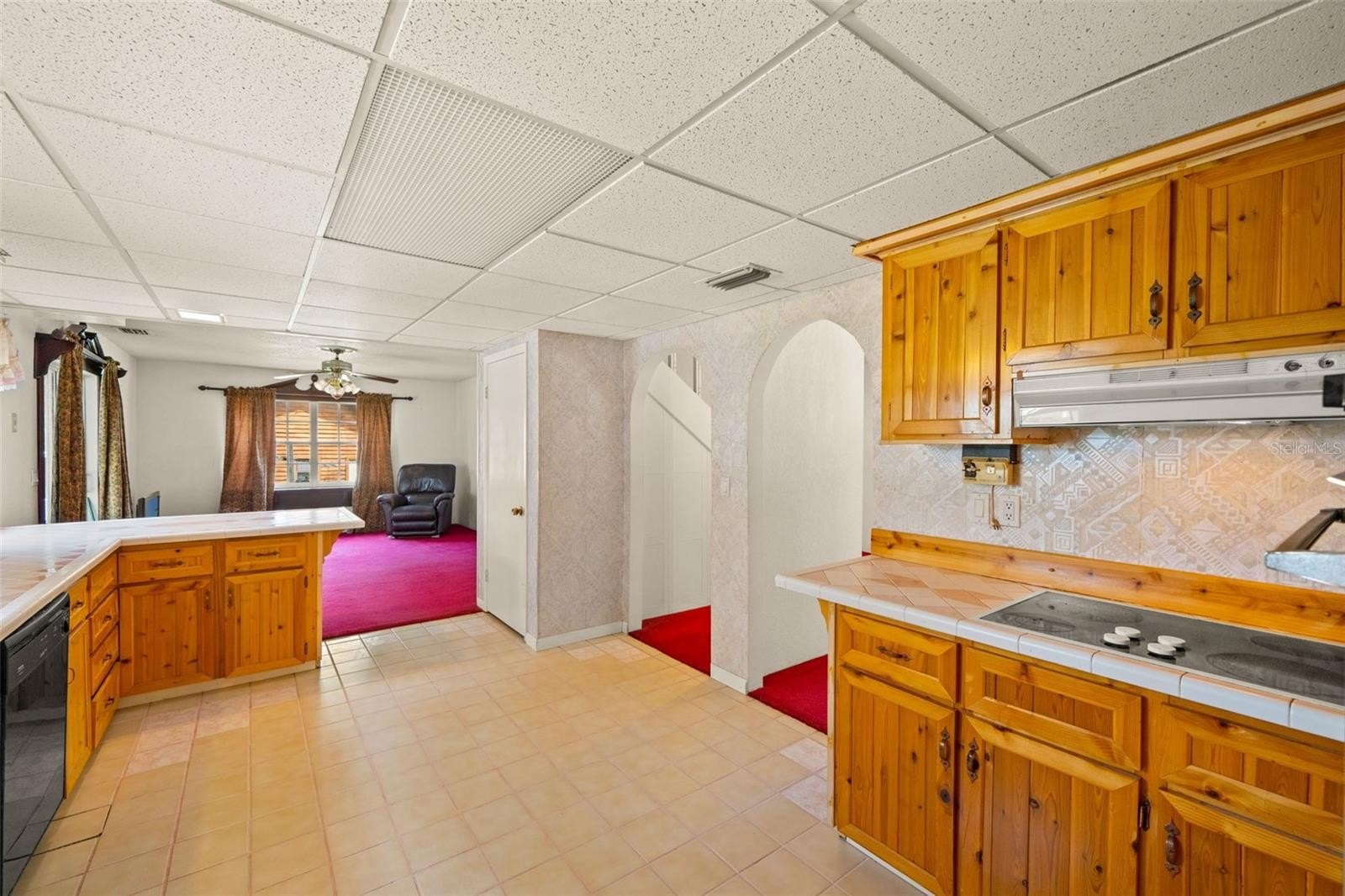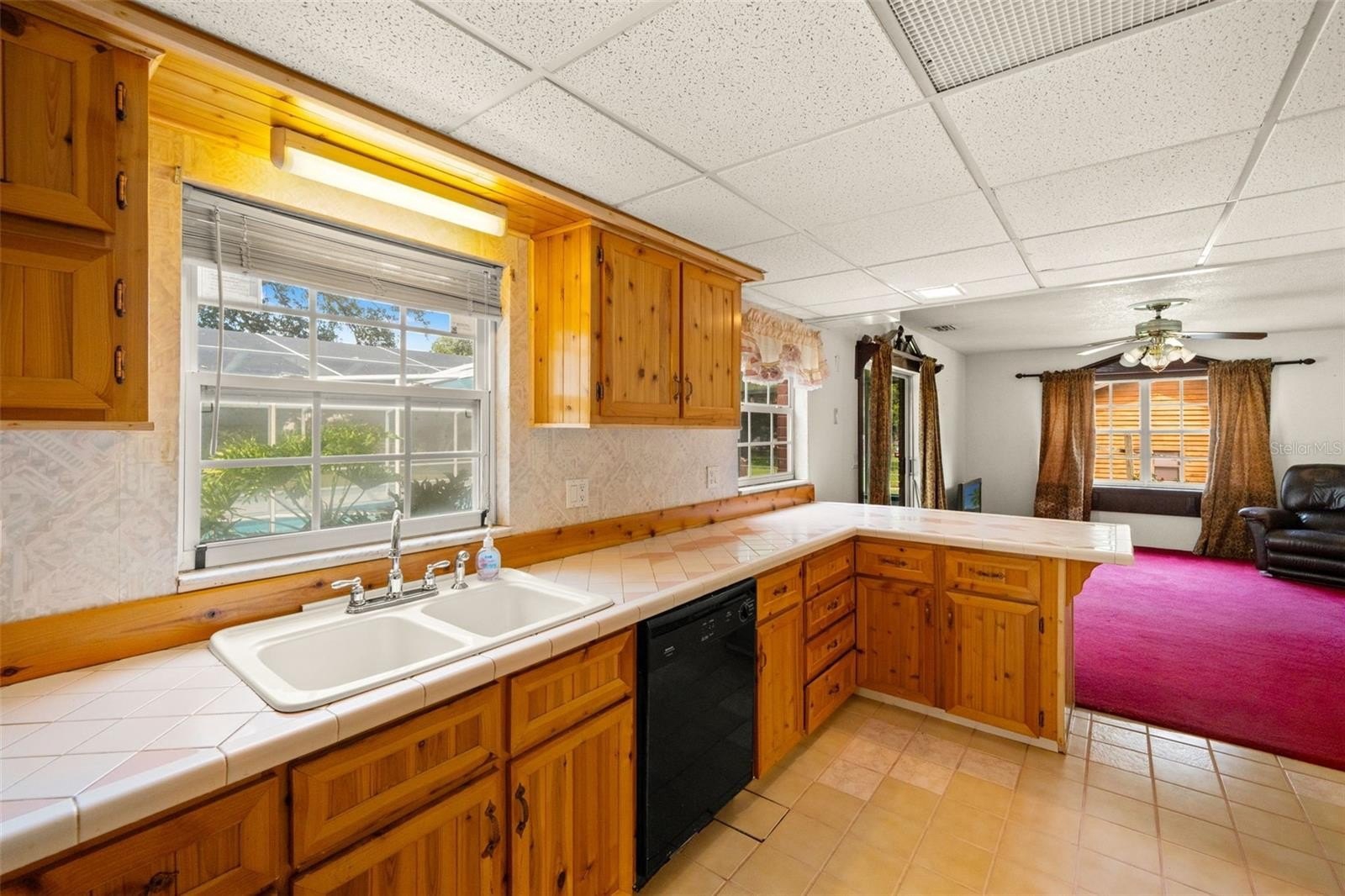 Welcome to this inviting two-story home featuring 3 bedrooms, 2 bathrooms, and a sparkling pool, perfect for Florida living. The main floor offers a functional layout with a bright kitchen boasting wood cabinetry, tile flooring, tiled countertops, and ample storage. The kitchen opens to the living room, where you’ll find cozy carpeting, a ceiling fan, and sliding glass doors leading to the screened lanai and pool area.