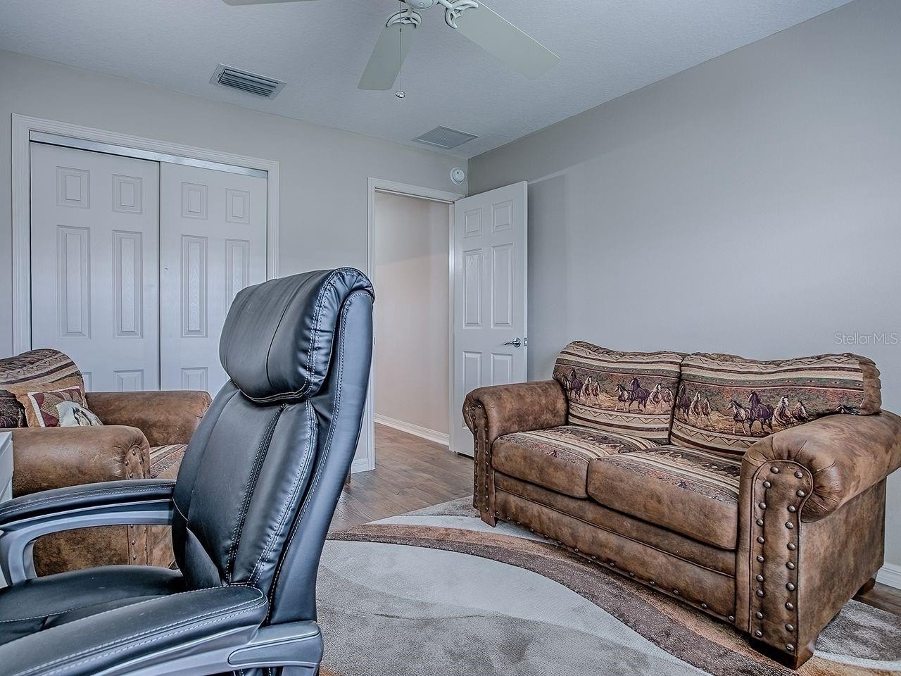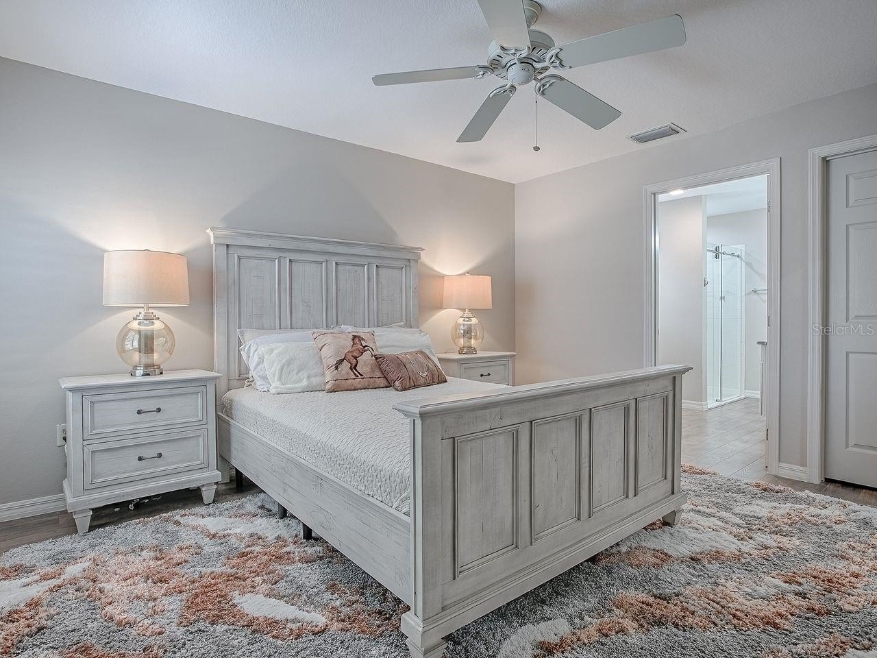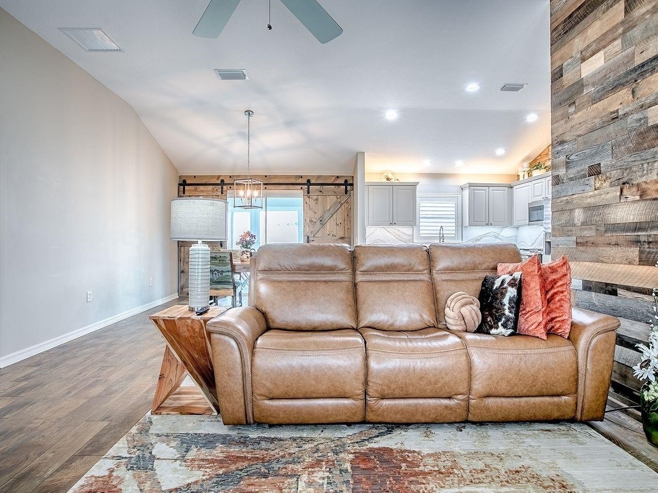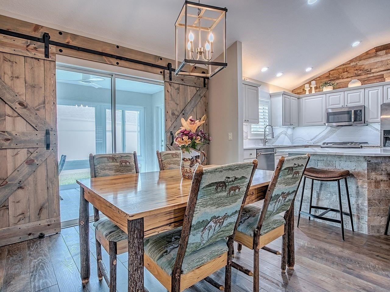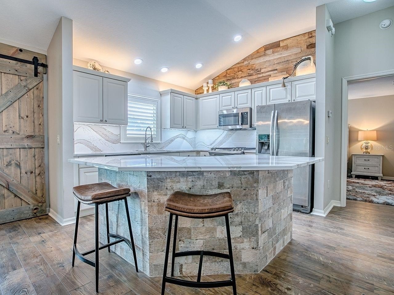 Beautifully Renovated 3/2 Azalea Model in the Highly Desirable Village of Winifred. This block-and-stucco 3-bedroom, 2-bath Azalea model has been thoughtfully renovated, offering a blend of modern finishes and timeless charm. Step inside to find all-new luxury vinyl plank flooring, stylish wood accent walls, and barn doors leading to the recently enclosed lanai. From there, enjoy the expansive birdcage with a brand-new hot tub—perfect for relaxing or entertaining. The kitchen features elegant quartz countertops and backsplash, while the bathrooms showcase granite counters, adding a touch of luxury throughout. There are plantation shutters throughout as well. This home is move-in ready, with upgrades designed for both comfort and style. Freshly painted both inside and out last year. ROOF replaced in 2022, HVAC replaced in 2018, HOT WATER HEATER replaced in 2015. There is NO KISSING LANAI due to a wall behind the property, so you have total privacy! The Village of Winifred is one of the most sought-after neighborhoods in The Villages, offering three golf cart entrances/exits for maximum convenience: Direct access to Arnold Palmer Country Club; a path to Laurel Manor Recreation Center, with nearby medical services and a veterinarian; easy connection to Buena Vista Boulevard, leading to Southern Trace Shopping Center and numerous restaurants, banks and other amenities. Also, There is only one entrance/exit by car for added security. You’ll also enjoy being just a short golf cart ride to Lake Sumter Landing Square, with Spanish Springs Square only about 15 minutes away. This home offers not only a prime location but also a host of updates and lifestyle conveniences that make it truly special and the BOND IS PAID!