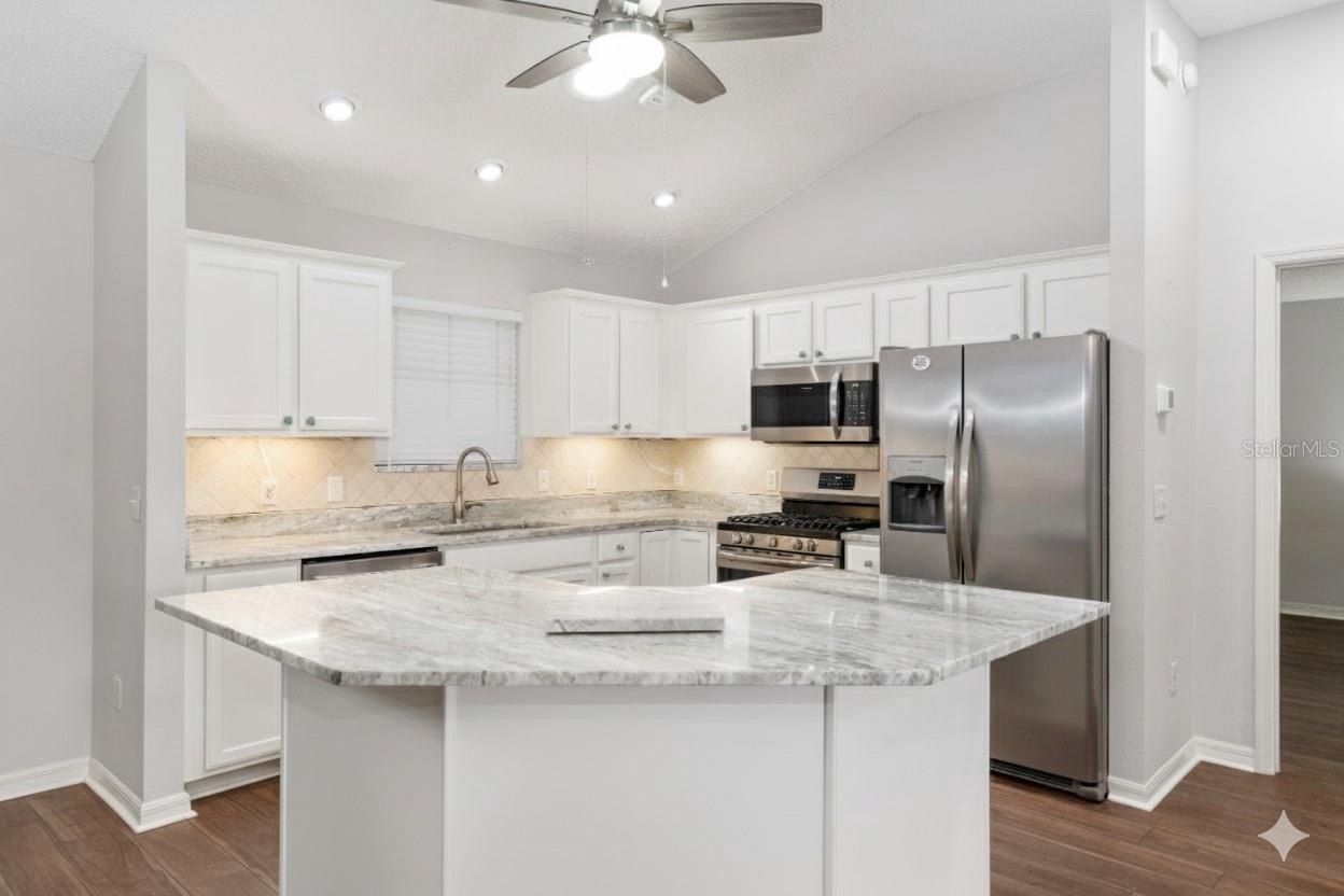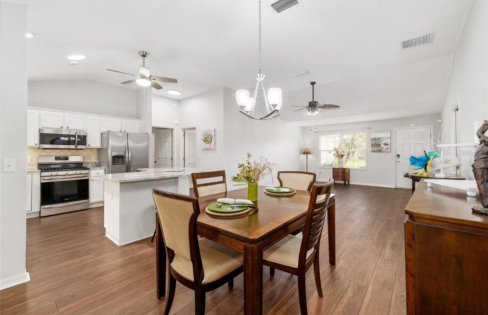 Can you believe the price of this UPDATED 3/2 Bougainvillea (formerly Banyan) Model which is MOVE-IN READY in the desirable VILLAGE OF PIEDMONT near Lopez Country Club? What's important- ROOF 2022, HVAC 2016 AND WATER HEATER 2019. The front curb appeal is so inviting with lava rock and mature landscaping leading to the covered porch. There has been a recent addition of the pitched front porch roof extension to provide cover of the front door. This makes this model unique as compared to similar ones. As you enter, you notice the OPEN FLOOR PLAN and CONTINUOUS LAMINATE FLOORING (no carpet!) with the comfortable living area front and center. The kitchen has been made bright and inviting with NEW GRANITE, FIXTURES and light toned cabinets. The stainless appliances were replaced in 2019 except for the new dishwasher (2024). The kitchen also boasts TILE BACKSPLASH, Solar Tube, and Under-Cabinet Lighting with a GAS STOVE! The Primary Bedroom is spacious with en-suite and a large walk-in closet. The bathroom has a tile floor and updated walk-in shower, linen closet, and the same beautiful Granite counter. The Guest Bedrooms are comfortable and inviting with ceiling fans and both have closets. There is an updated guest bathroom with tub/shower combo and linen closet between them. The large laundry room (inside) has a pantry and storage cabinets and leads to the 2 car garage with additional storage space in the attic and added cabinets. The lanai/enclosed Florida Room with glass/screens is cool and comfortable with roll-up blinds and an attached television which conveys with the home. It leads to an extended birdcage area with canopy for shade which provides extra seating and an entertaining option with new lighting. This area leads to outside for gardening and grilling with a new hose attachment. The backyard area is surrounded by mature landscaping to provide privacy from seasonal neighbors. You will be thrilled with the easy access to shopping, dining and the well-known Villages Squares! You're minutes away from many pools, recreation centers, golf cart path and Savannah Performing Arts Center. This is such a nice home and priced to sell. Make an appointment to see it today- you won't be sorry! (Some of these photos have been virtually staged)