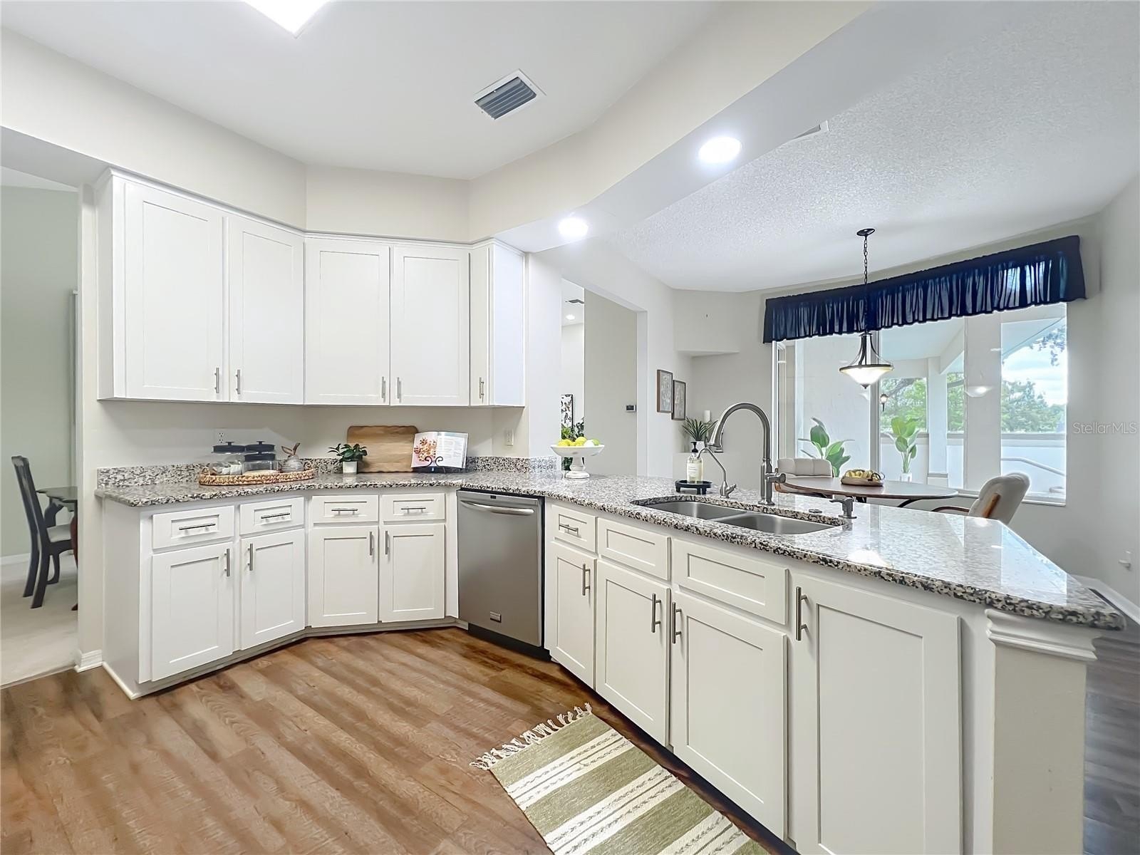 The primary suite is a true retreat, offering French doors to the pool area, walk-in closet, and a spa-like en-suite bathroom with dual vanities, a soaking tub, and a walk-in shower. The spacious eat-in kitchen is perfect for entertaining—complete with granite countertops, shaker-style cabinetry, stainless steel appliances, and a bright dinette overlooking the pool. Additional features include a formal living/dining combo, a large guest bedroom with a walk-in closet, a third full bathroom, and an inside laundry room leading to a 2-car garage with a dedicated workspace.