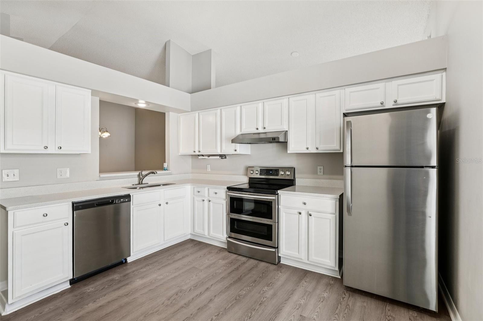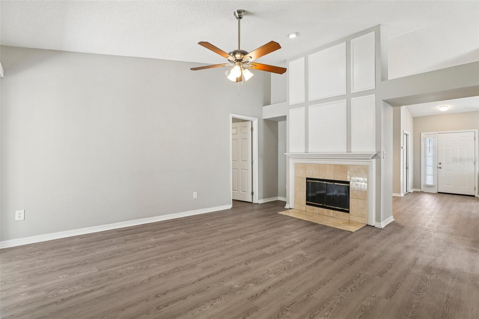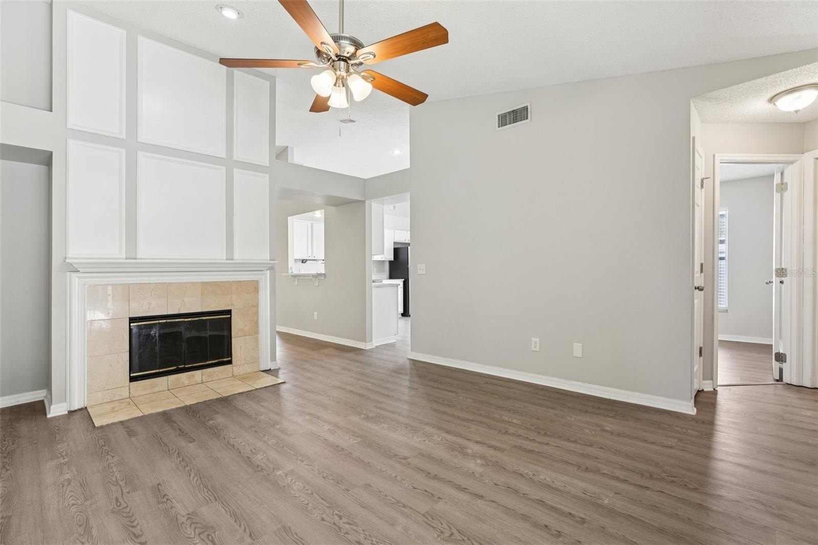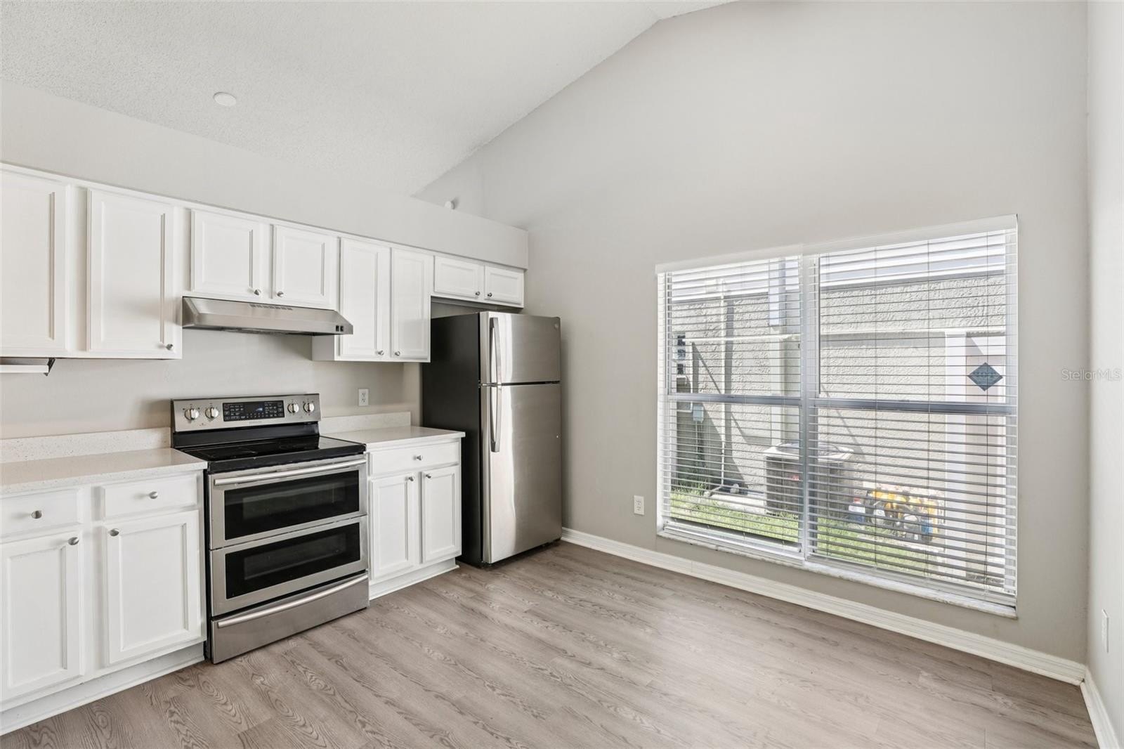 Continue into the inviting family room where a fireplace creates a relaxing ambiance, seamlessly flowing into the kitchen complete with stainless steel appliances, stone countertops, and an eat-in area.