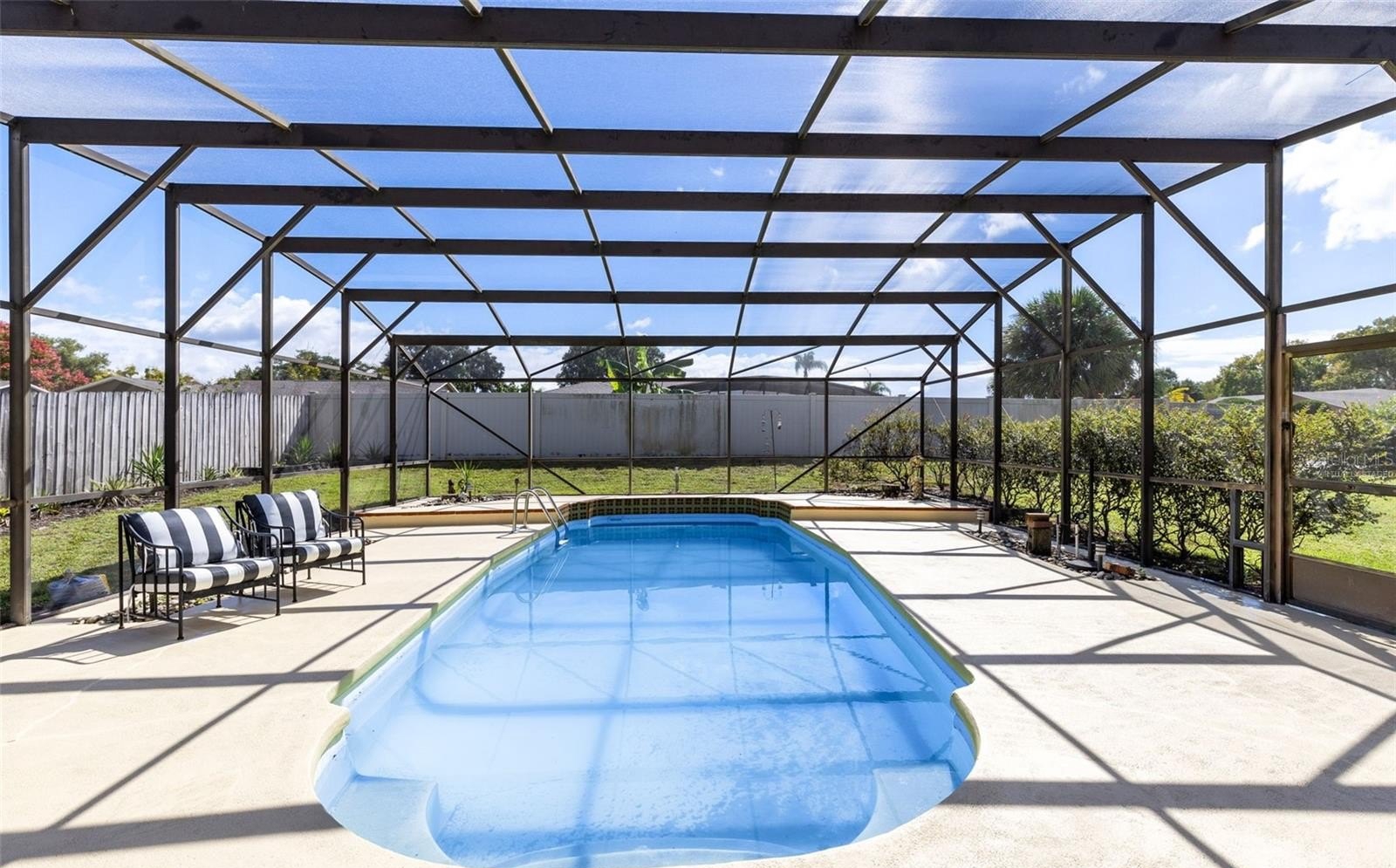Outside, enjoy year round relaxation in your screened pool and patio area, perfect for cooling off on warm afternoons or hosting weekend barbecues. The vinyl fence adds privacy and a clean, low maintenance look to the backyard. The split bedroom floor plan ensures comfort and privacy for all. The primary suite features a newly renovated bathroom with stylish finishes, while the secondary bedrooms are generous in size and share a well appointed guest bath. The dedicated office provides a quiet retreat for working from home, studying, or hobbies. Additional highlights include an oversized side-entry garage with built-in storage shelving and a workbench, ideal for projects or extra storage space. Major updates have already been taken care of for peace of mind — including a new roof (2025) and new pool screens (2025). This is a truly special home that combines modern updates, flexible living spaces, and a private outdoor retreat all in a desirable location close to shopping, dining, and top-rated schools. Schedule your private tour today!