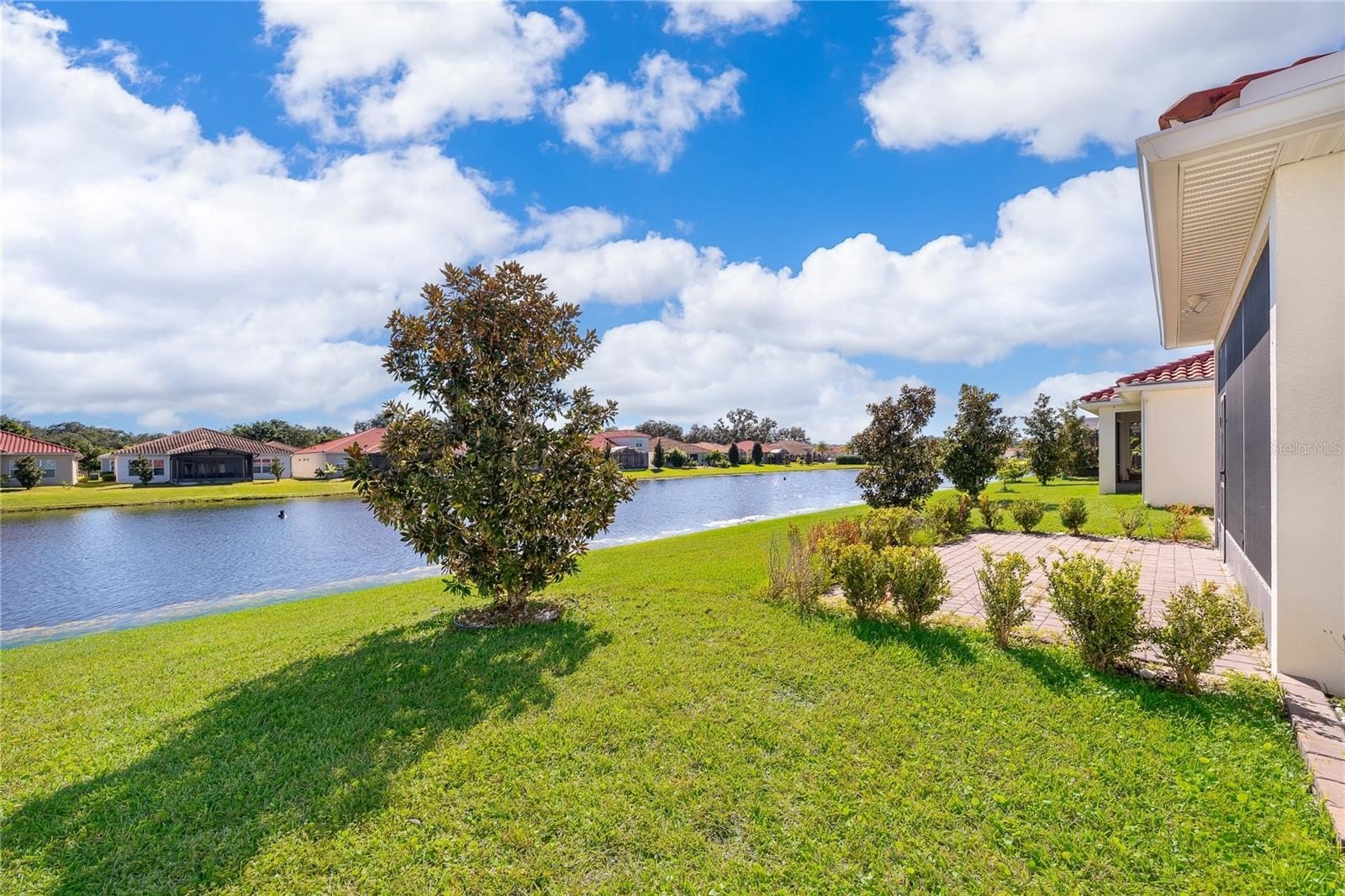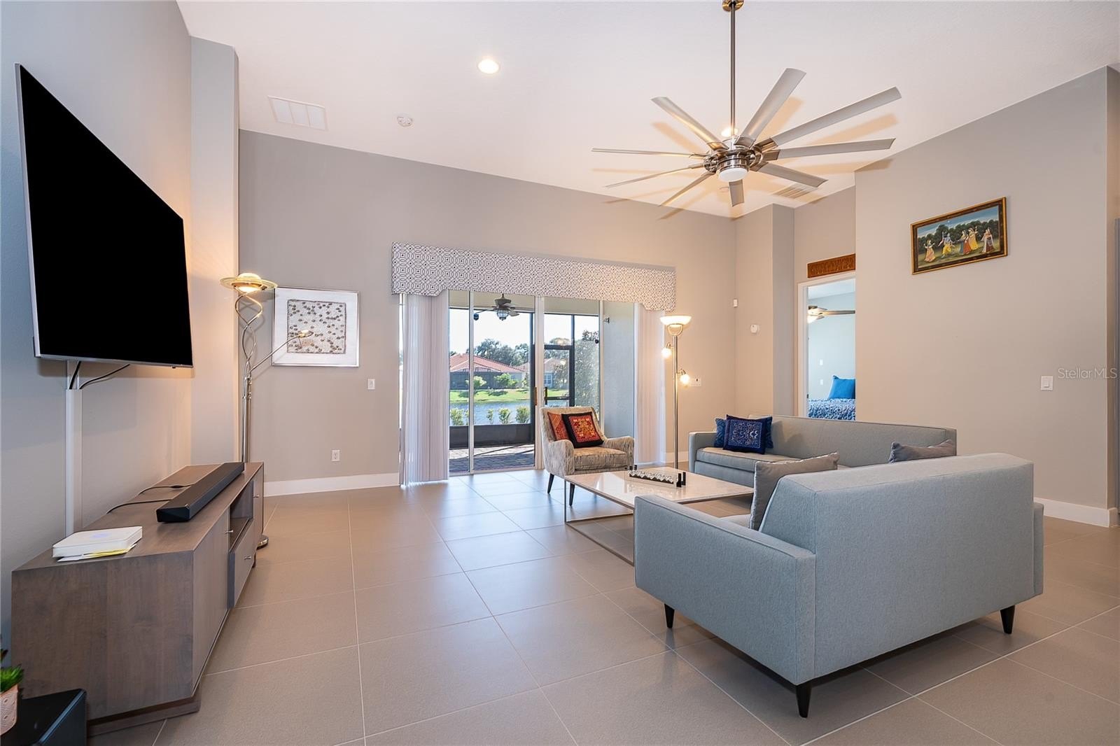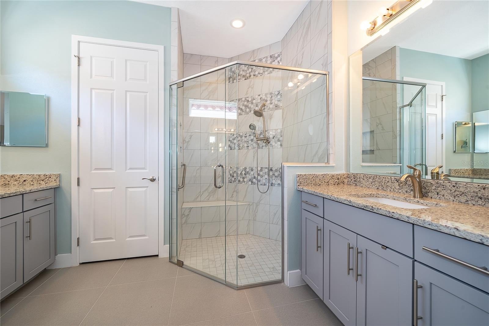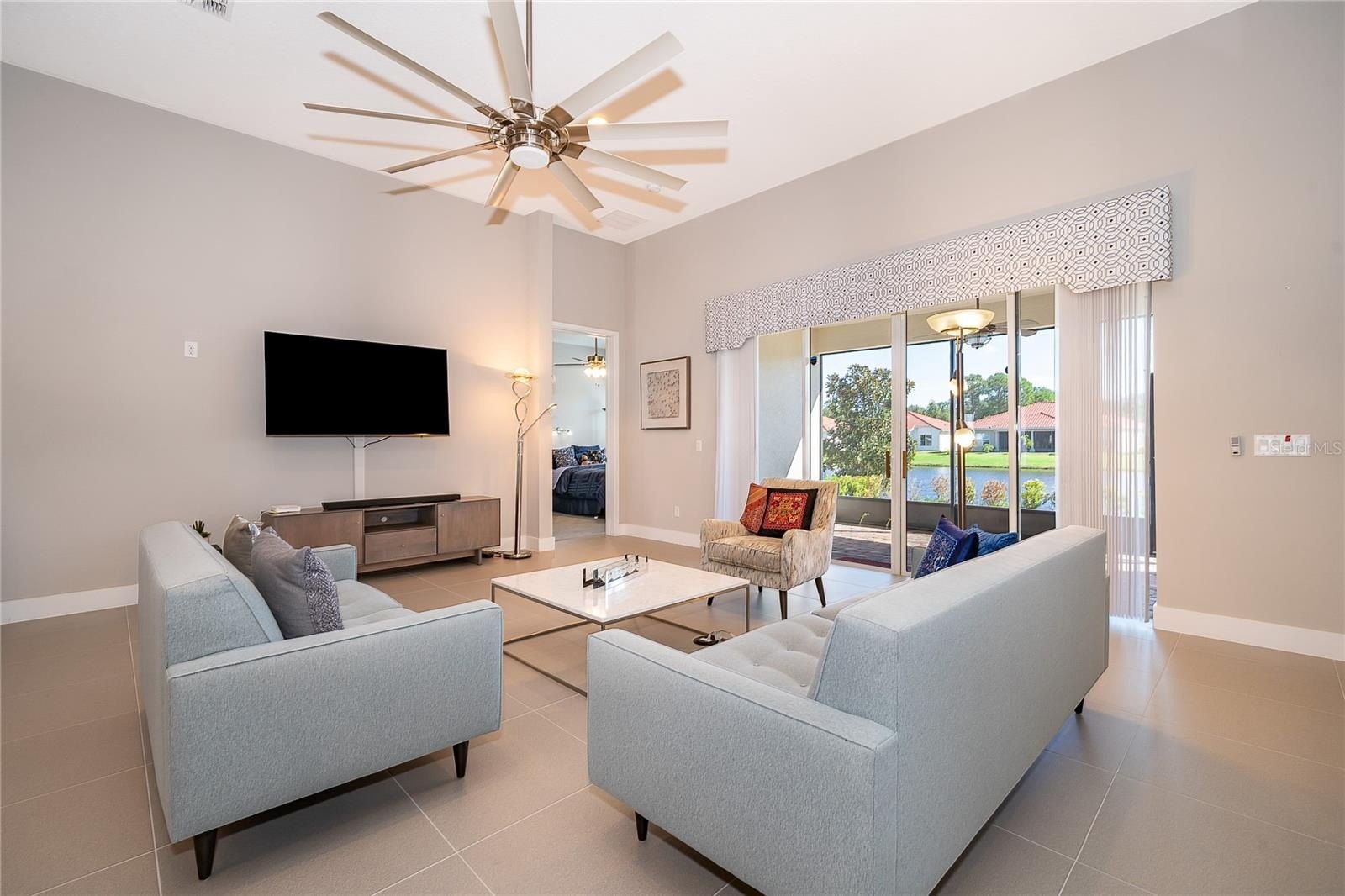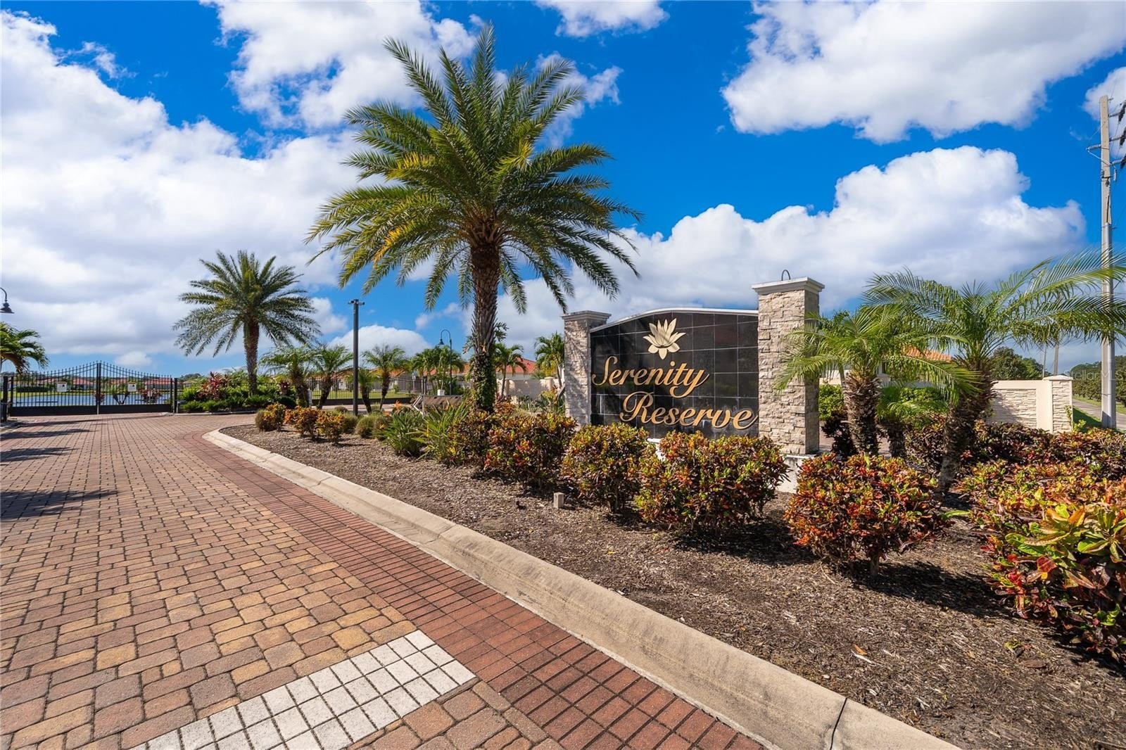 Location, Location, Location!!! You will not want to miss this outstanding opportunity to be an owner in this amazing 55+ Luxury Active Adult Gated Community of Serenity Reserve! This elegant one-story residence features 3 spacious bedrooms, each with its own private full bath and walk-in closet, plus a bonus room. With 3.5 baths and a two-car garage, every detail of this semi-custom luxury home has been thoughtfully designed for comfort and convenience. Enjoy the premium water and fountain view lot from the comfort of your open-concept living space, enhanced by 12-foot ceilings, 8-foot doorways, and 12’ pocket sliding lanai doors that flood the home with natural light. The home showcases porcelain tile in all wet areas, rich wood flooring in the primary bedrooms, and granite countertops throughout the gourmet kitchen and bathrooms. The kitchen has an oversized central prep island, modish backsplash, 42” cabinets, and stainless steel Whirlpool appliances. Additional upgrades include:-Two master suites with custom closets, Wider paver driveway, Utility sink in the laundry room, Custom shades, Whole-home water purification system.