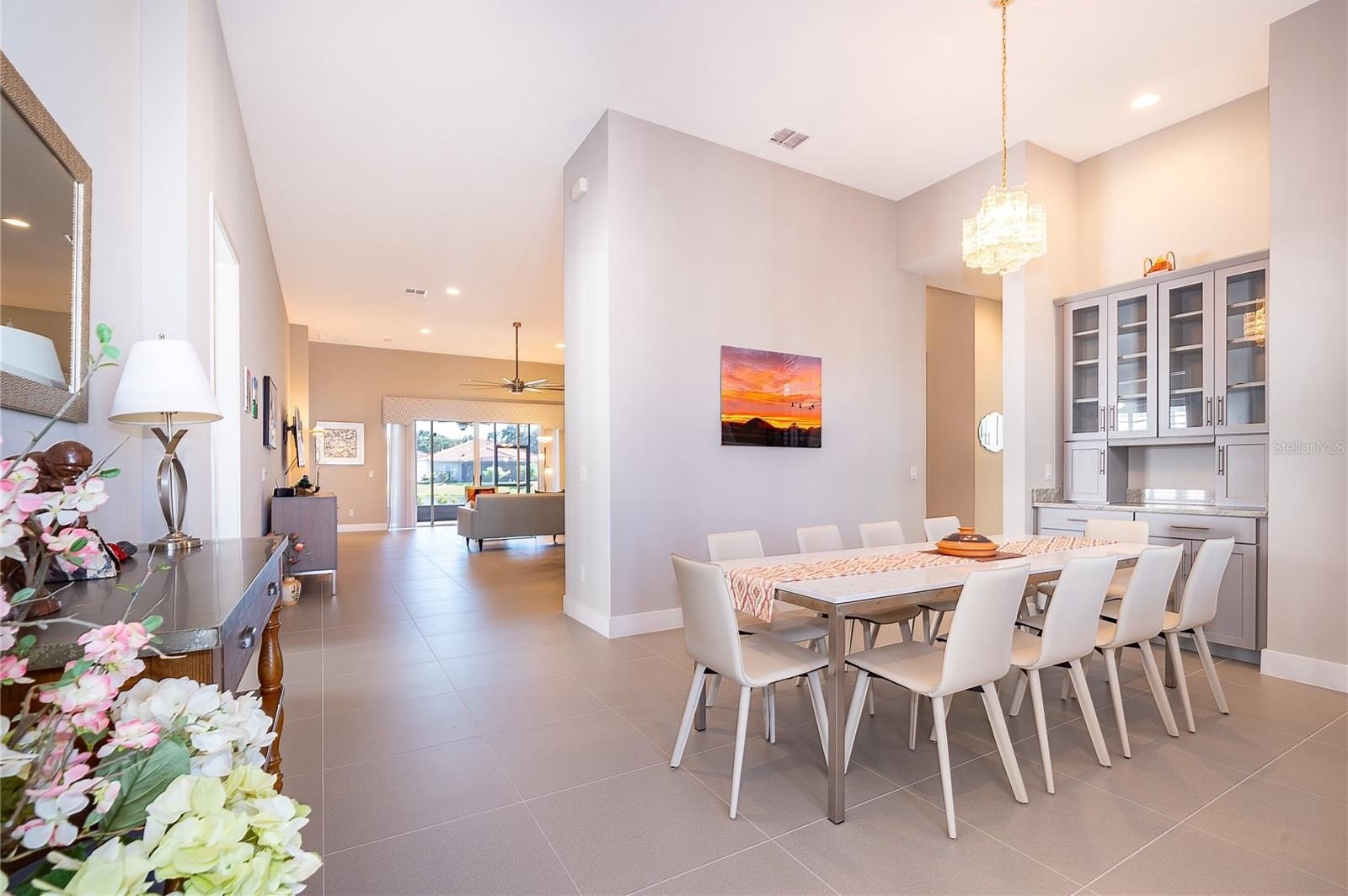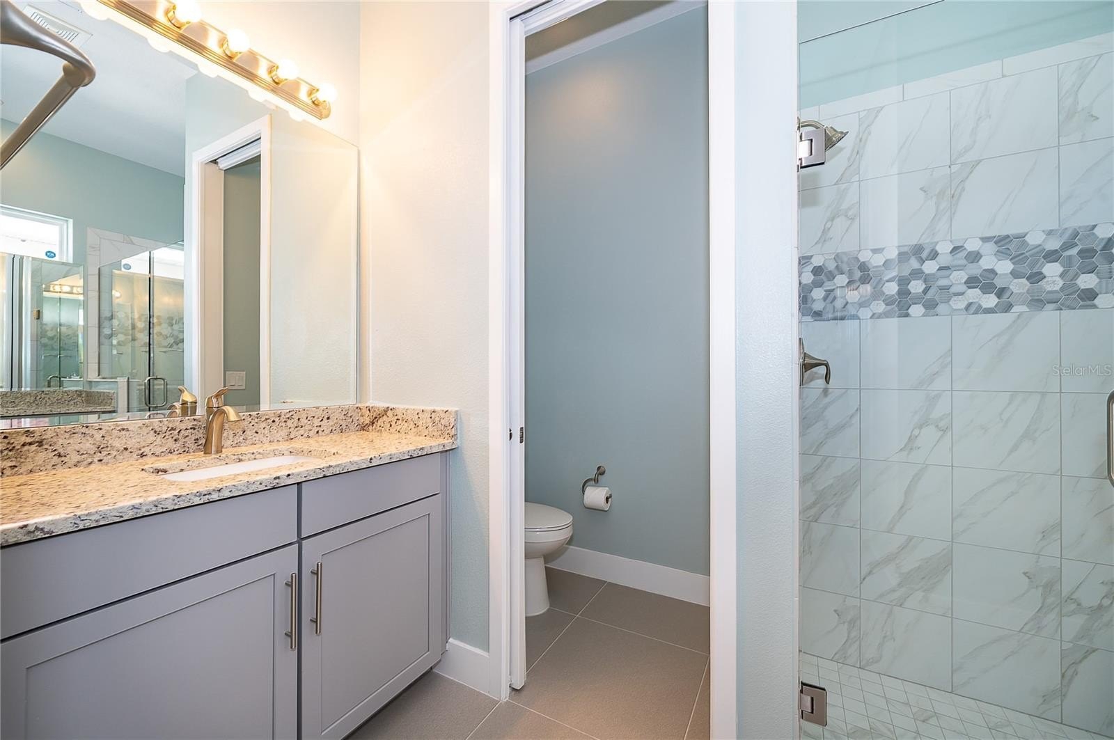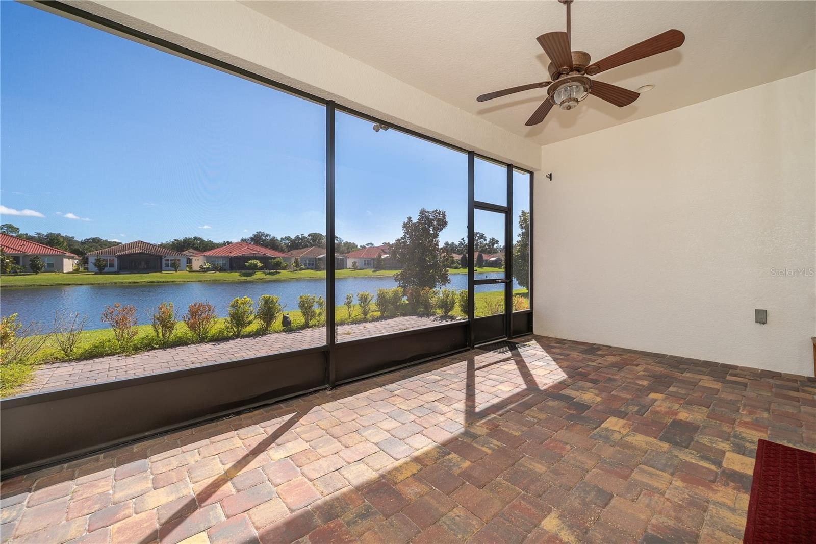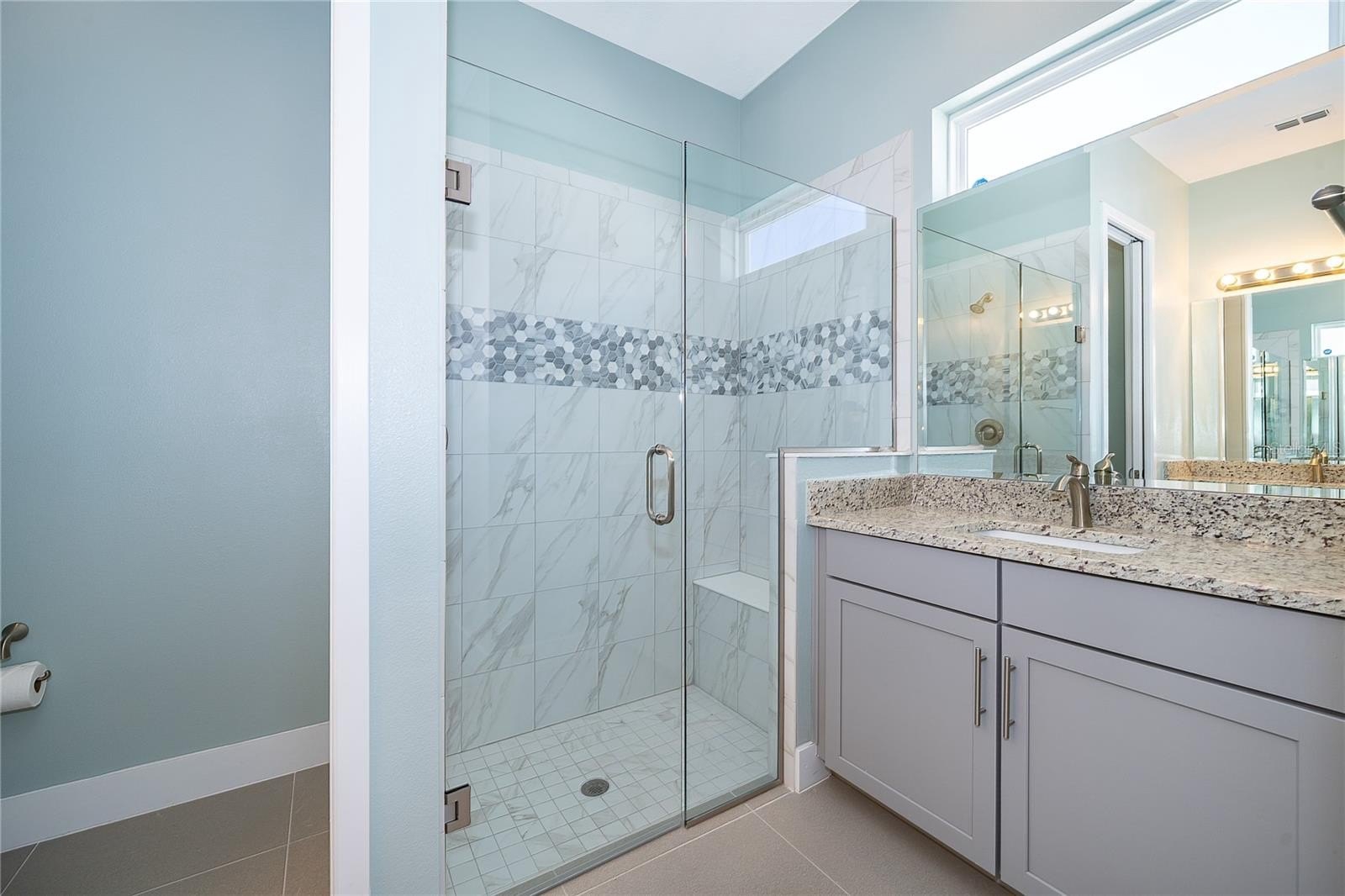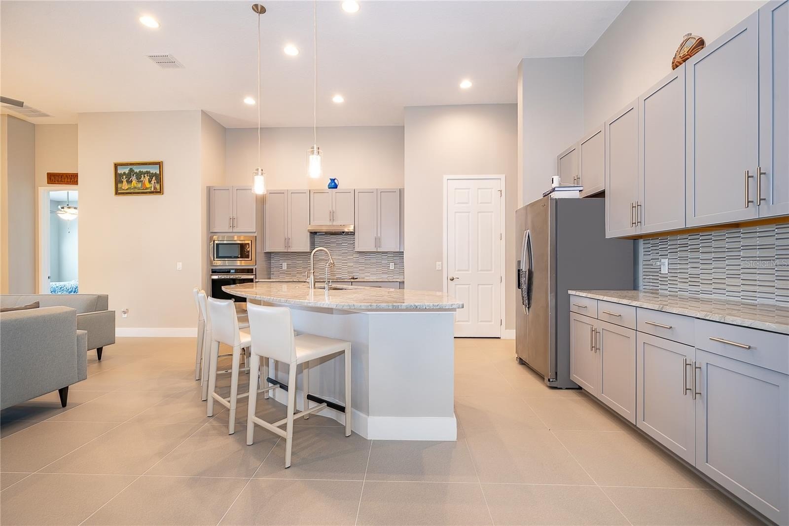 Location, Location, Location!!! You will not want to miss this outstanding opportunity to be an owner in this amazing 55+ Luxury Active Adult Gated Community of Serenity Reserve! This elegant one-story residence features 3 spacious bedrooms, each with its own private full bath and walk-in closet, plus a bonus room. With 3.5 baths and a two-car garage, every detail of this semi-custom luxury home has been thoughtfully designed for comfort and convenience. Enjoy the premium water and fountain view lot from the comfort of your open-concept living space, enhanced by 12-foot ceilings, 8-foot doorways, and 12’ pocket sliding lanai doors that flood the home with natural light. The home showcases porcelain tile in all wet areas, rich wood flooring in the primary bedrooms, and granite countertops throughout the gourmet kitchen and bathrooms. The kitchen has an oversized central prep island, modish backsplash, 42” cabinets, and stainless steel Whirlpool appliances. Additional upgrades include:-Two master suites with custom closets, Wider paver driveway, Utility sink in the laundry room, Custom shades, Whole-home water purification system.