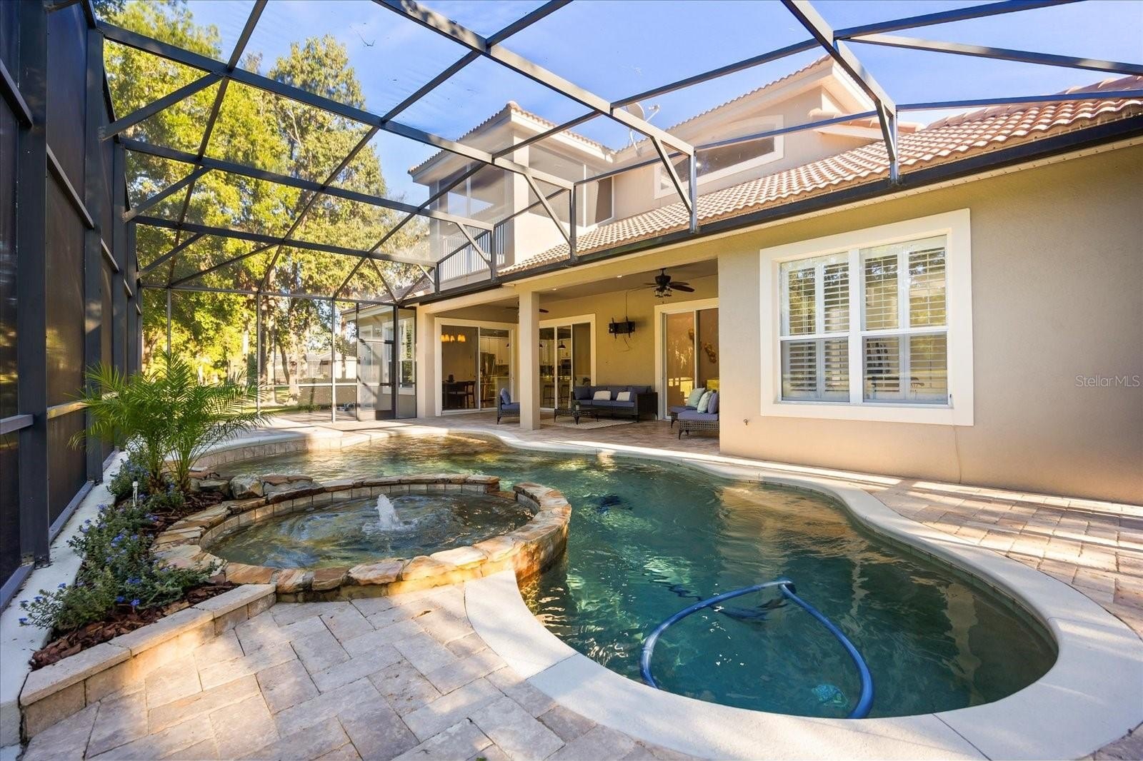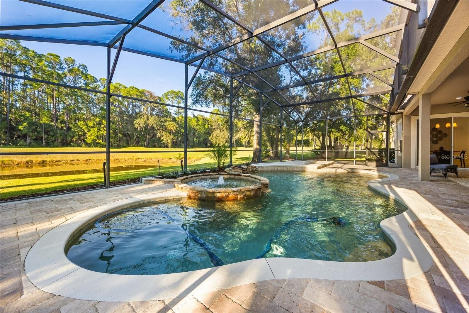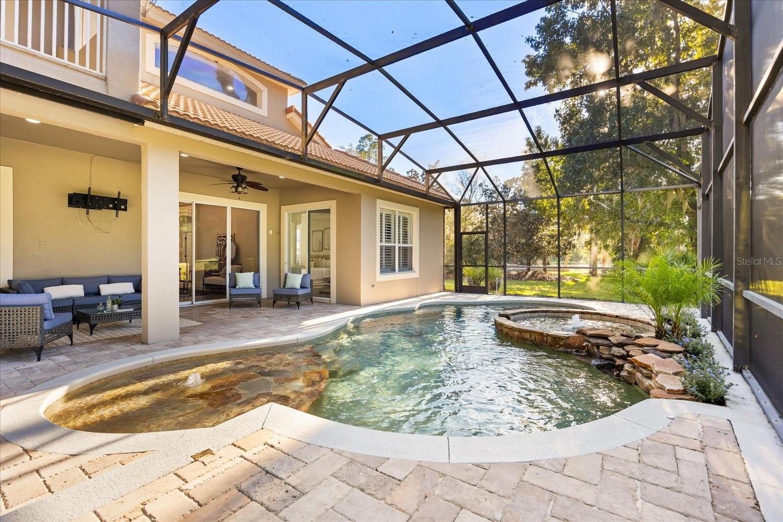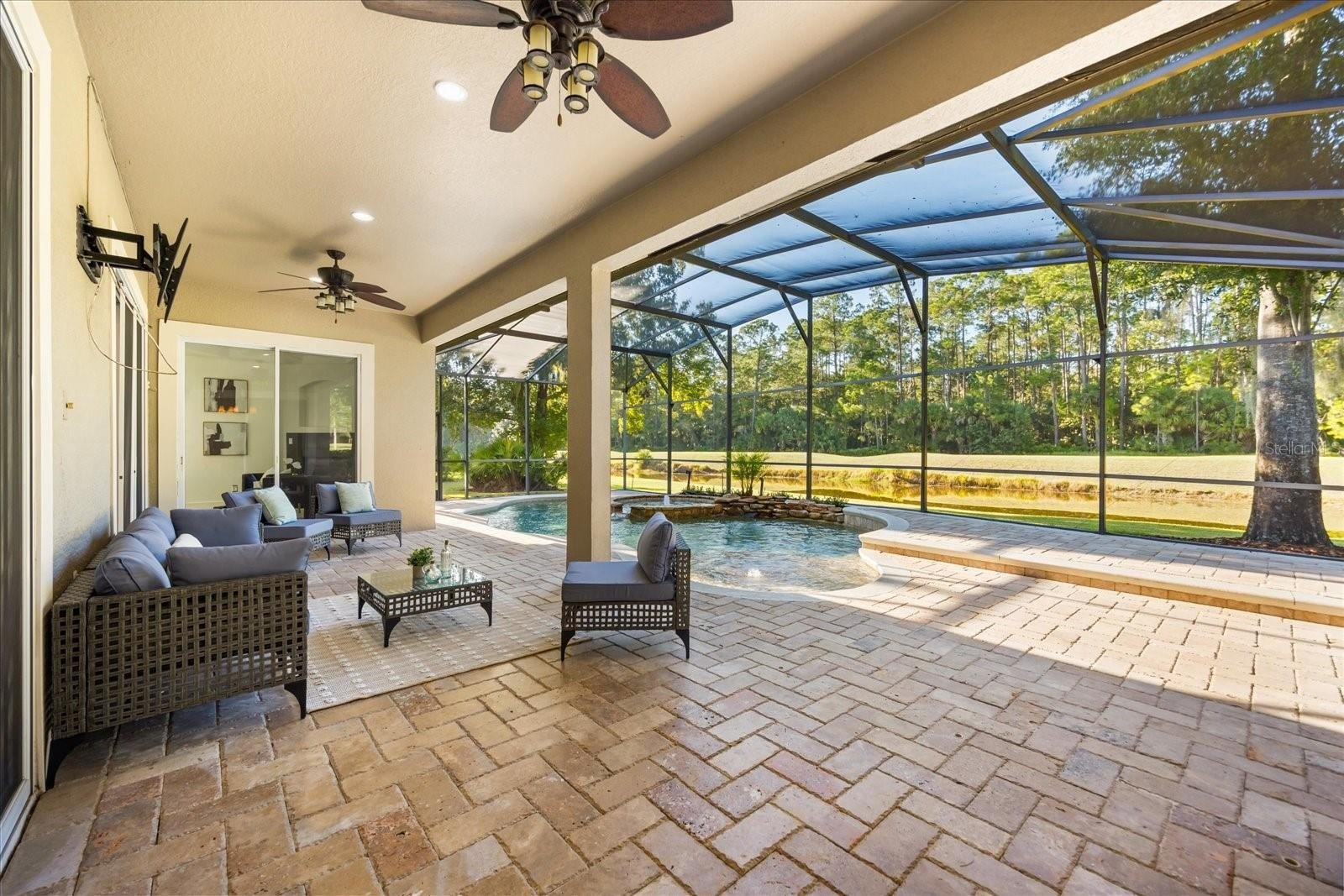 Outside, a screened-in pool and covered patio create a private outdoor oasis perfect for relaxing or hosting gatherings. The three-car garage provides ample space for vehicles, storage, or even a workshop.