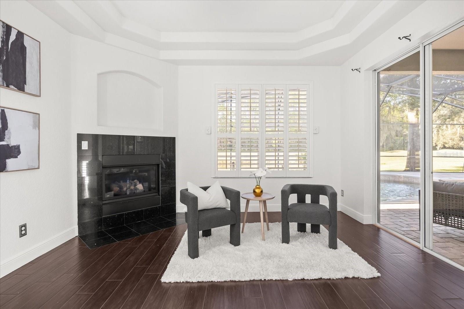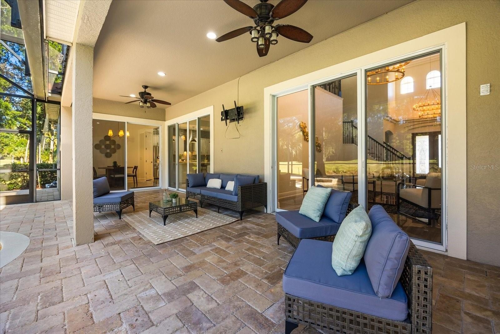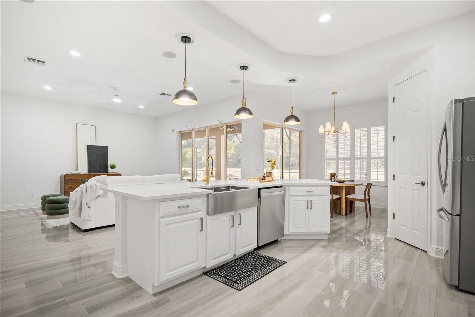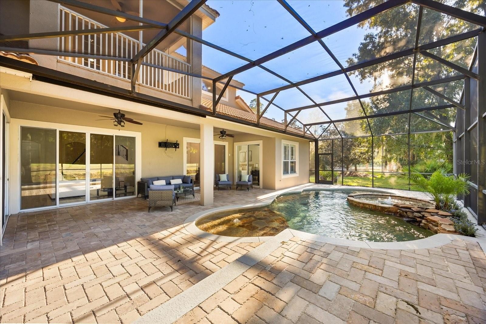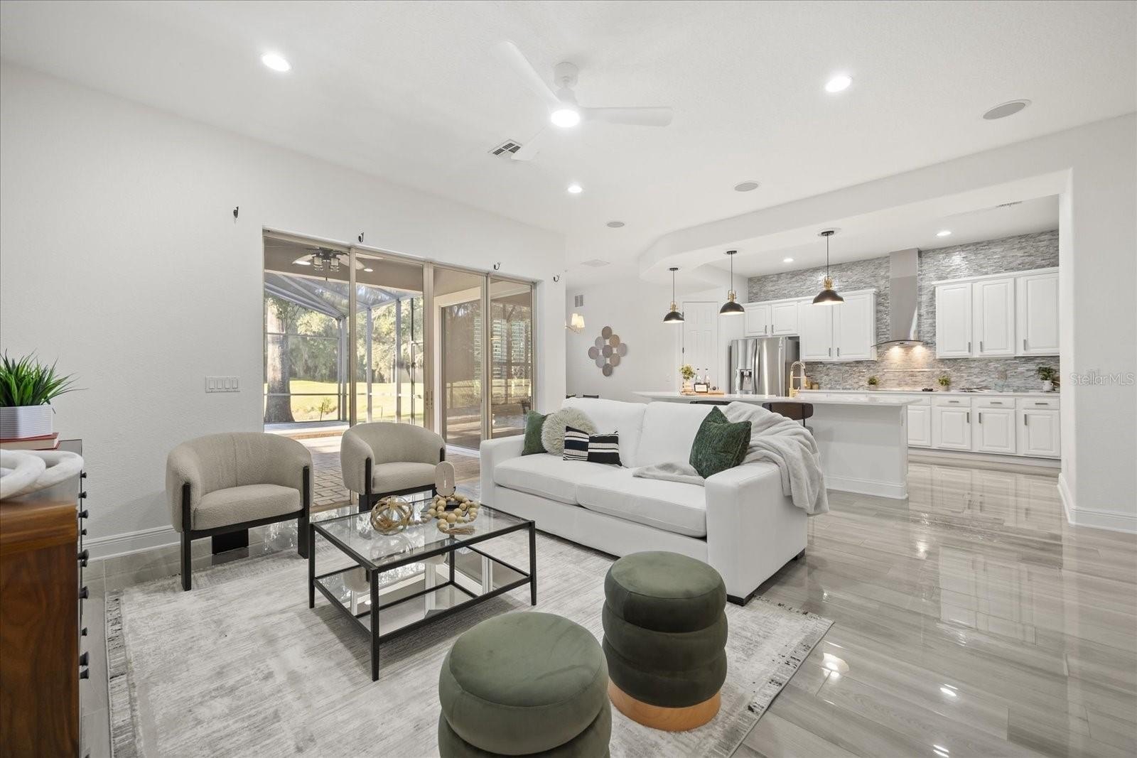 Outside, a screened-in pool and covered patio create a private outdoor oasis perfect for relaxing or hosting gatherings. The three-car garage provides ample space for vehicles, storage, or even a workshop.