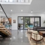 modern path to the grand, pivot door. Inside, polished concrete floors seamlessly give a clean,